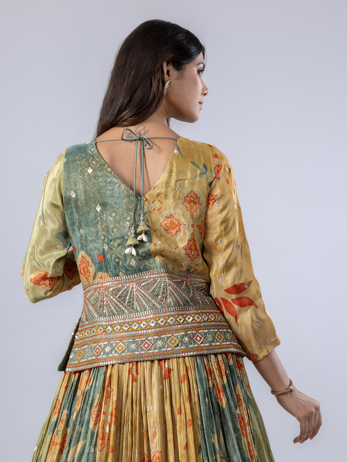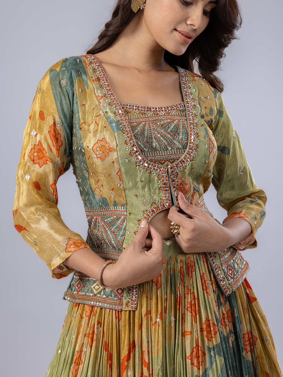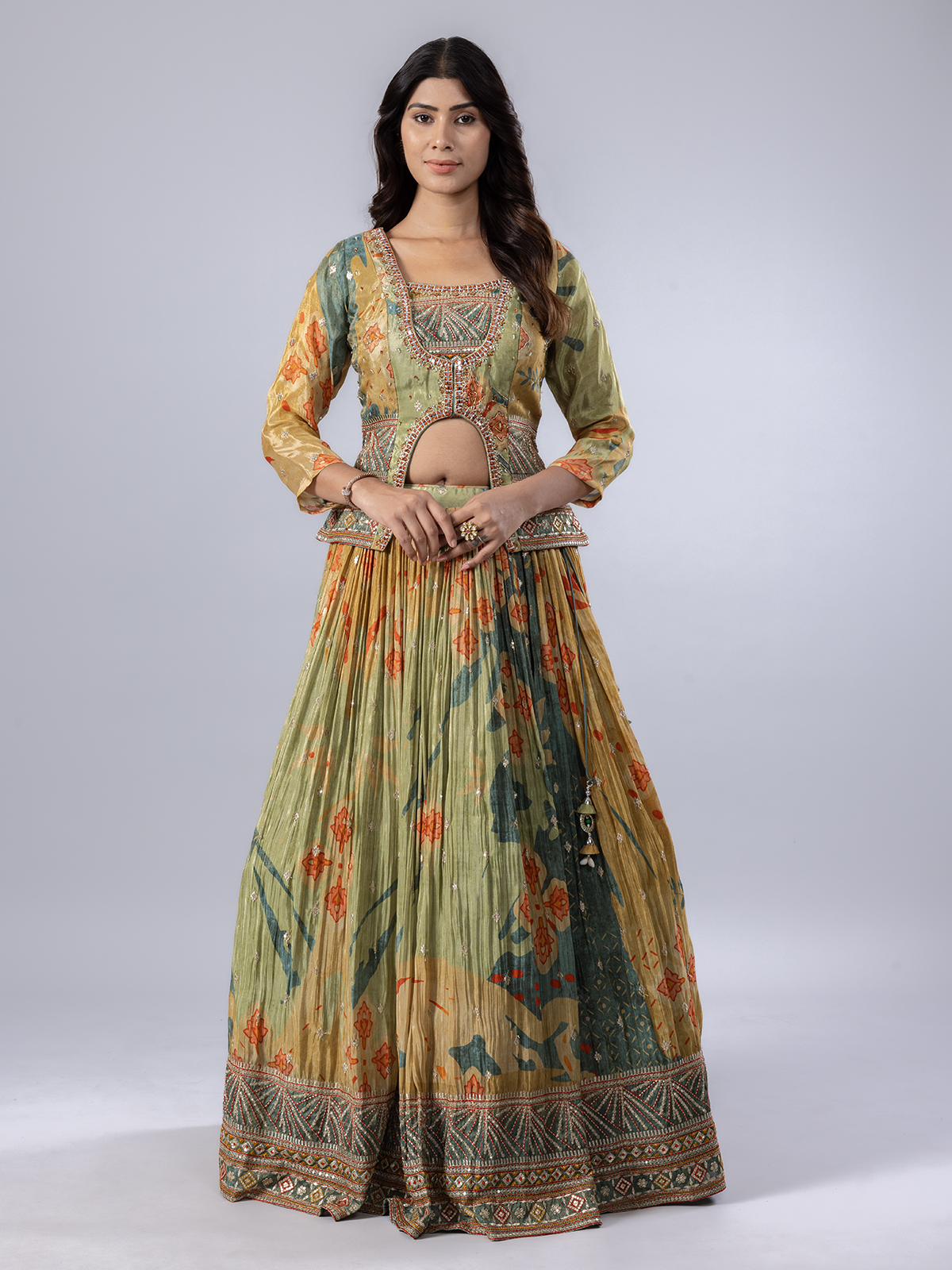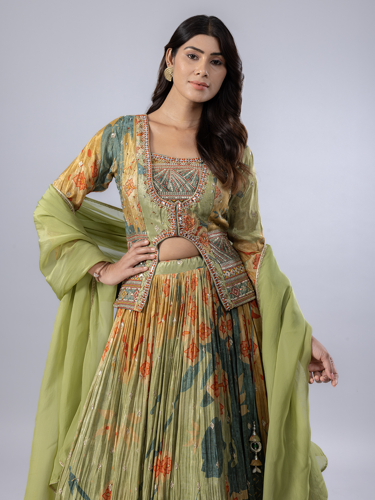 In flowing silk fabric and a refreshing pista green shade, this lehenga choli captivates with exquisite aabla, beads, sequins, zardosi, and resham embroidery. A complementing dupatta completes the ensemble, making it an ideal pick for weddings, mehendi, and other special celebrations.