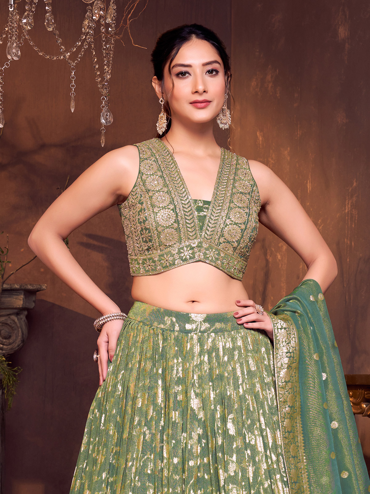 Pista Green Silk V Neck Zari Detailed Lehenga Choli
