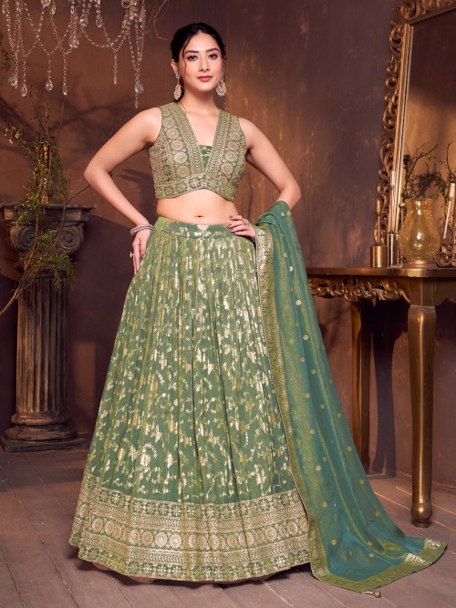 This pista green silk lehenga choli features elegant embroidery, sequins, zari, and stone work. Its V neckline and sleeveless cut bring a refined, polished feel. Paired with a dupatta, it offers serene festive beauty for wedding and reception occasions.