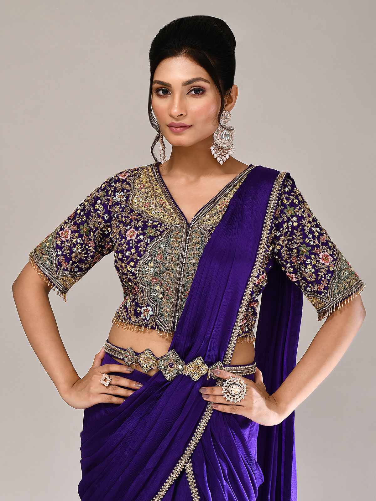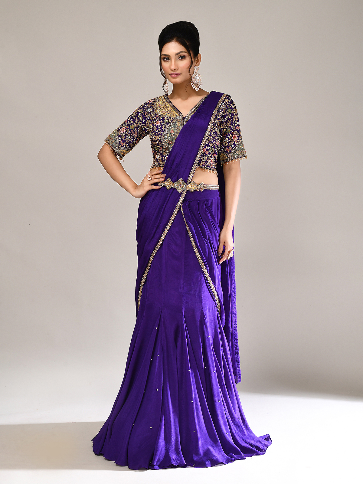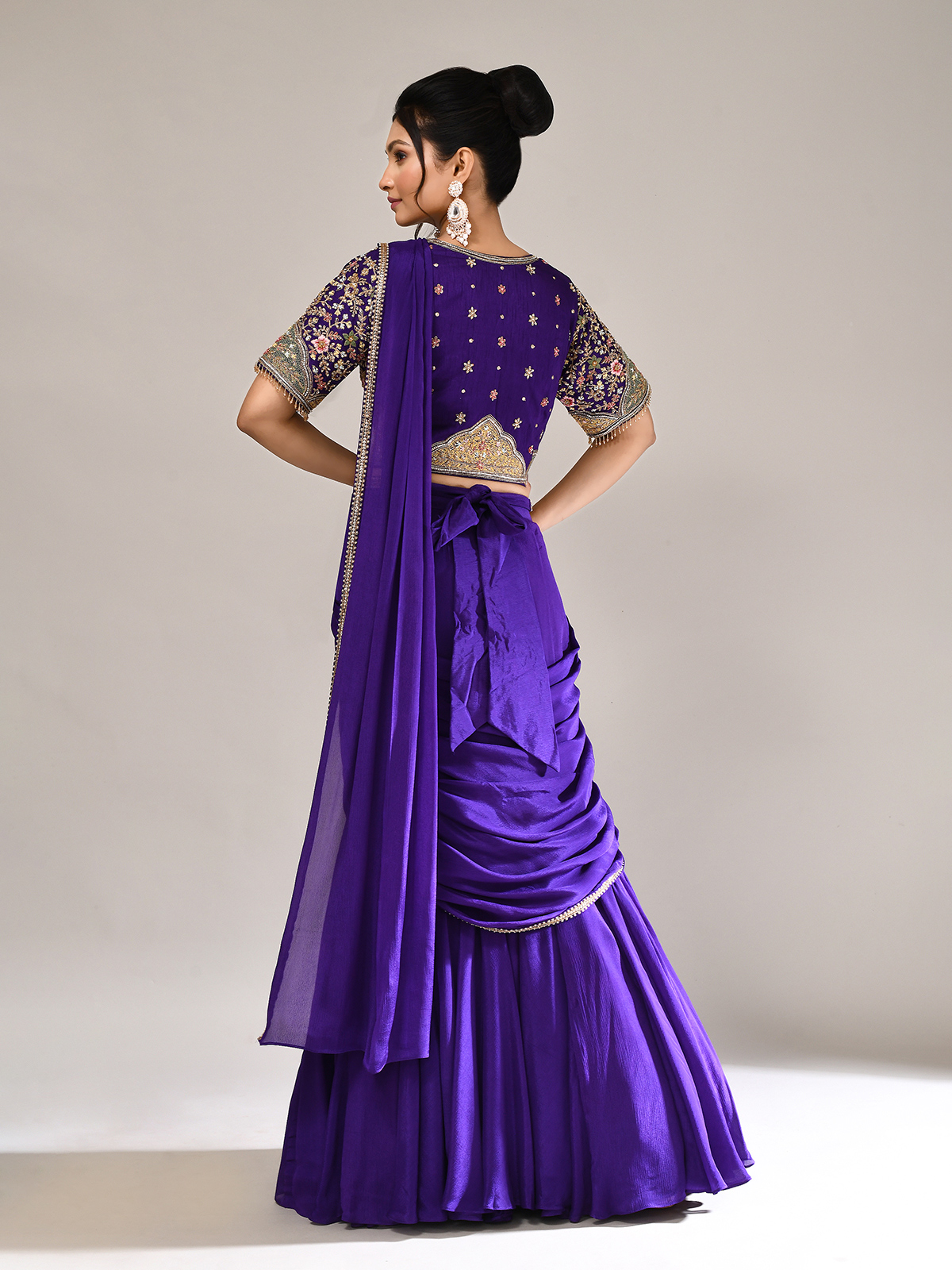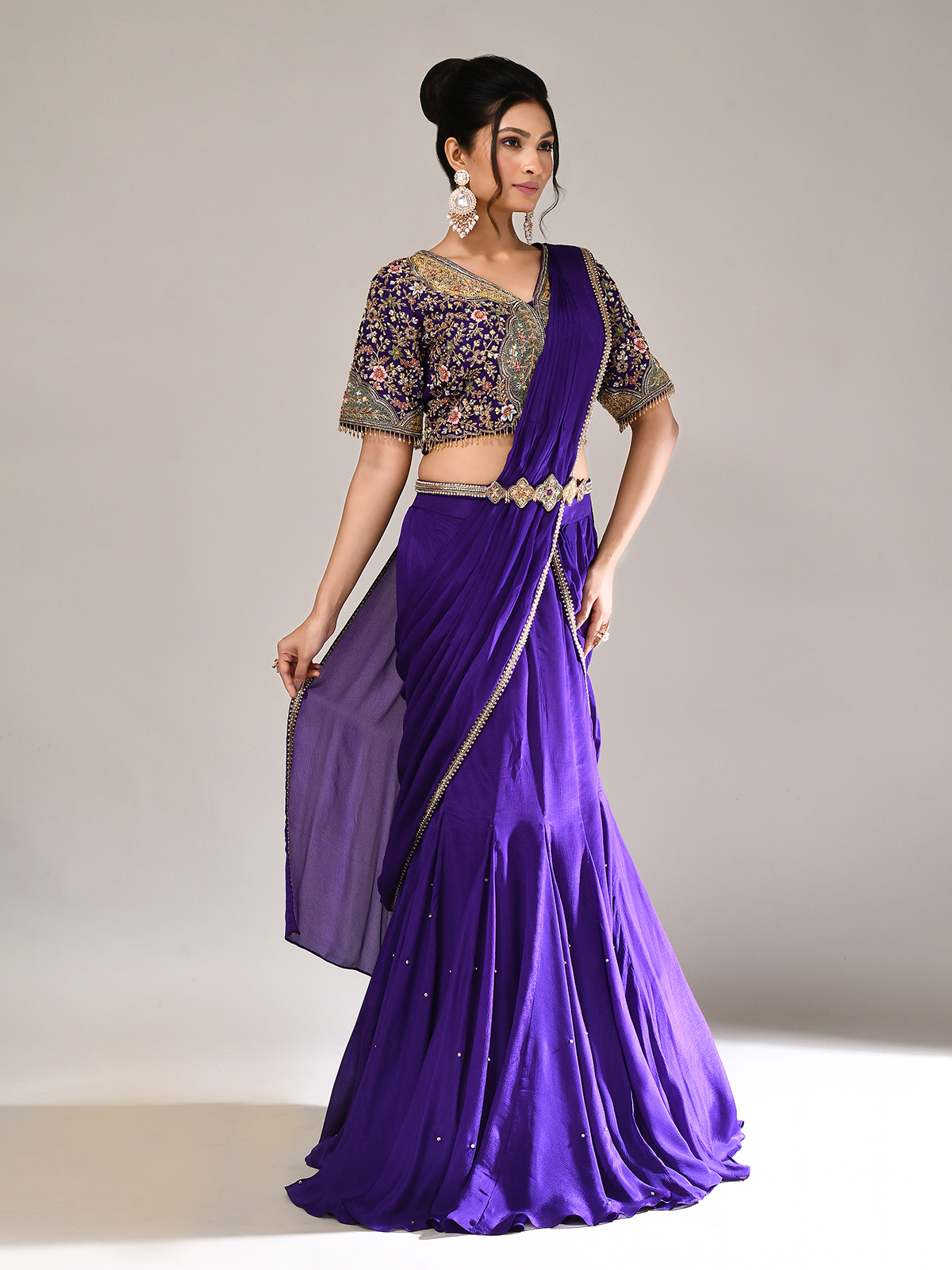 Turn wedding moments into elegance with this purple chiffon georgette lehenga choli. Styled with a V-neckline, elbow sleeves, and attached dupatta, it sparkles with sequins, mirror, cutdana, pearls, beads, zardosi, and thread, reflecting timeless artistry and festive opulence.