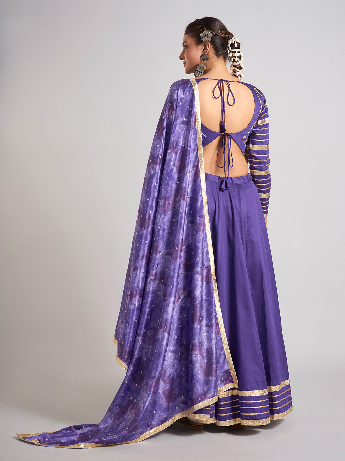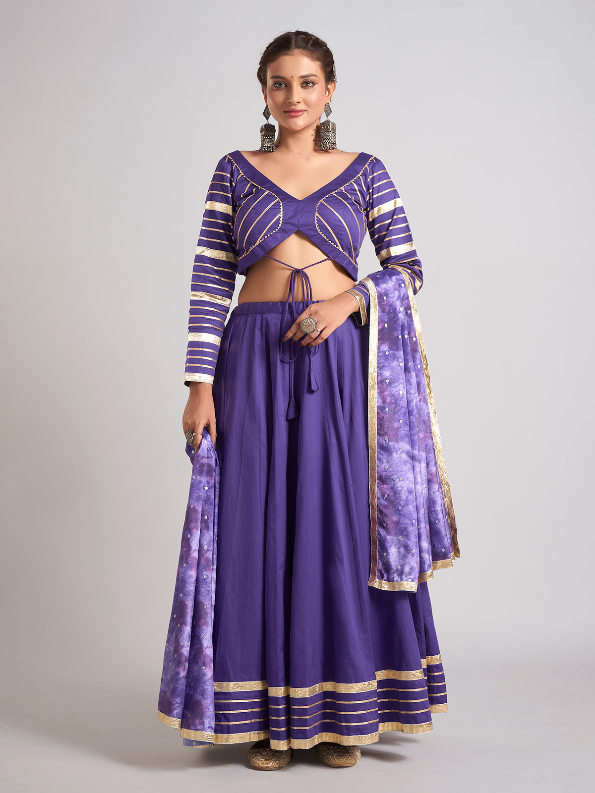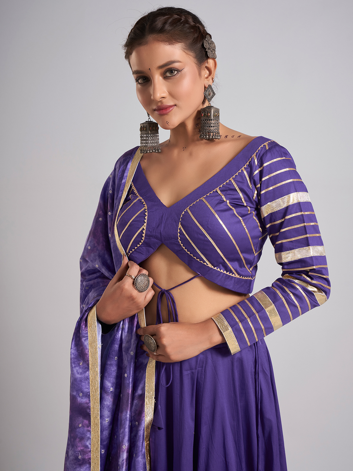 Richly adorned with gota work, this purple silk chaniya choli features a V neckline and full sleeves. With a coordinating dupatta, it's the perfect traditional ensemble for Navratri festivities.