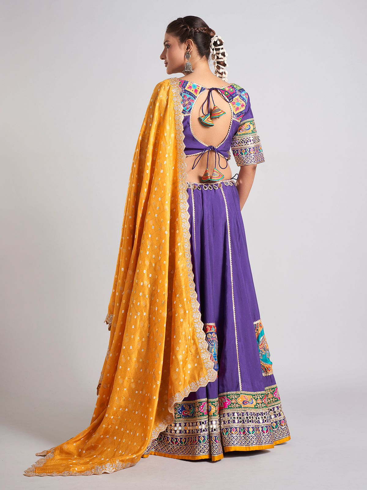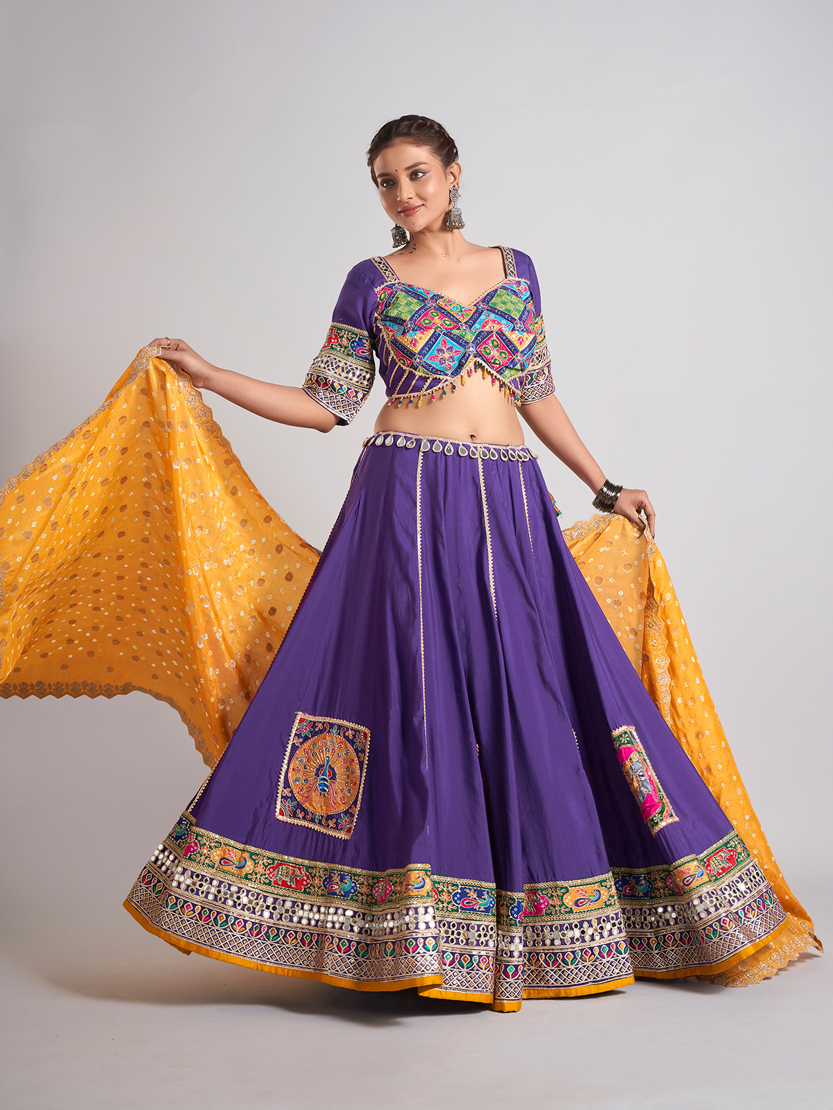 Step into the festivities with this purple silk chaniya choli showcasing mirror, resham, sequins, gota and patch detailing. The sweetheart neckline and elbow sleeves create a charming silhouette. Paired with a dupatta, it brings a radiant touch to navratri celebrations and traditional evenings.