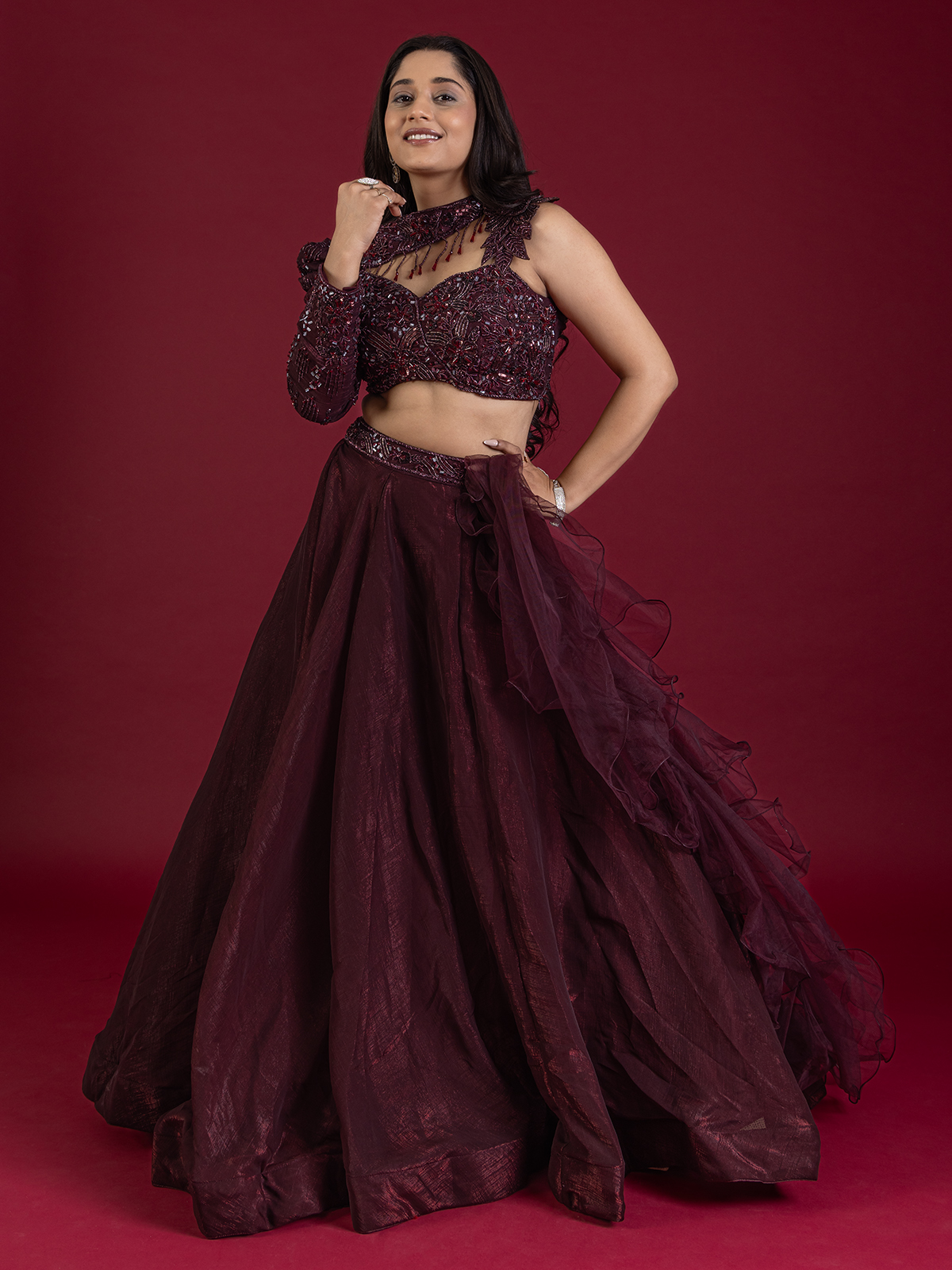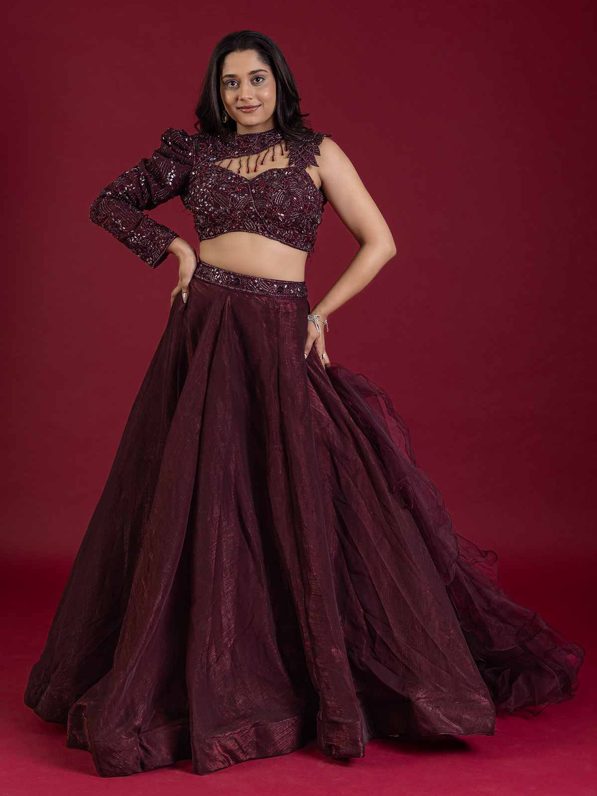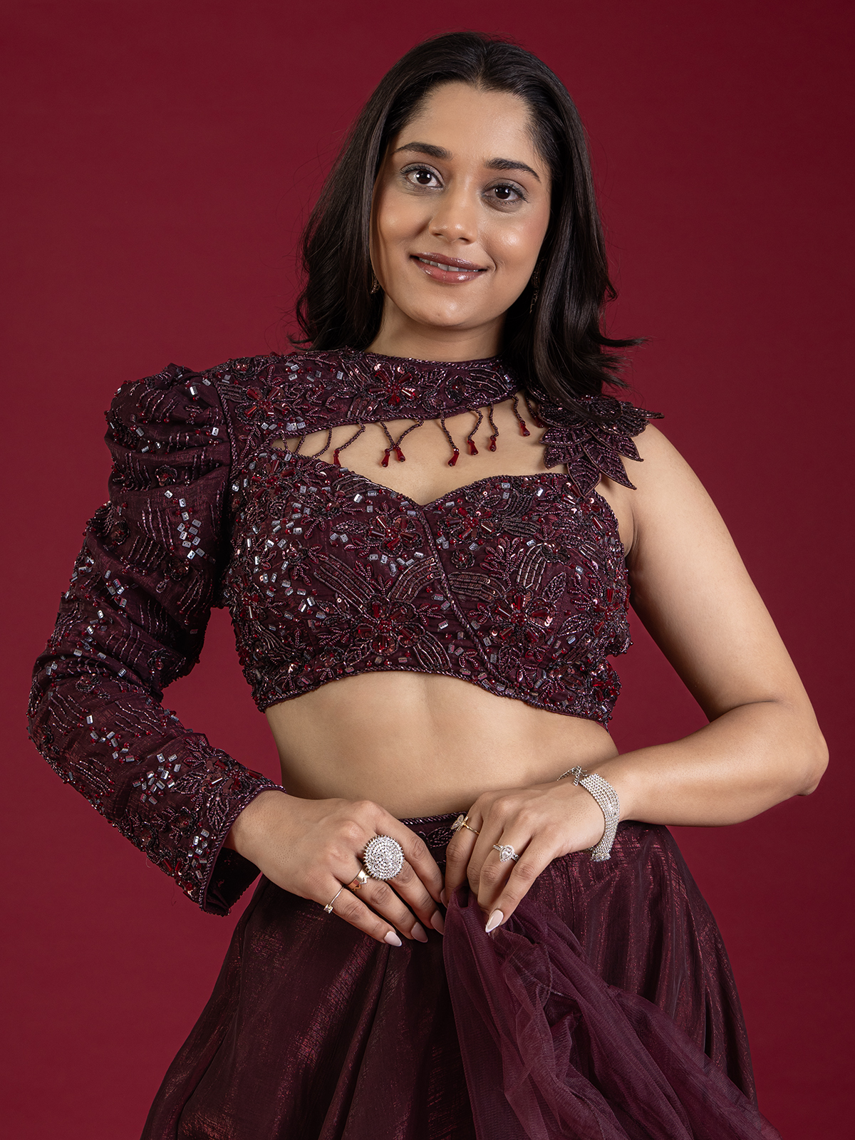 Bathed in a regal purple hue, this silk masterpiece glows with sequins, beads, cutdana, and diamond artistry. Designed for weddings and receptions, its opulent embellishments shimmer with timeless charm. A celebration of grace, it reflects a luxurious balance of festive brilliance and refined tradition, ideal for unforgettable evenings.