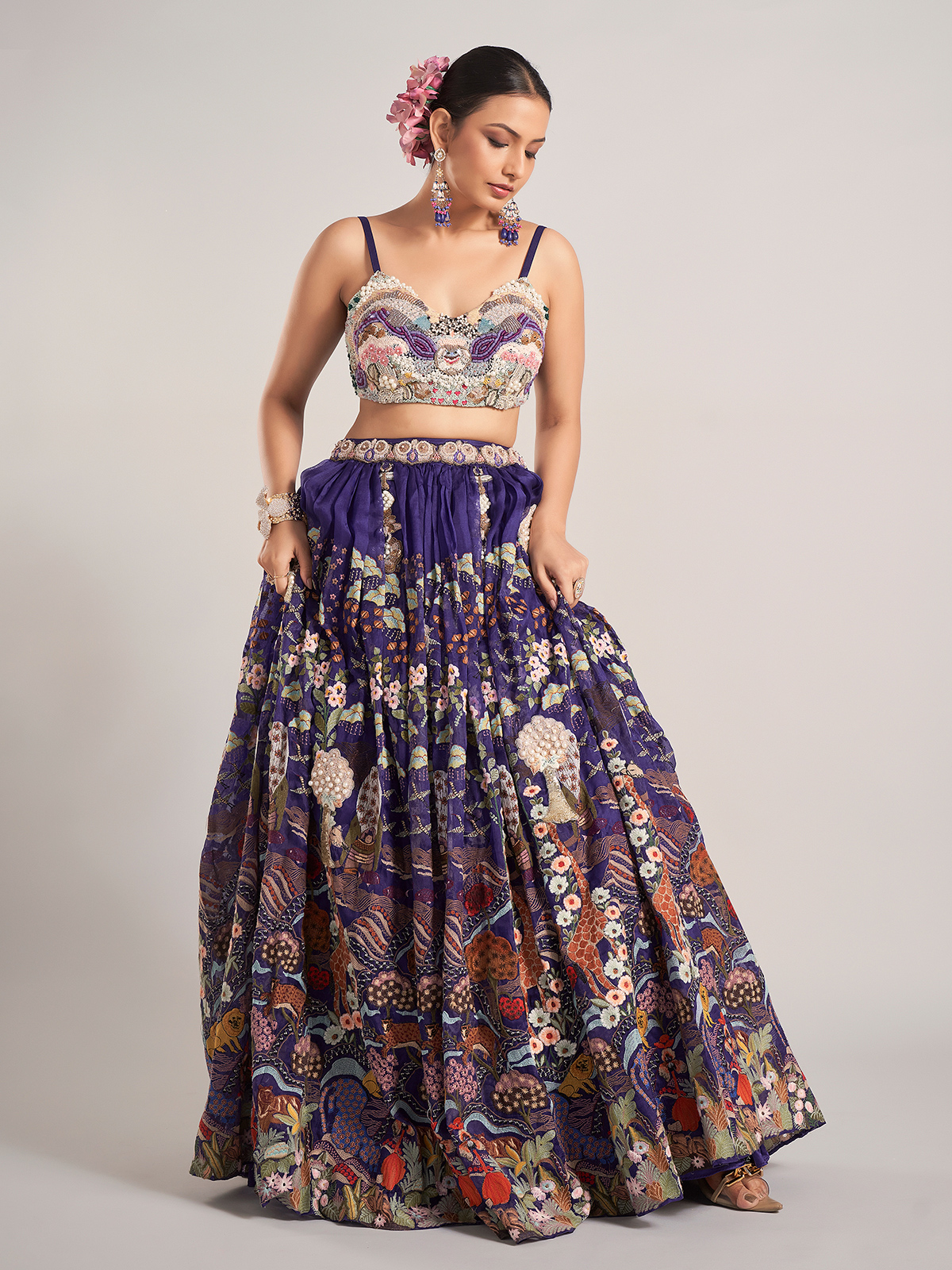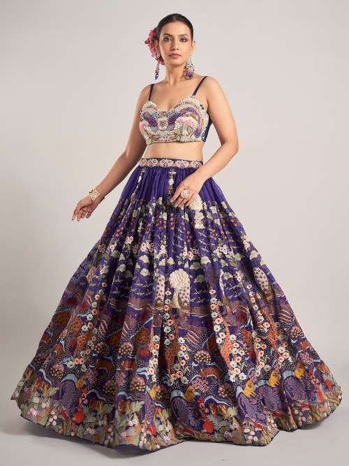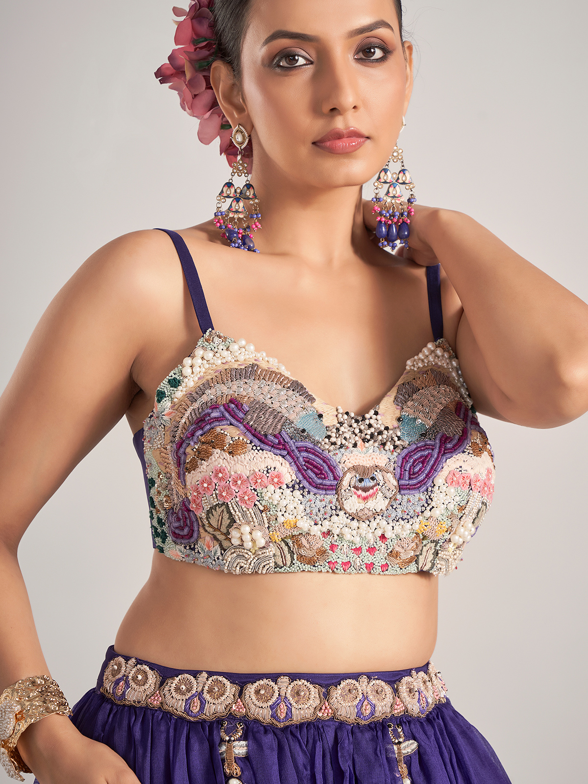 Grace special occasions with this purple organza lehenga choli, lavishly detailed with pearls, thread, sequins, embroidery, zardosi, and beads. Featuring a sweetheart neckline and sleeveless cut, it pairs with a dupatta for weddings or receptions.