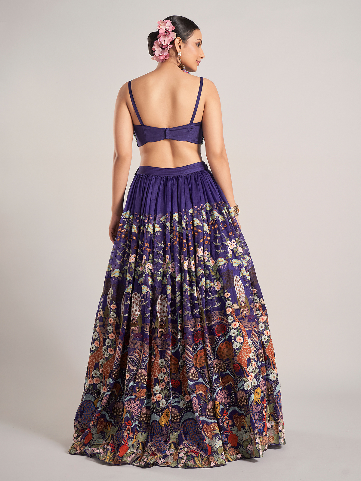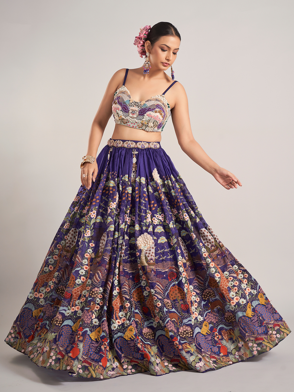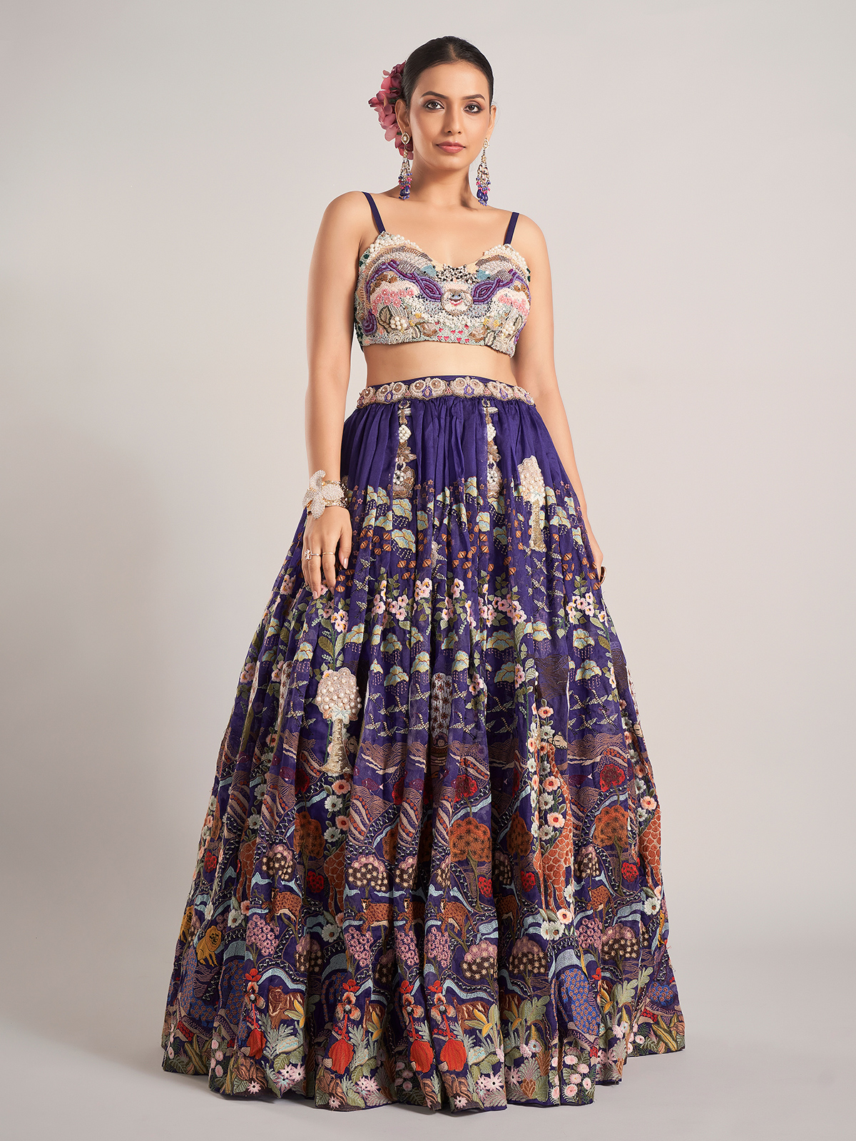 Grace special occasions with this purple organza lehenga choli, lavishly detailed with pearls, thread, sequins, embroidery, zardosi, and beads. Featuring a sweetheart neckline and sleeveless cut, it pairs with a dupatta for weddings or receptions.