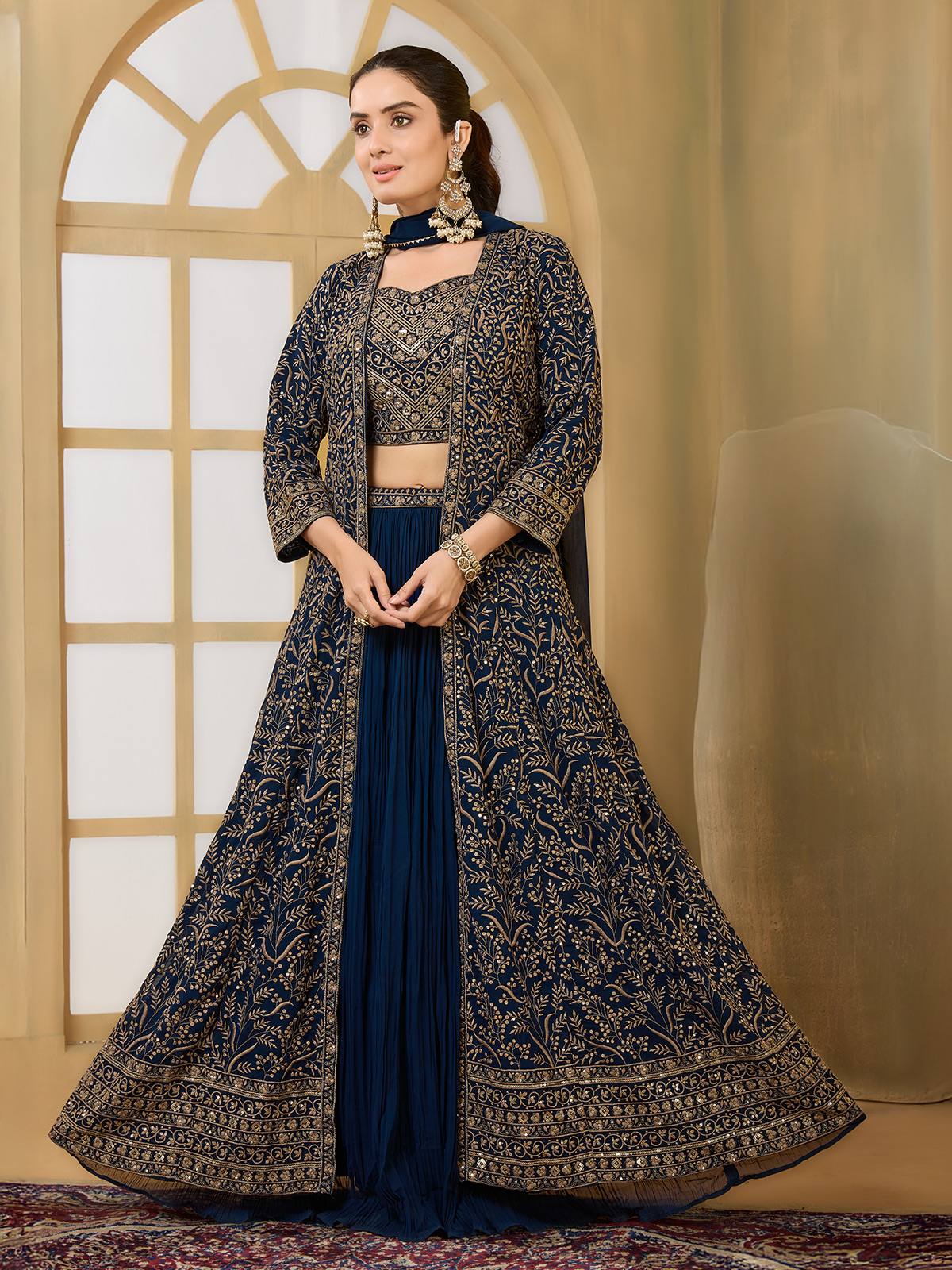 This rama blue georgette lehenga choli showcases a sophisticated long jacket-style design accentuated with delicate embroidery and soft sequin highlights. Paired with a complementing dupatta, the Pakistani-inspired ensemble exudes timeless charm, making it an ideal choice for weddings, sangeet functions, and receptions.
