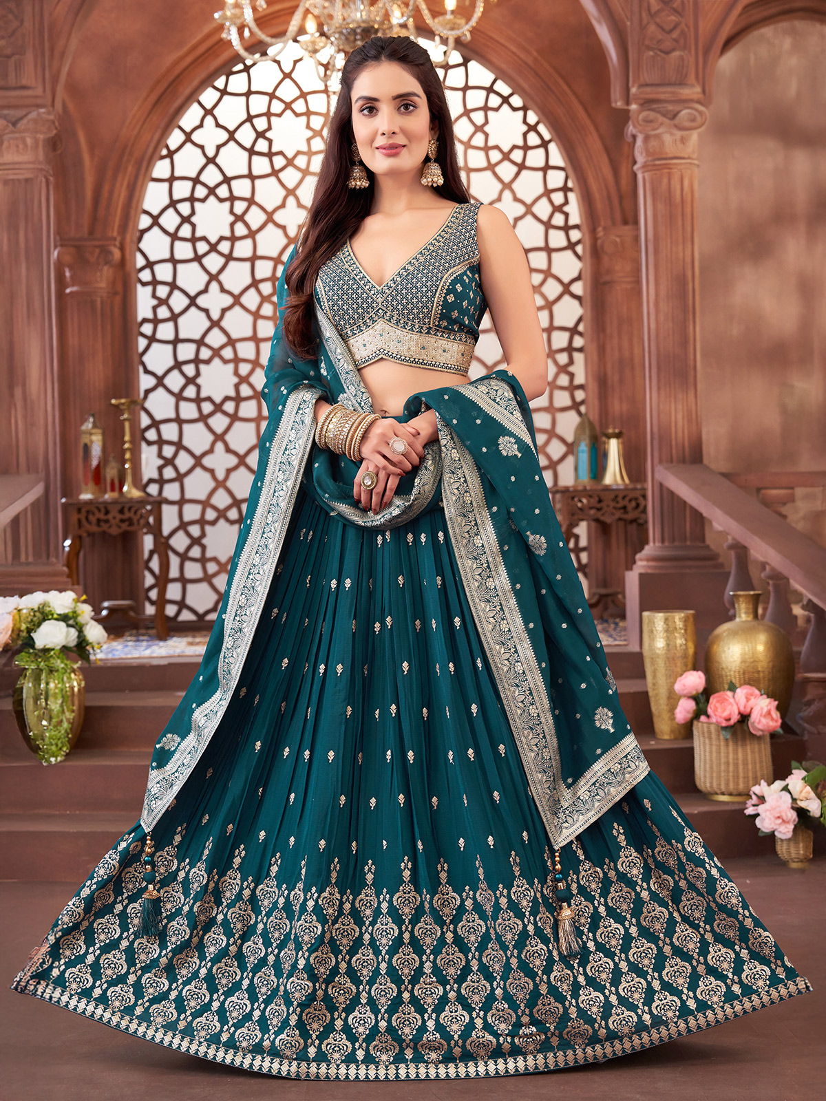 This rama green georgette lehenga features embroidery, sequins, cutdana, and stone embellishments. With a V neckline and sleeveless silhouette, it exudes modern festive elegance. Paired with a dupatta, it’s perfect for wedding and reception ceremonies.