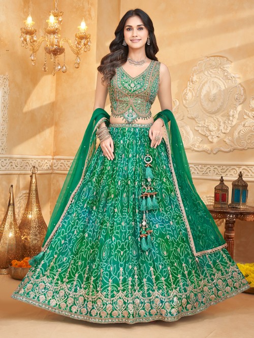 Rama Green Silk Bandhej Dupatta Heavy Work Lehenga Choli
