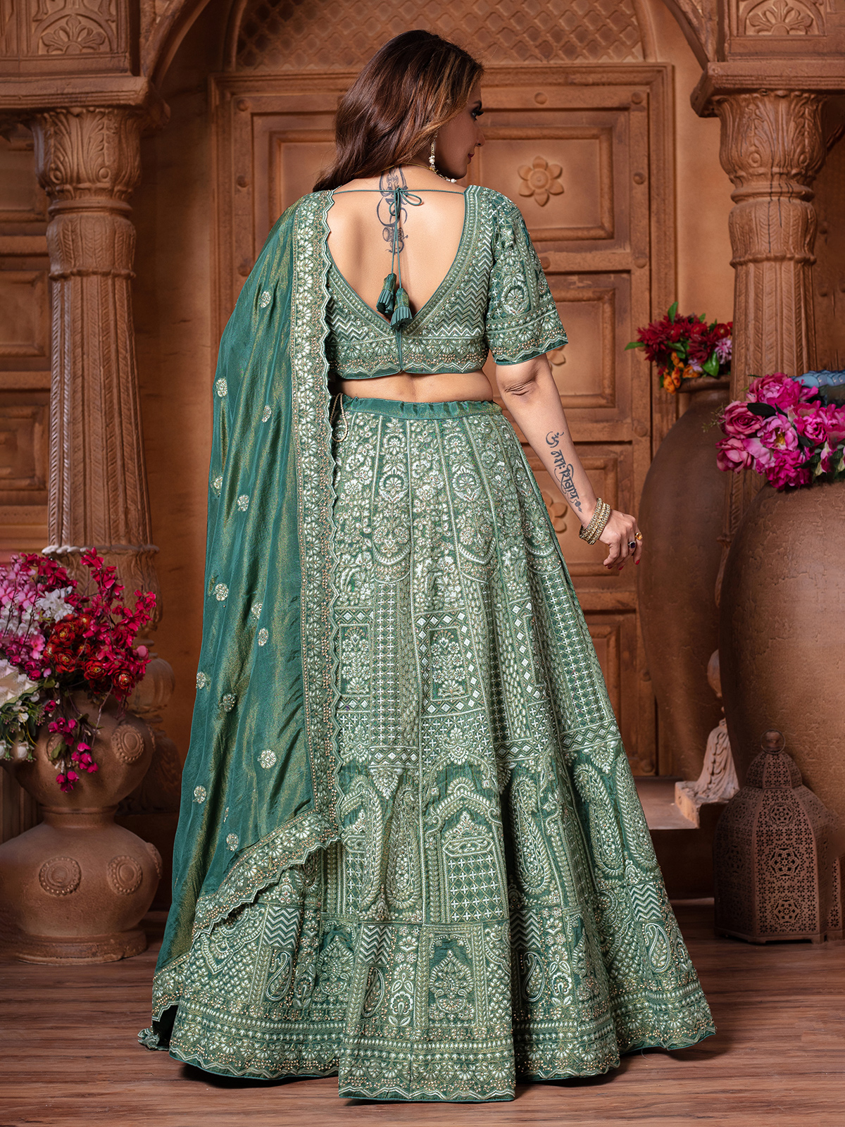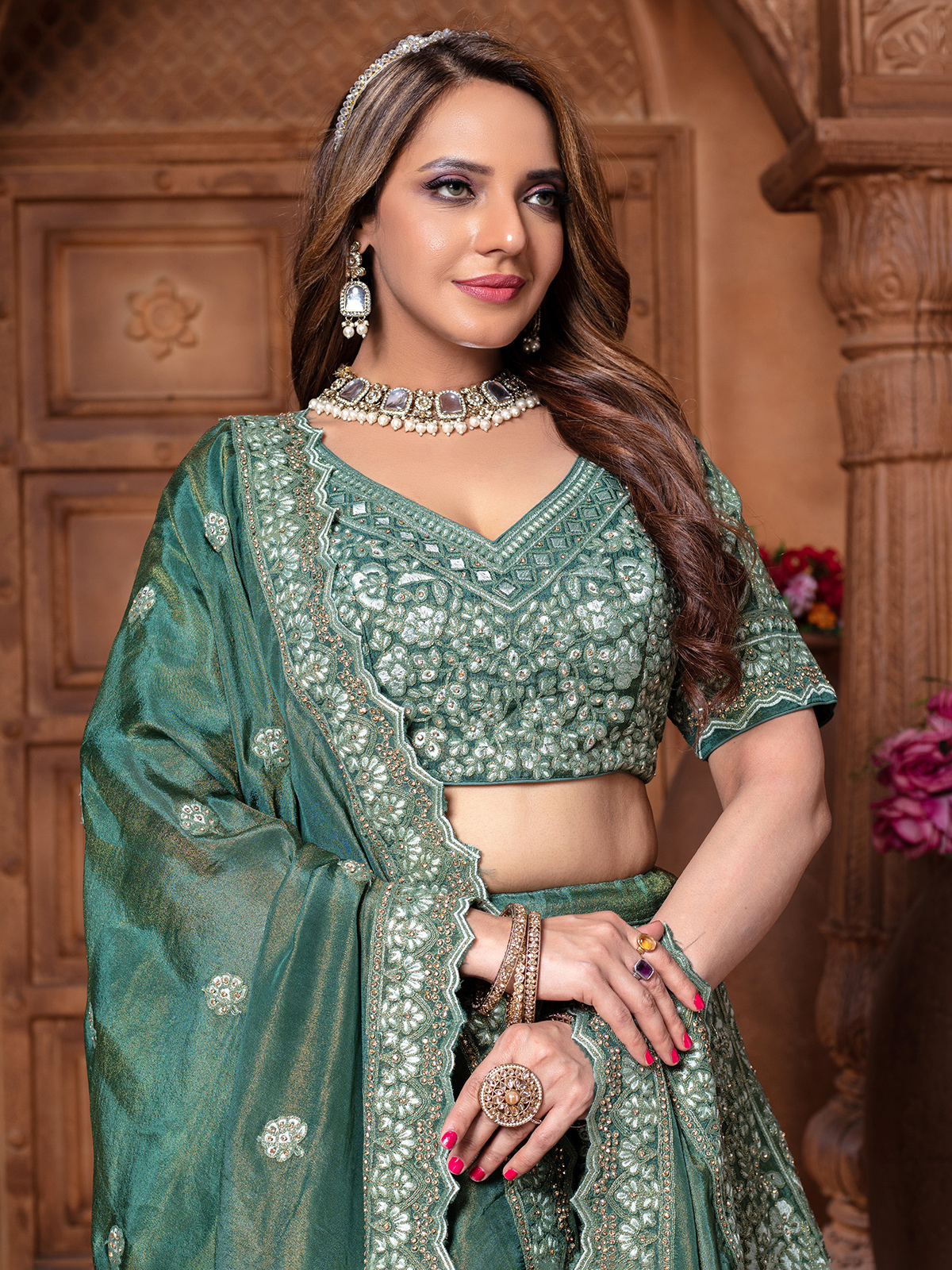 Rama green tissue silk lehenga choli adorned with embroidery, thread work, and sparkling diamond embellishments. Featuring a V neckline, half sleeves, and paired with a dupatta, it is ideal for bridal celebrations and receptions.