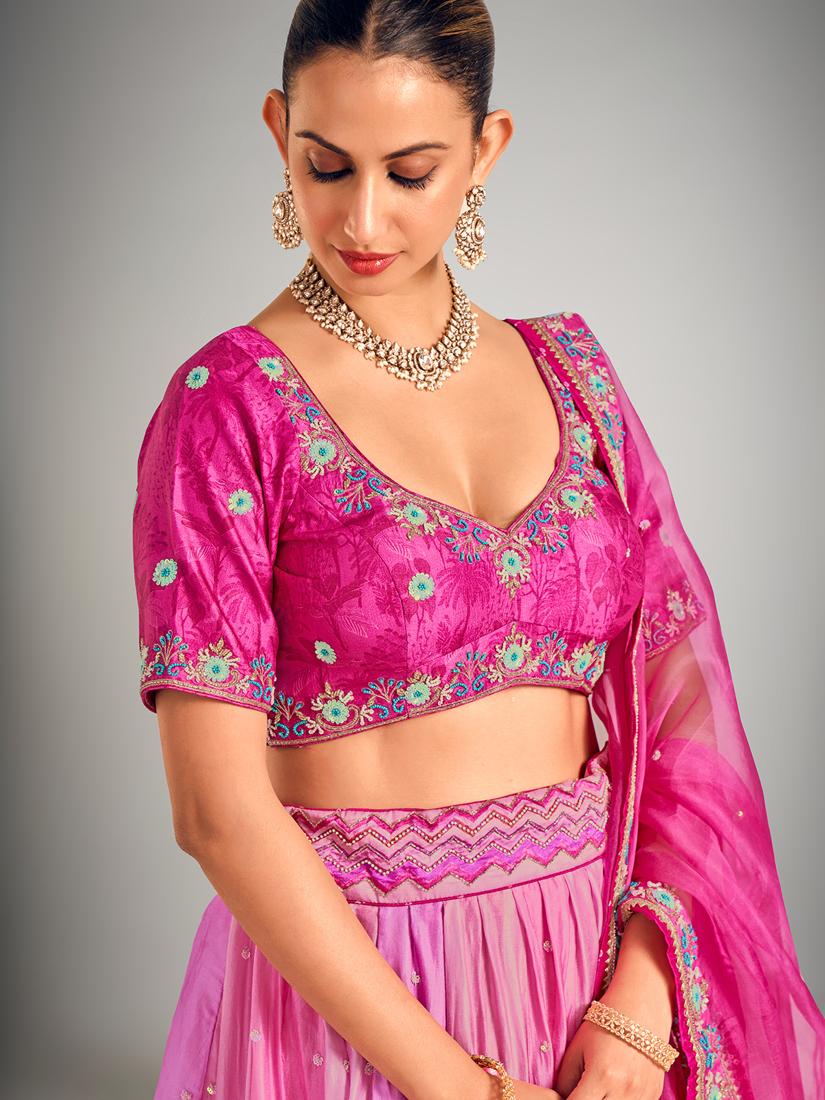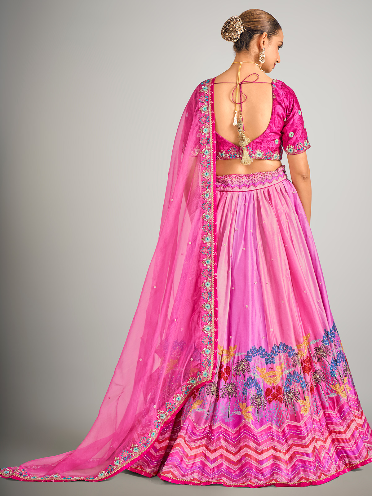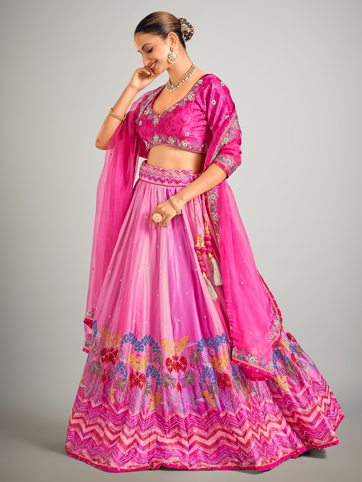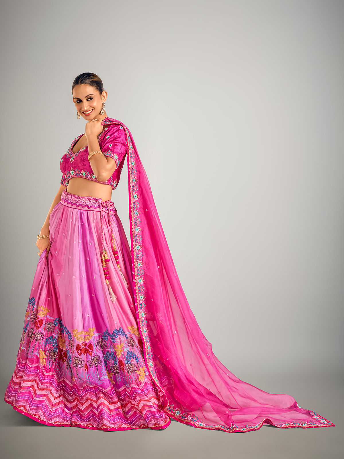 A must-have, this seductive rani-colored silk lehenga choli is the ideal combination of elegance and sophistication. enhanced with resham work, cutdana, gota, beads, and sequins. Includes a dupatta.