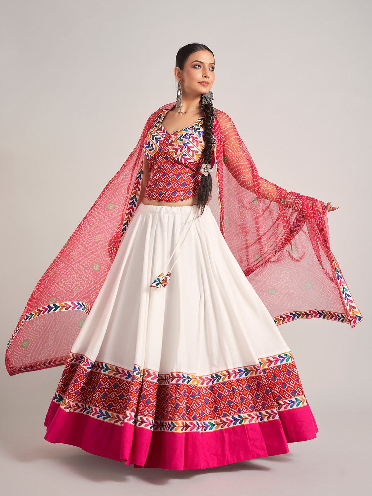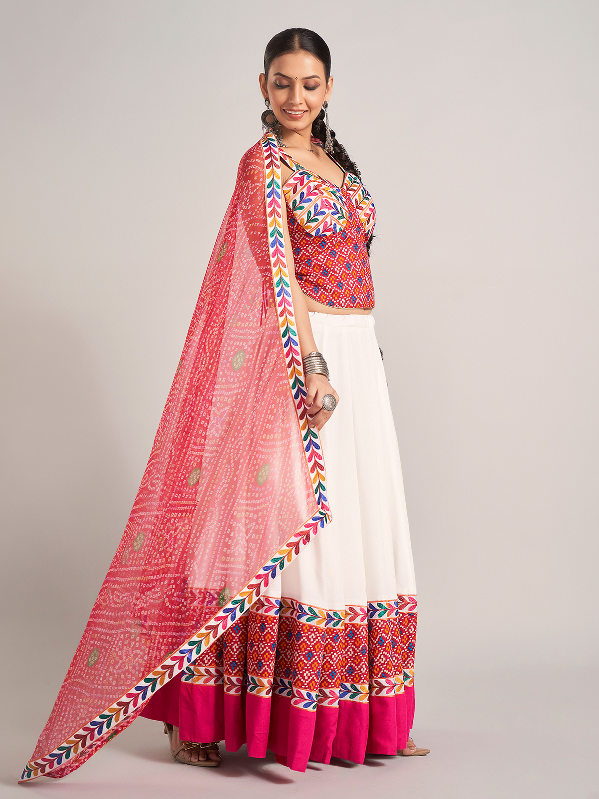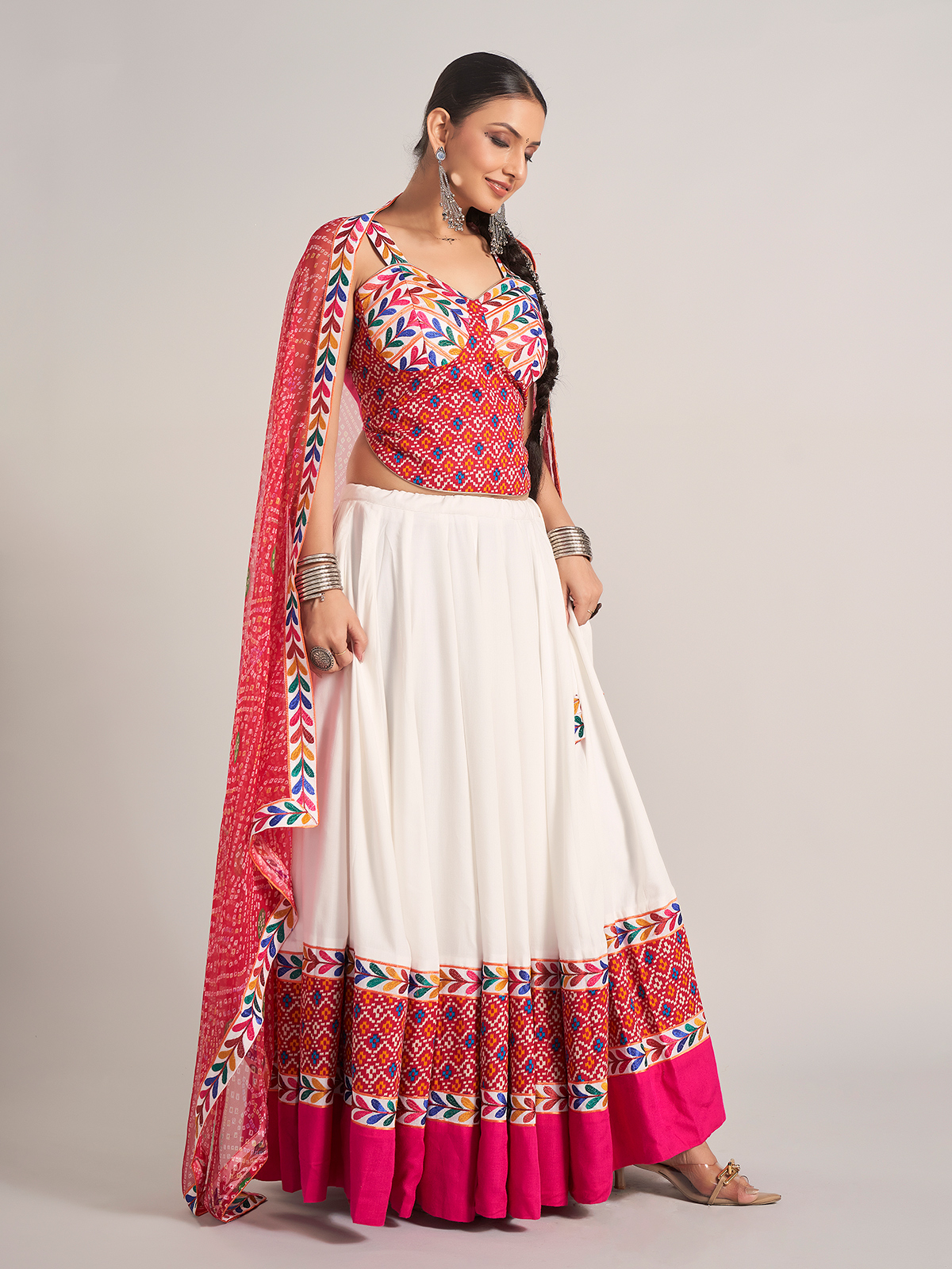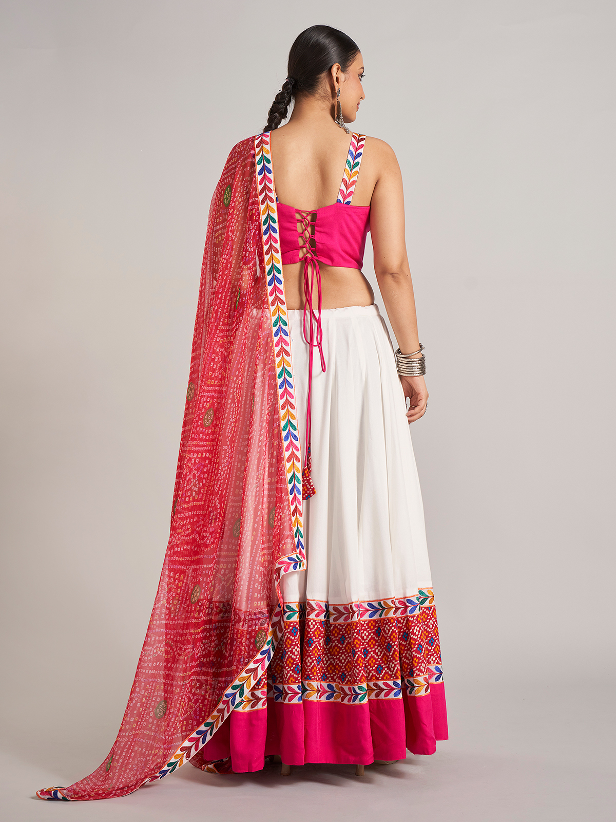 Brighten your Navratri wardrobe with this white and rani pink bandhej printed silk chaniya choli. Embroidered to perfection, it features a sweetheart neckline, sleeveless silhouette, and a complementing dupatta—an ensemble of grace and joy.