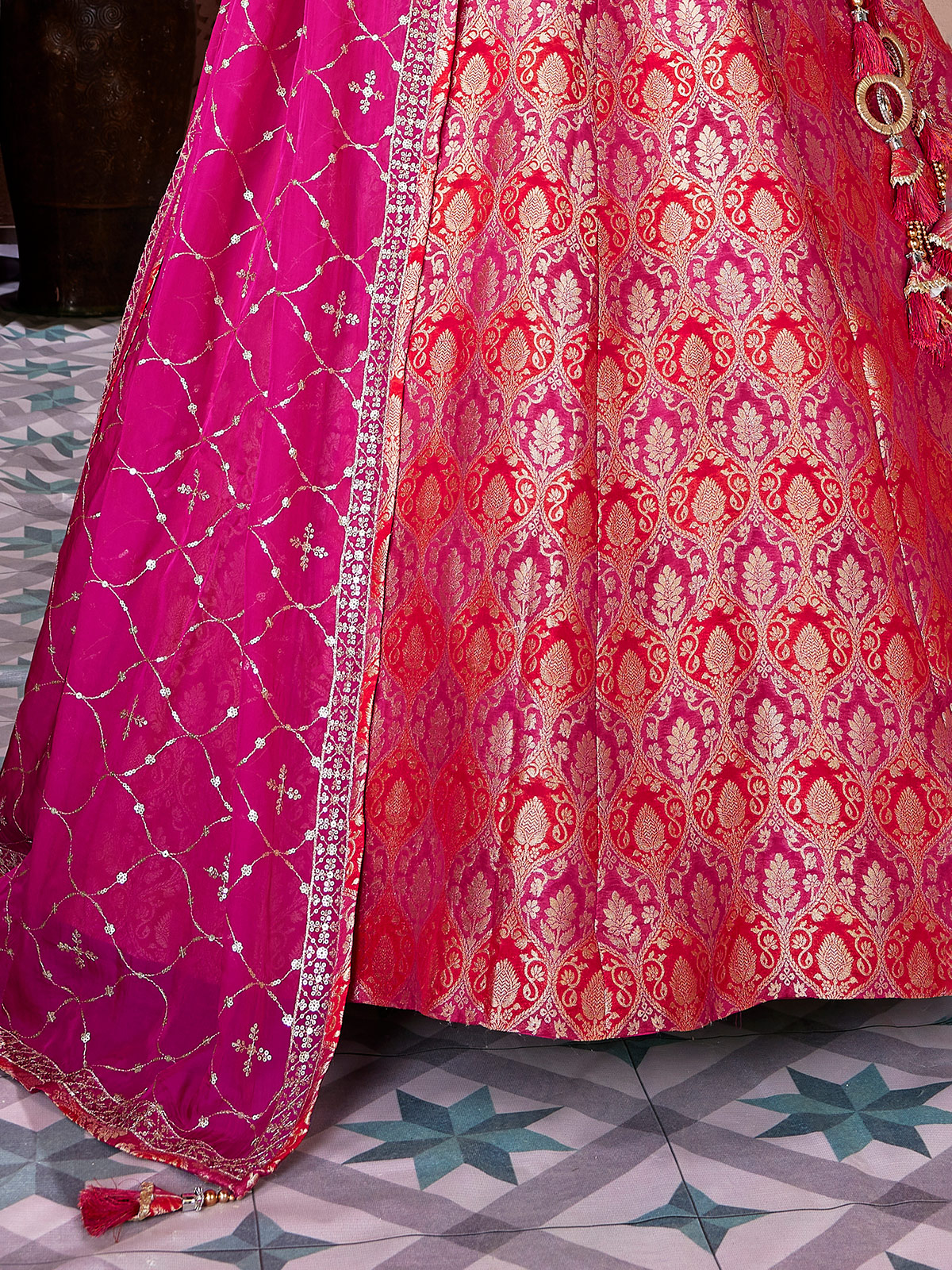 Radiating elegance rani pink banarasi silk lehenga choli is adorned with embroidery, sequins, cutdana, zardosi, diamond, mirror and zari work. The sweetheart neckline and elbow sleeves create a graceful silhouette, while the dupatta adds festive movement ideal for weddings and receptions.