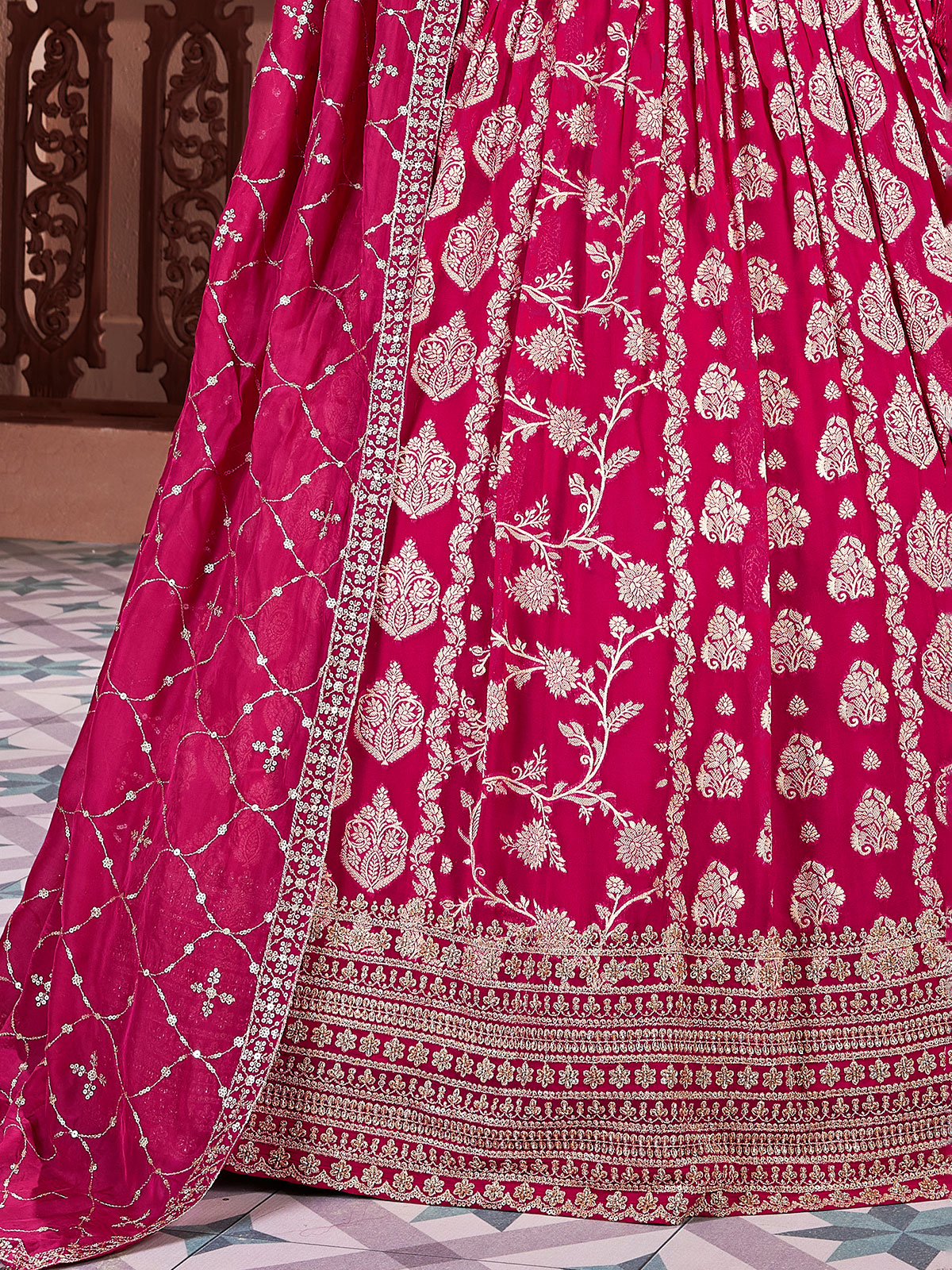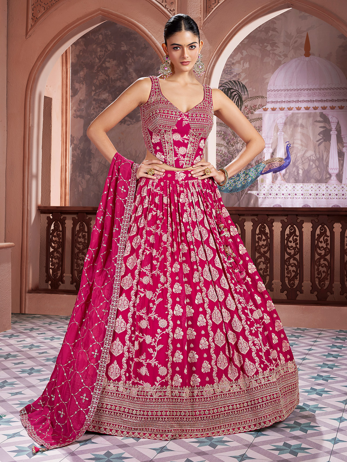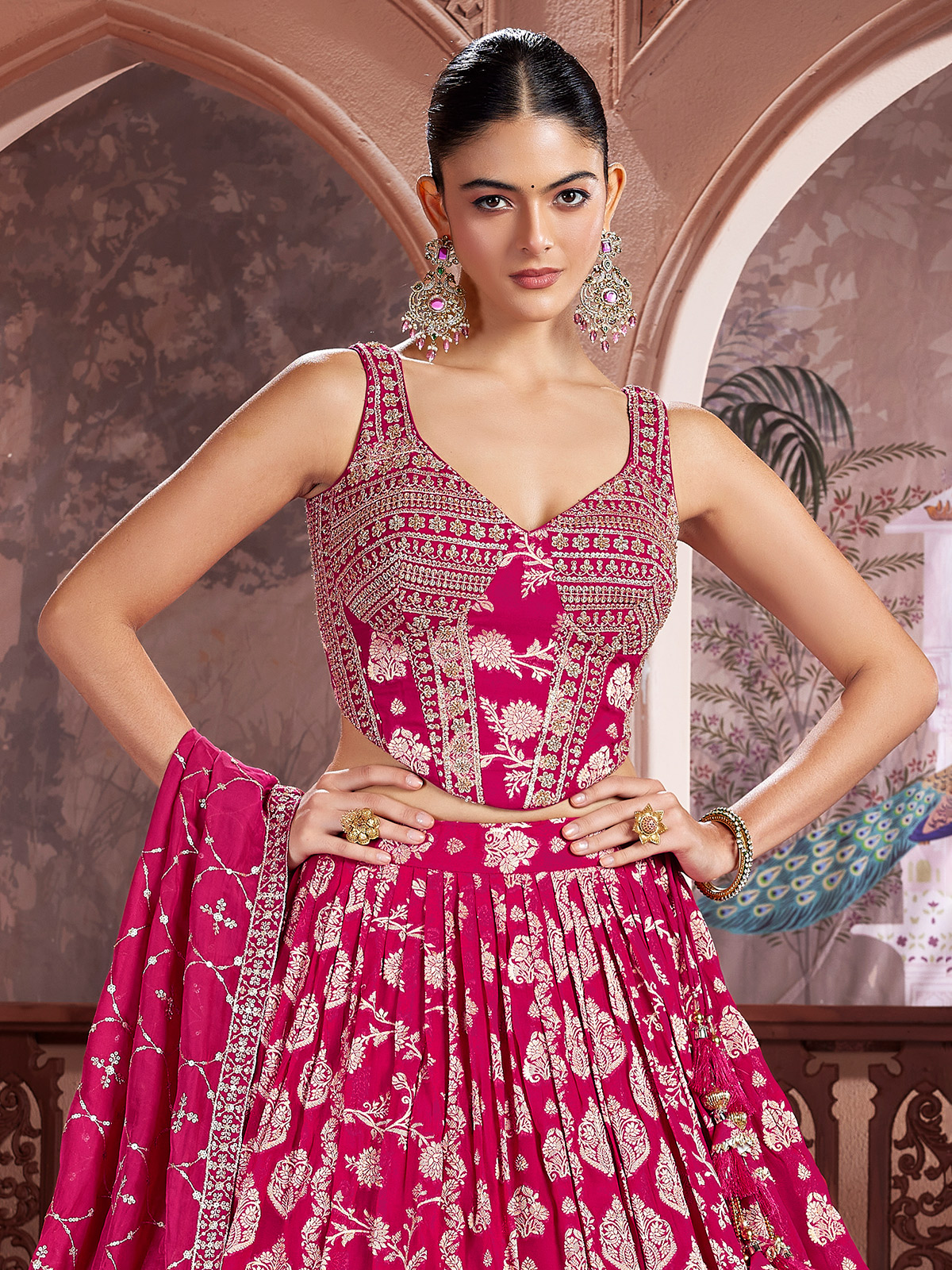 This rani pink georgette lehenga choli exudes youthful elegance with embroidery, sequins, cutdana and zari accents. Designed with a sweetheart neckline and sleeveless blouse. It pairs beautifully with a flowing dupatta, making it an ideal choice for wedding festivities, receptions and glamorous sangeet nights.