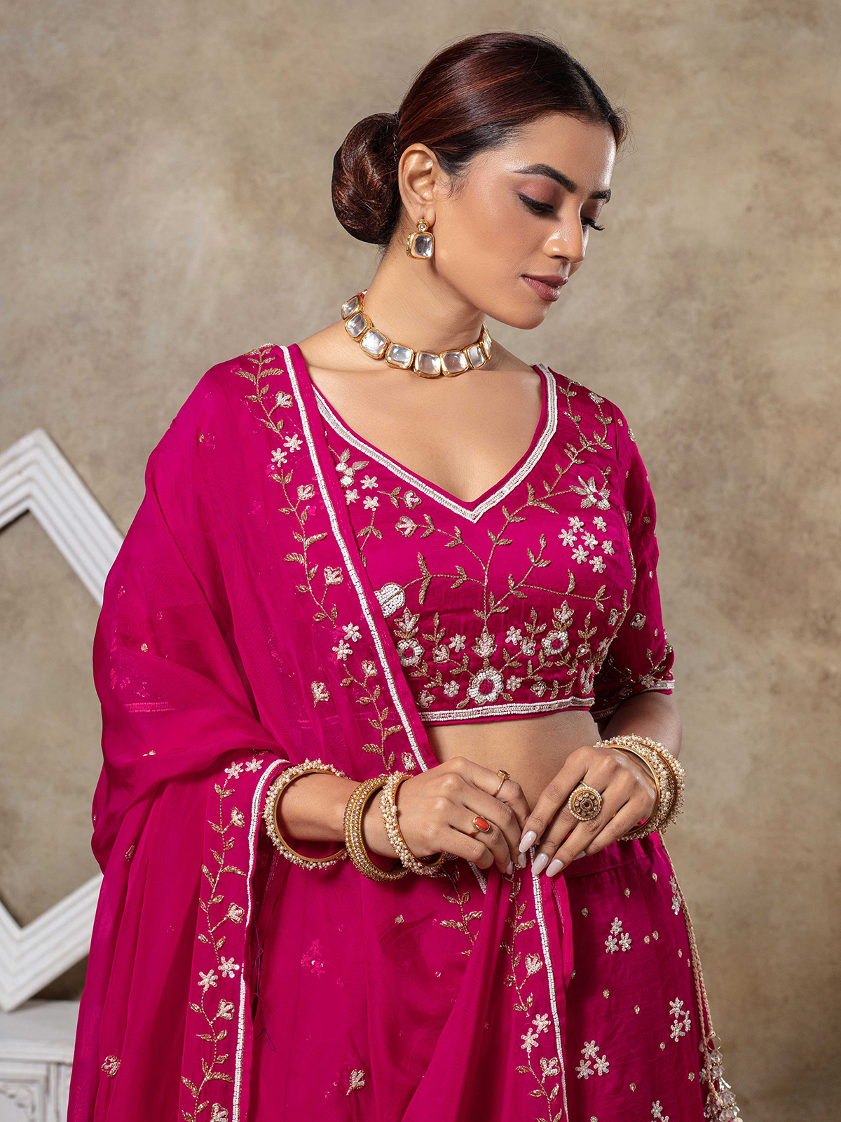 Rich rani pink raw silk lehenga choli sparkling with cutdana, sequins, beads, and thread detailing. Styled with a V neckline, elbow sleeves, and paired with a dupatta, it curates vibrant festive charm for weddings and receptions.