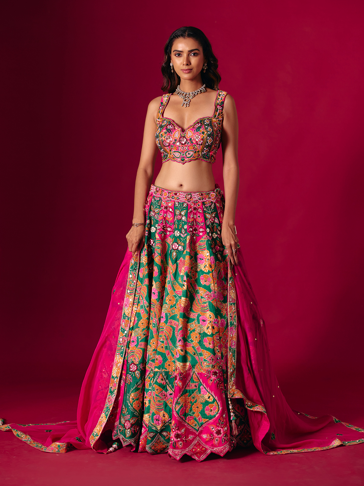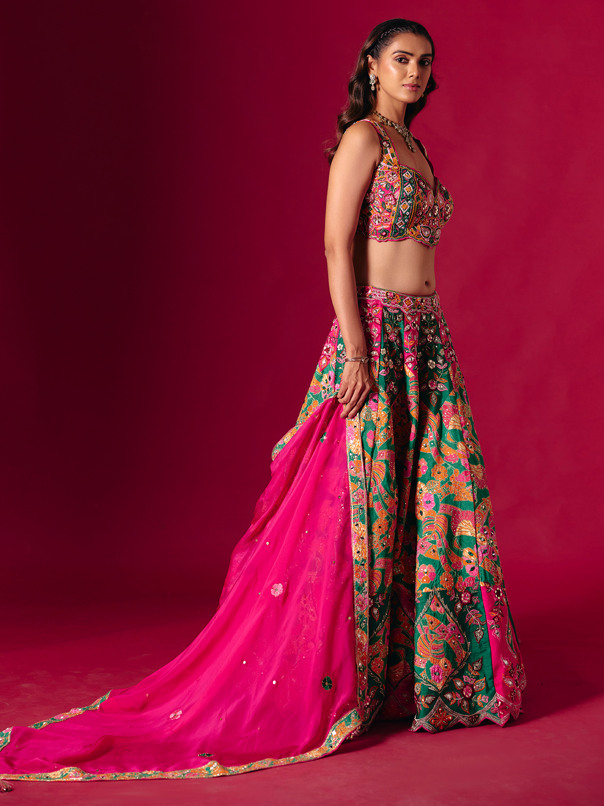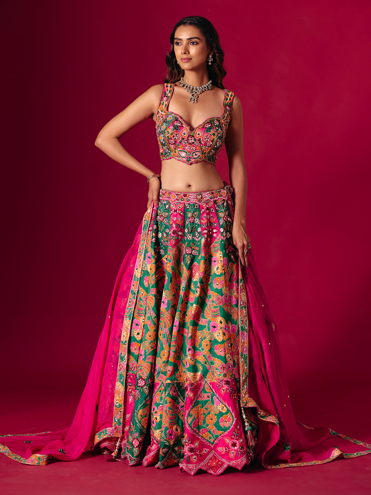 This rani pink raw silk lehenga choli sparkles with aabla, embroidery, mirror and cutdana detailing that bring a regal vibrance to the ensemble. Paired with a sleeveless designer blouse and a beautifully adorned dupatta, it creates a striking look perfect for wedding celebrations and reception nights.