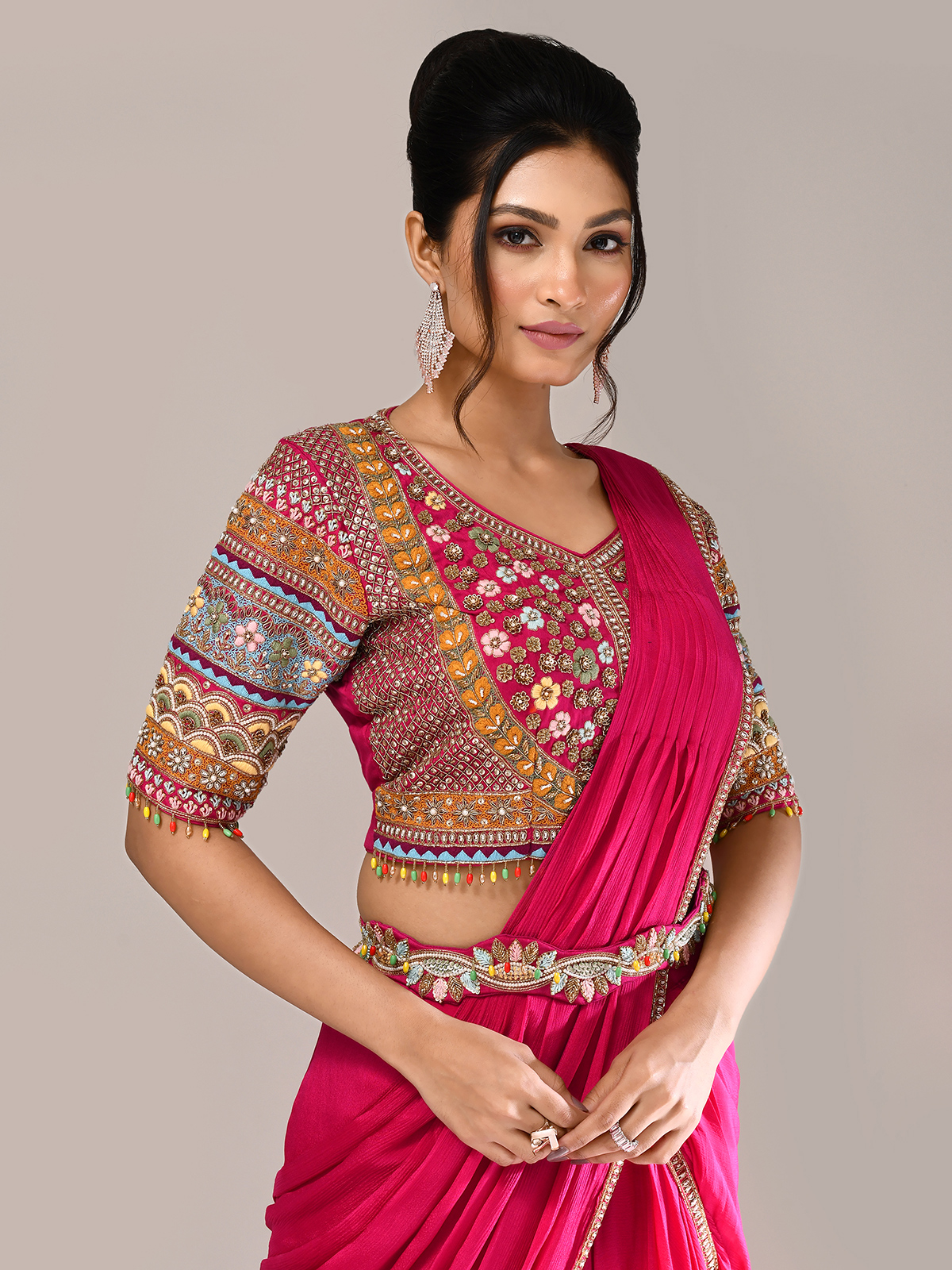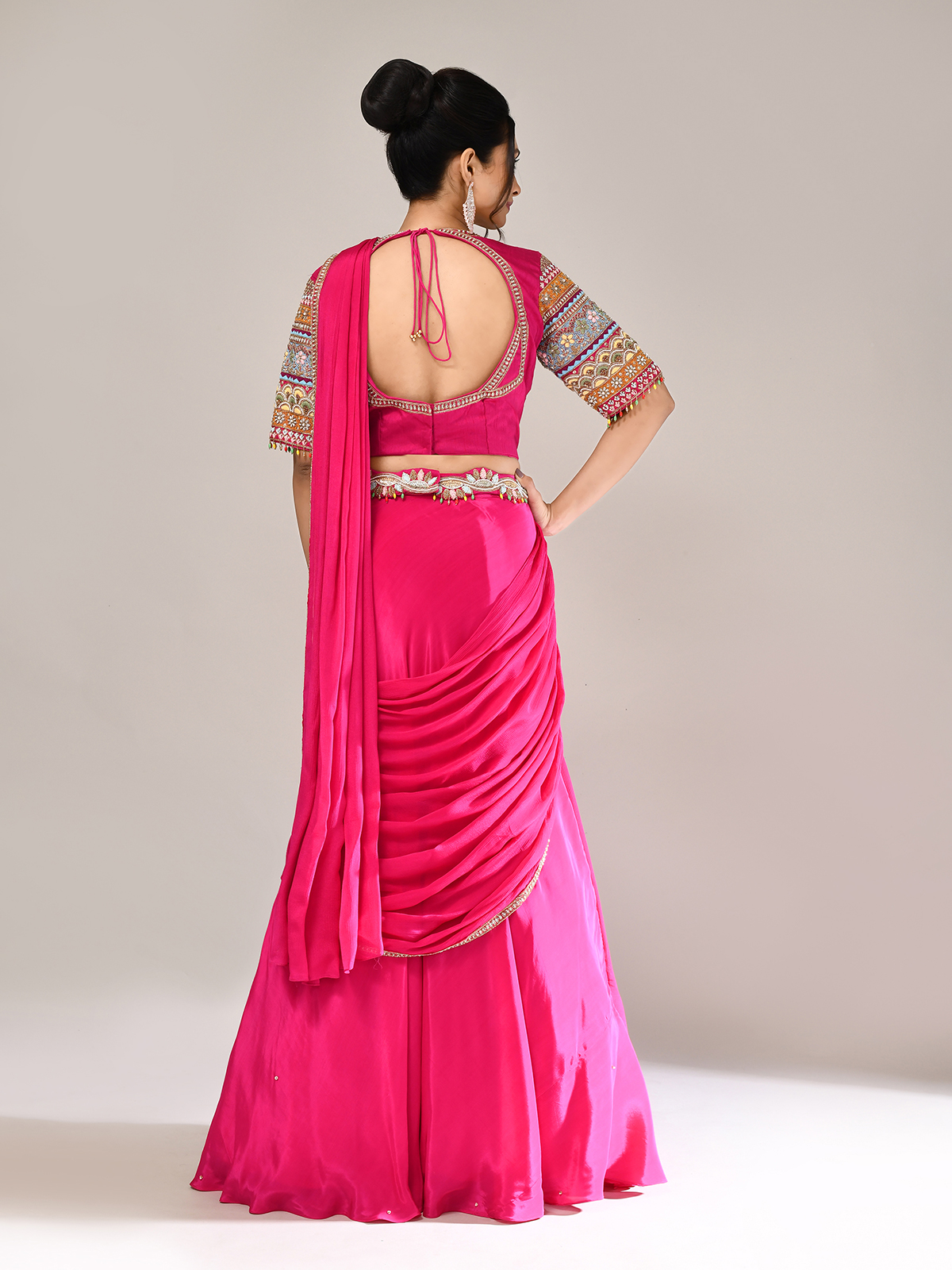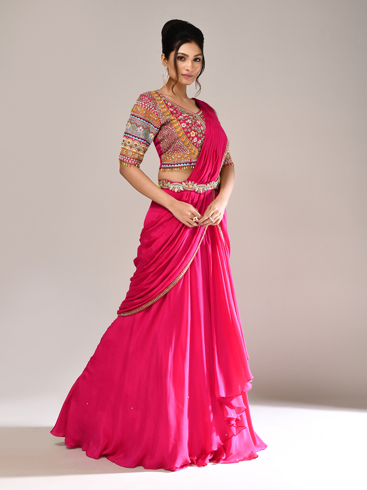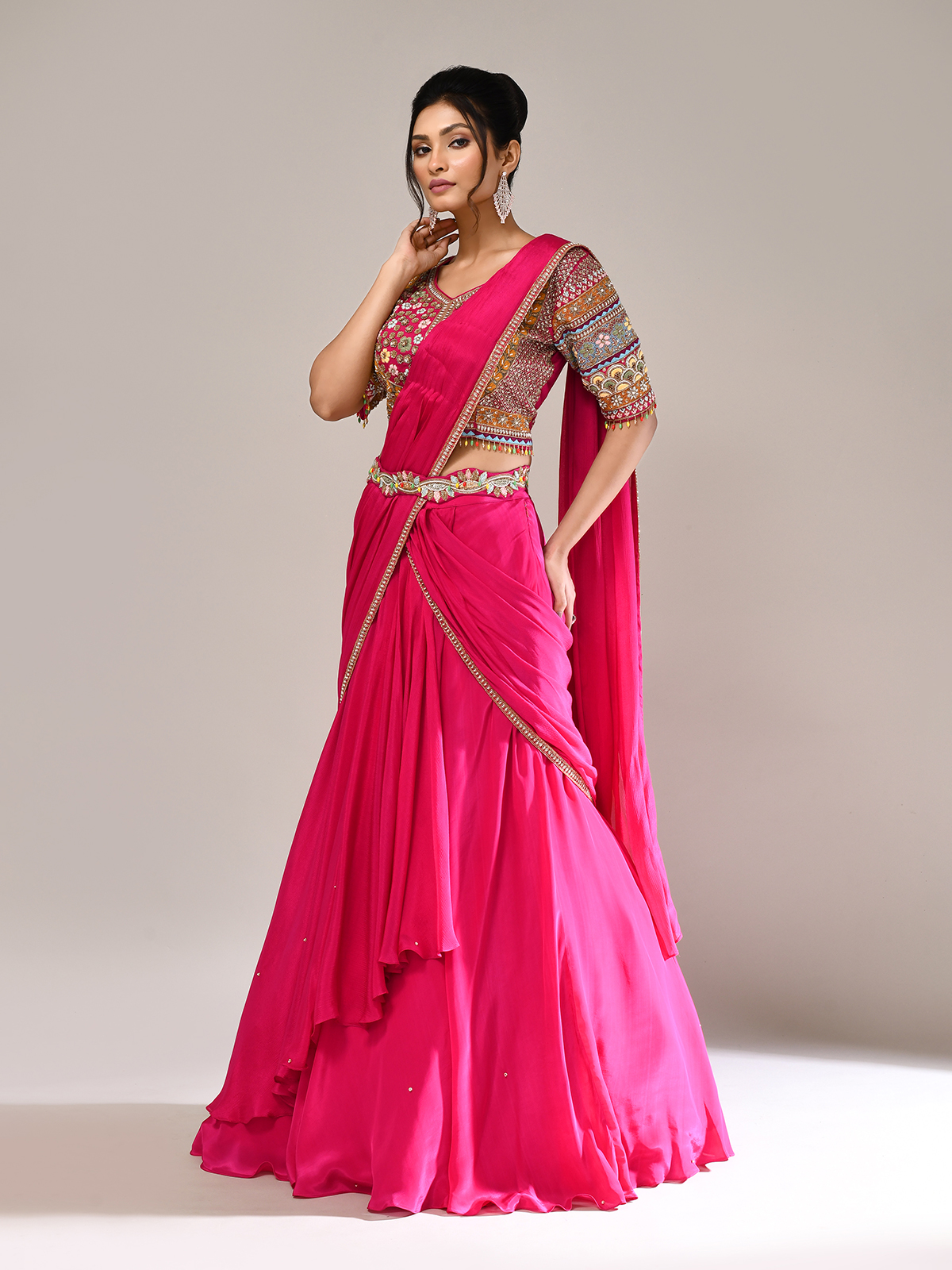 Exude radiant elegance in this rani pink silk lehenga choli, detailed with embroidery, zardosi, sequins, cutdana, beads, and thread. Styled with a V-neckline, elbow sleeves, and attached dupatta, this designer creation is perfect for weddings and receptions, offering timeless festive charm with a regal touch.