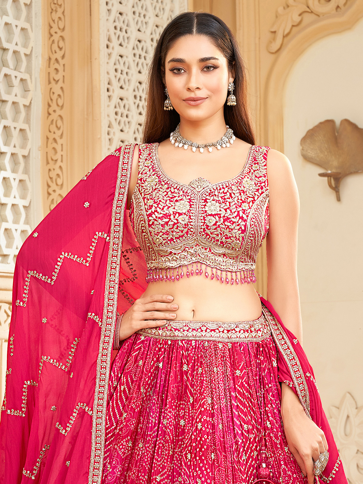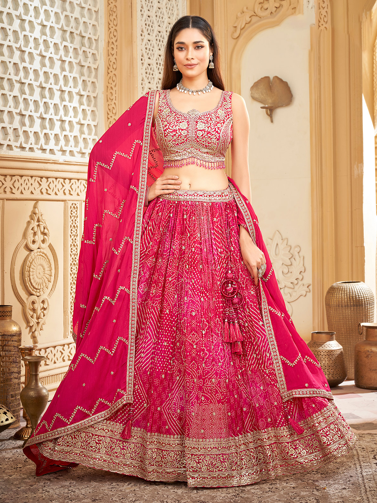 Make a striking entrance in this rani colour printed silk lehenga choli, adorned with glimmering stones, delicate beads, radiant sequins and intricate zari artistry. Paired with a stitched blouse and matching dupatta, it brings royal vibrance to weddings, receptions and traditional celebrations demanding grandeur.
