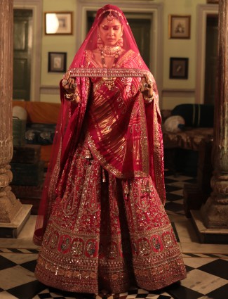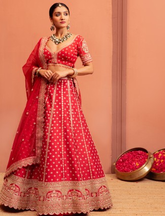 Dazzle in bridal elegance with this red raw silk lehenga choli, beautifully adorned with zardosi, cutdana, sequins, beads, zari and delicate embroidery. The sweetheart neckline and elbow sleeved ready blouse create a refined silhouette, perfect for wedding ceremonies, receptions and festive moments.