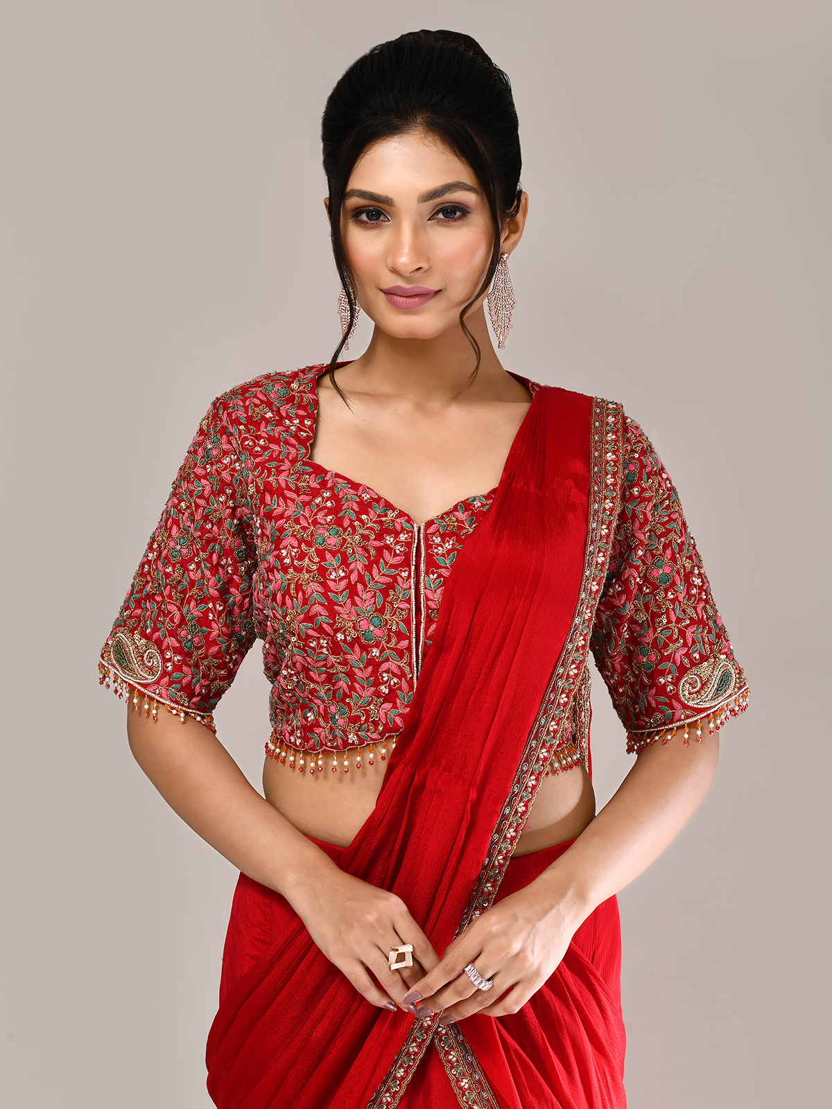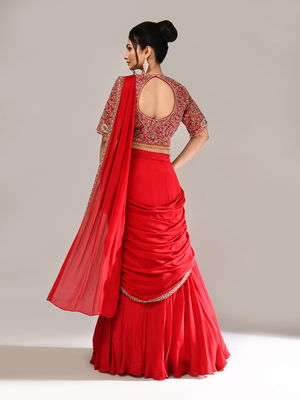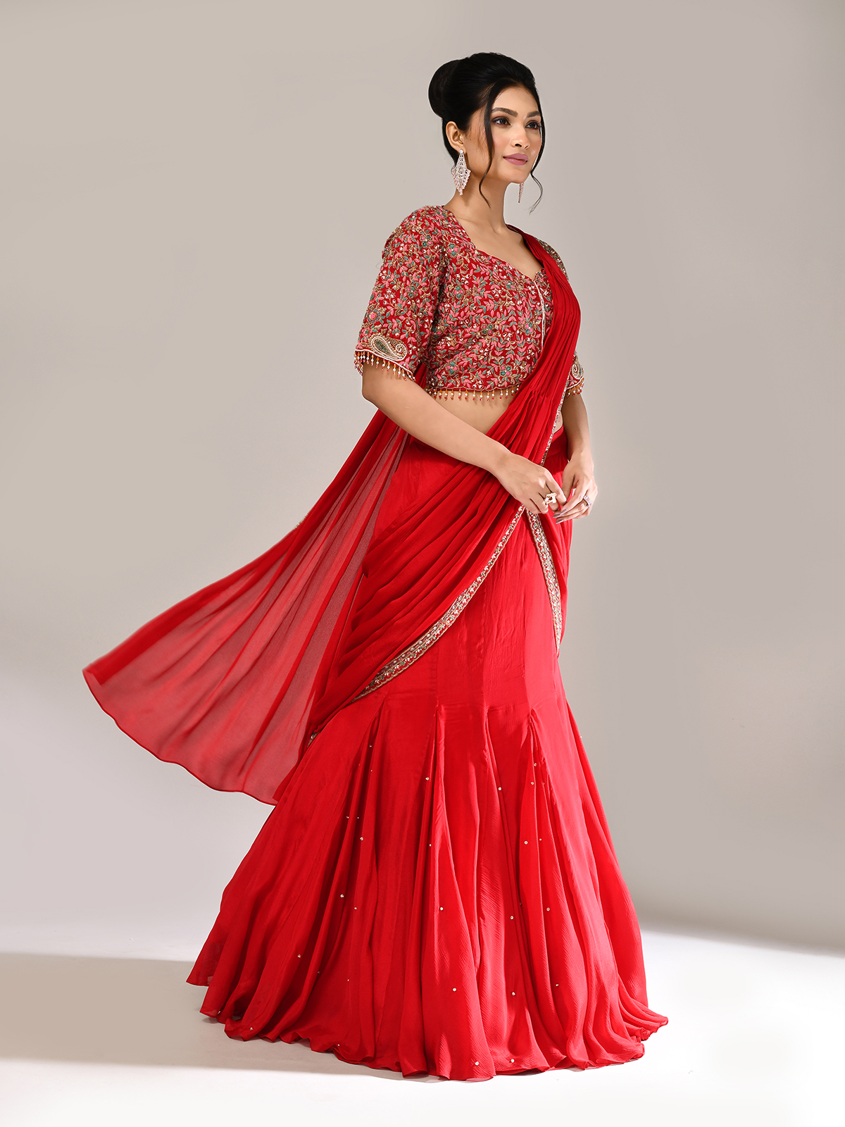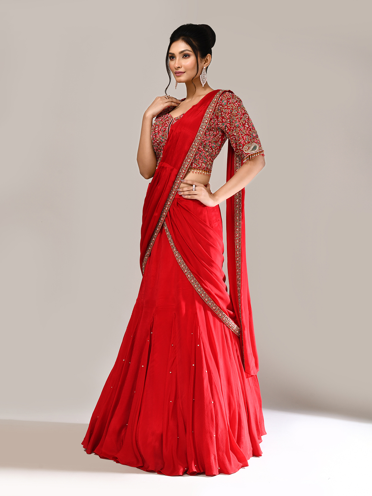 Grace wedding celebrations in this red chiffon lehenga choli. Styled with a sweetheart neckline and elbow sleeves, it glimmers with resham, zardosi, sequins, thread, and beads. Finished with an attached dupatta, this ensemble exudes refined artistry and festive charm.