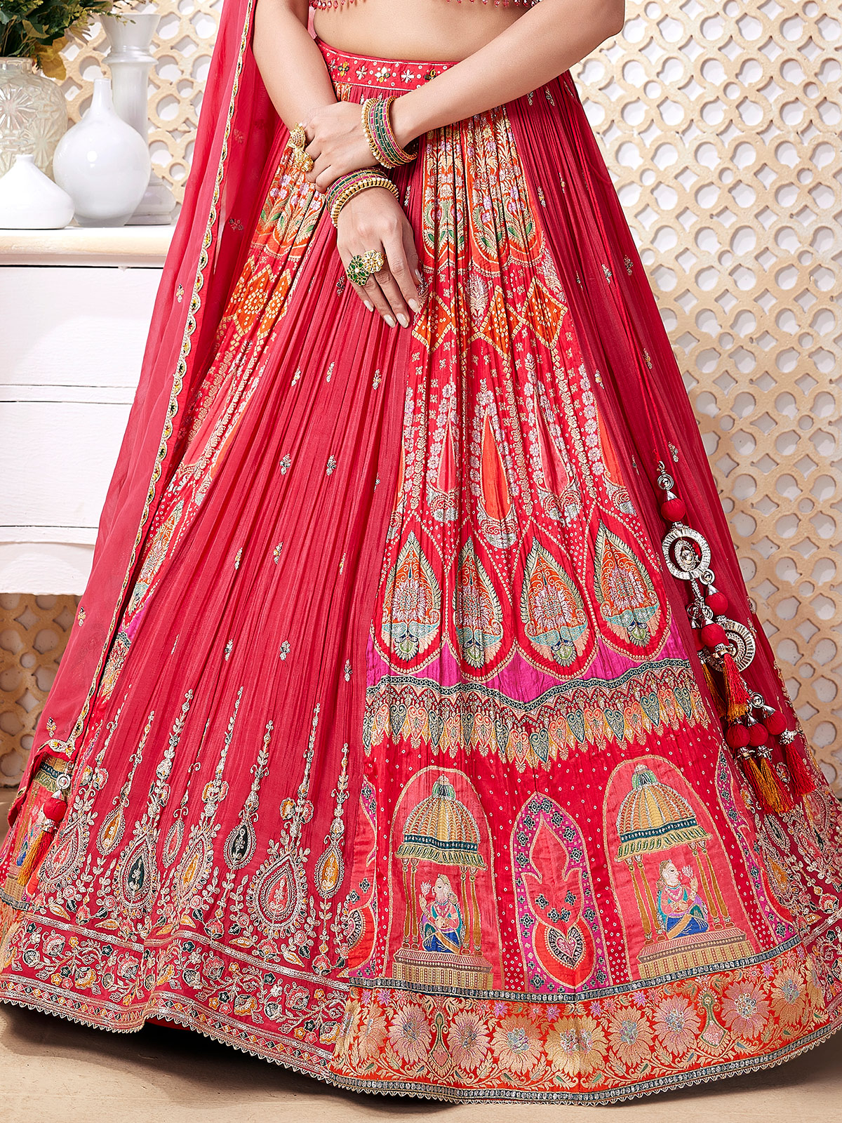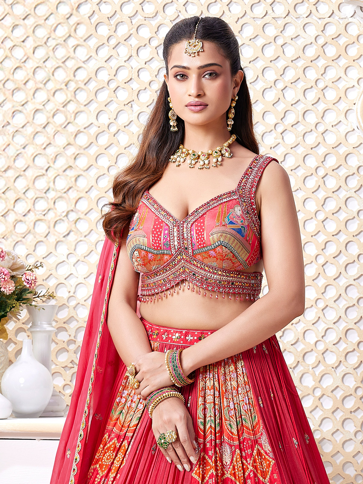 Crafted in rich red silk, this lehenga choli stands out with colorful motif embroidery enhanced by resham, sequins, aabla, cutdana, stone, and zardosi work. Designed with a sweetheart neckline and sleeveless style, it is paired with a dupatta for weddings and receptions.