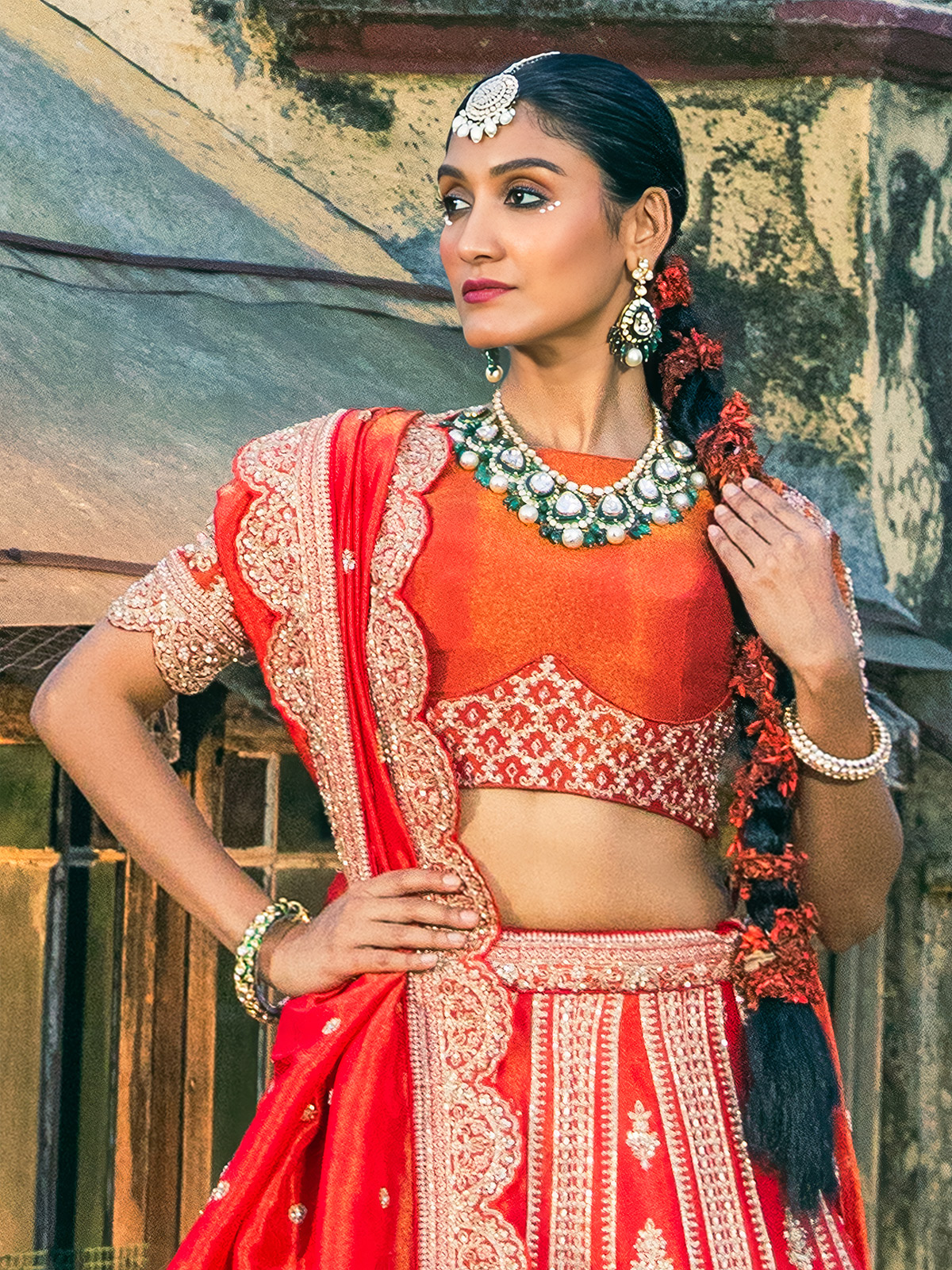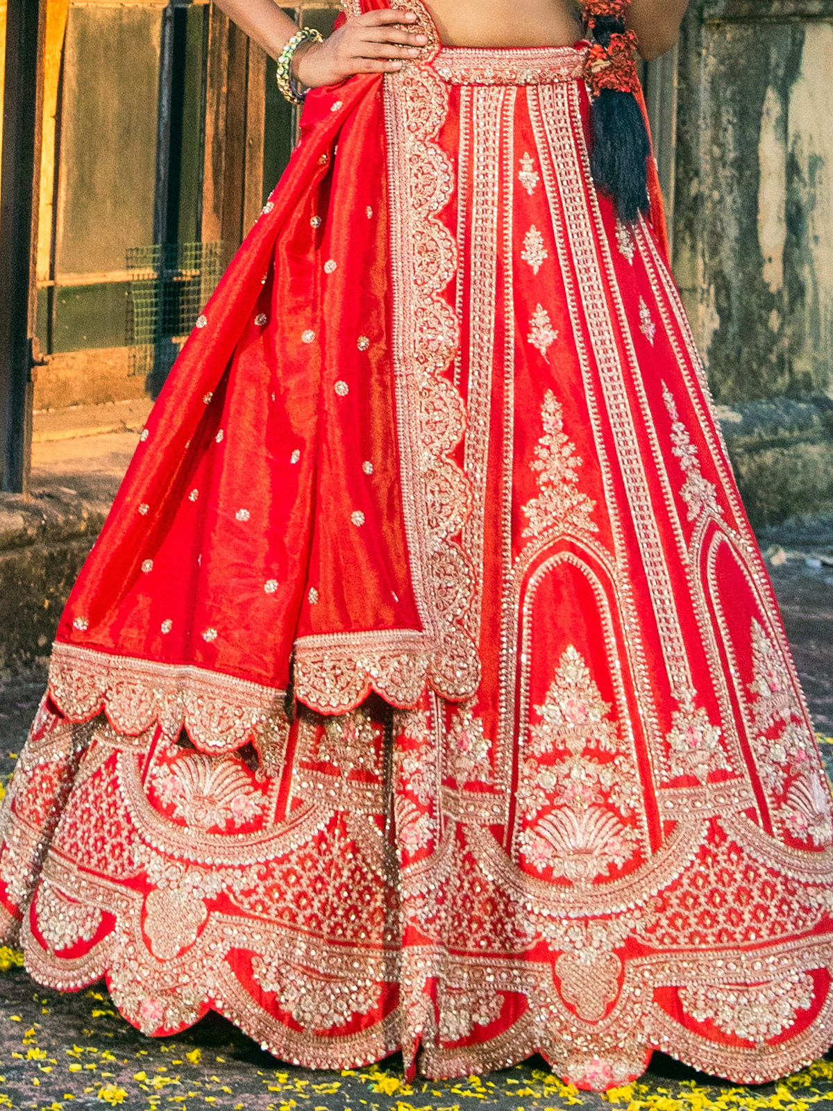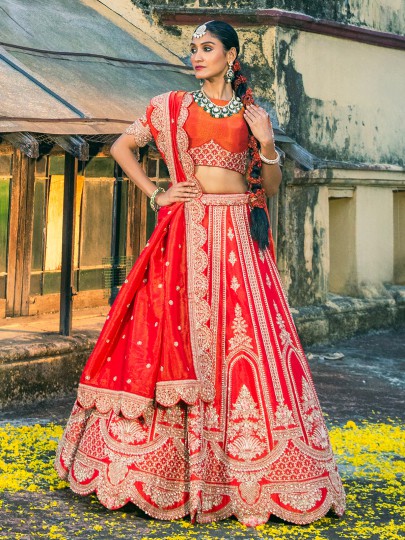 Designed to complement a brides glowing elegance, this red raw silk unstitched lehenga choli reflects cultural richness and wedding grandeur. The fabrics natural sheen enhances festive styling. Detailed with beads, resham, cutdana and sequins, it comes with an intricately embellished dupatta suited for bridal occasions.