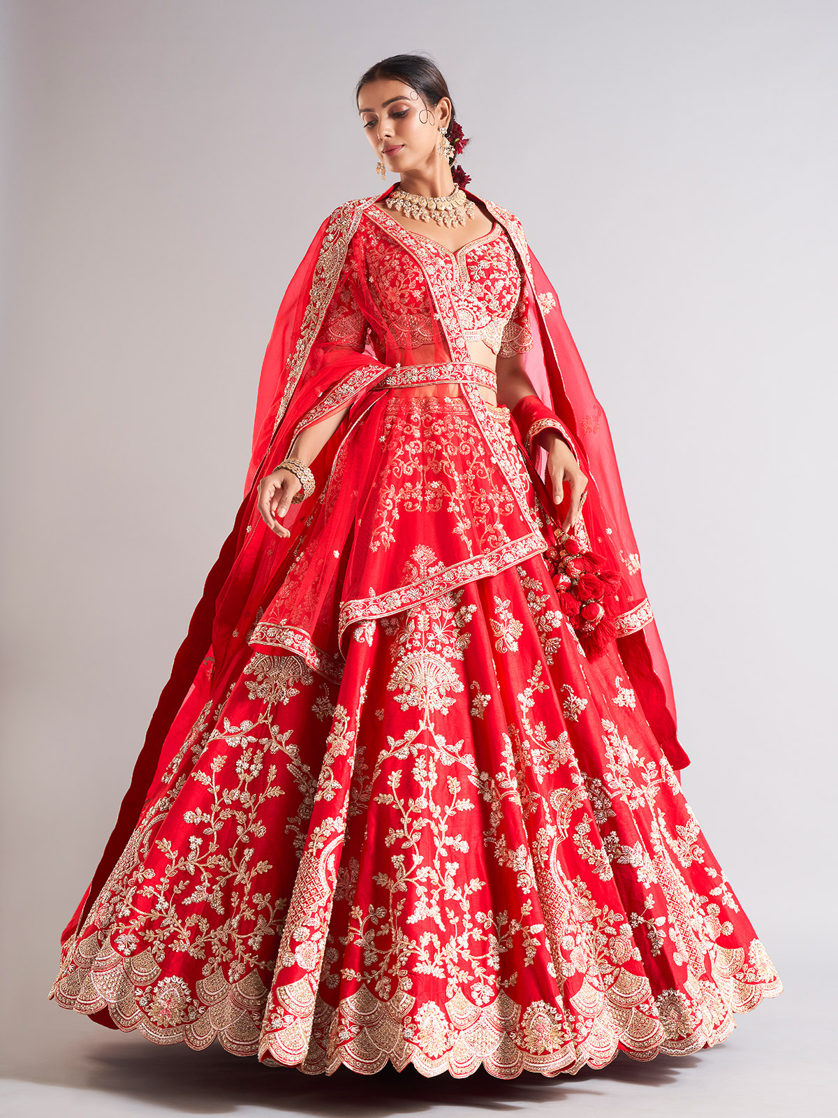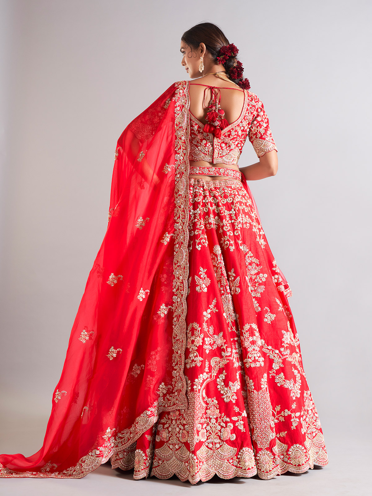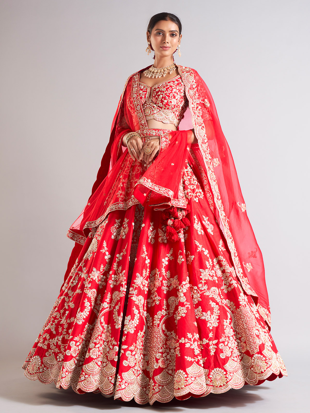 Embrace elegance with our red raw silk lehenga choli, adorned with cutdana, sequins, resham, zardosi, thread, and bead detailing. It’s a perfect choice for traditional wear, featuring a flattering sweetheart neckline and elbow sleeves.