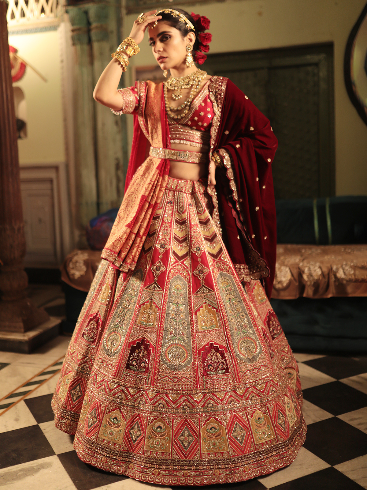 Make a fashion statement at any occasion with this fabulous red raw silk lehenga choli, embellished with intricate zari, stone, thread, sequins, resham, cutdana, and bead work. The choli features a V-neck and half sleeves, paired with a stylish dupatta.