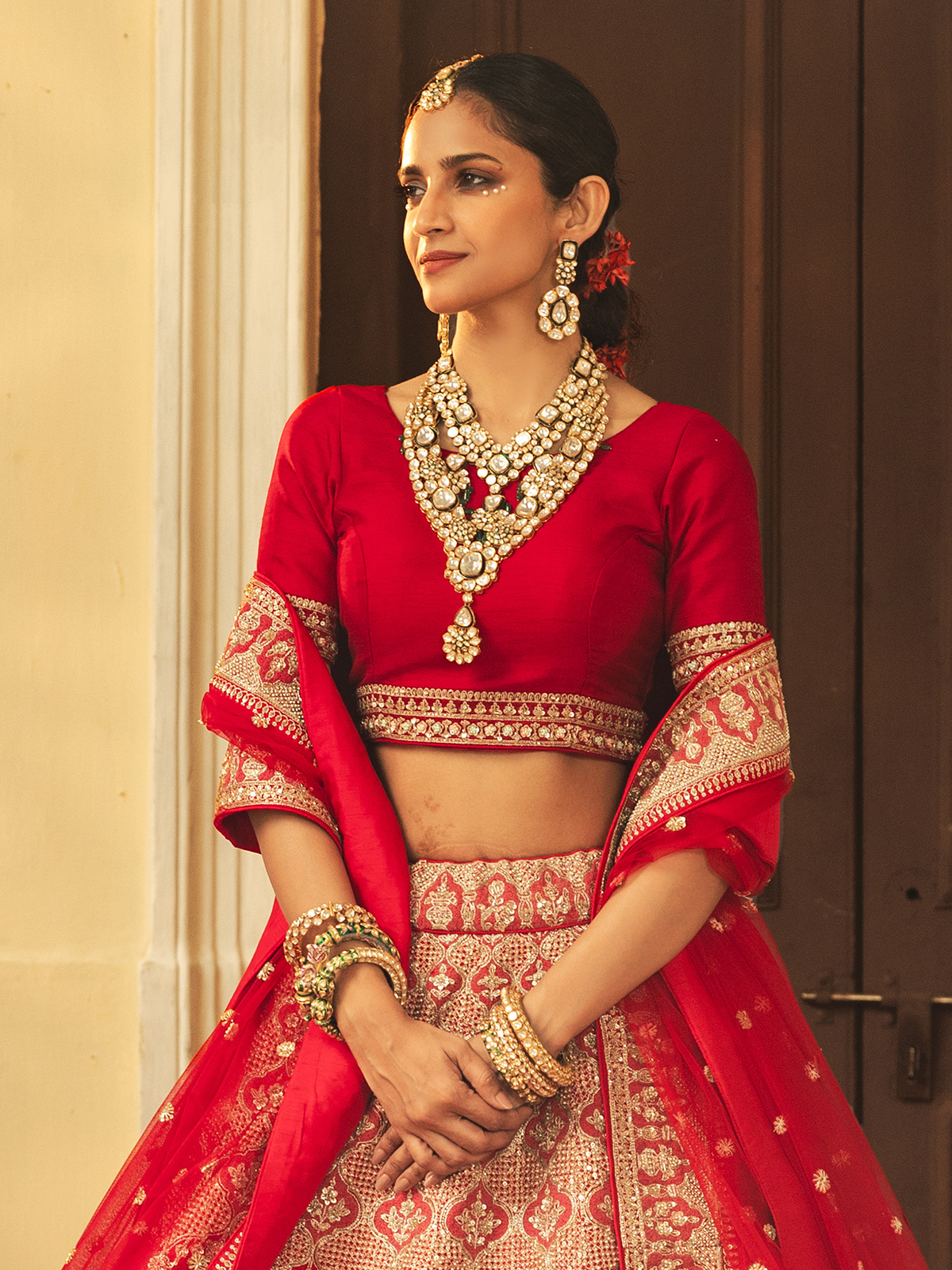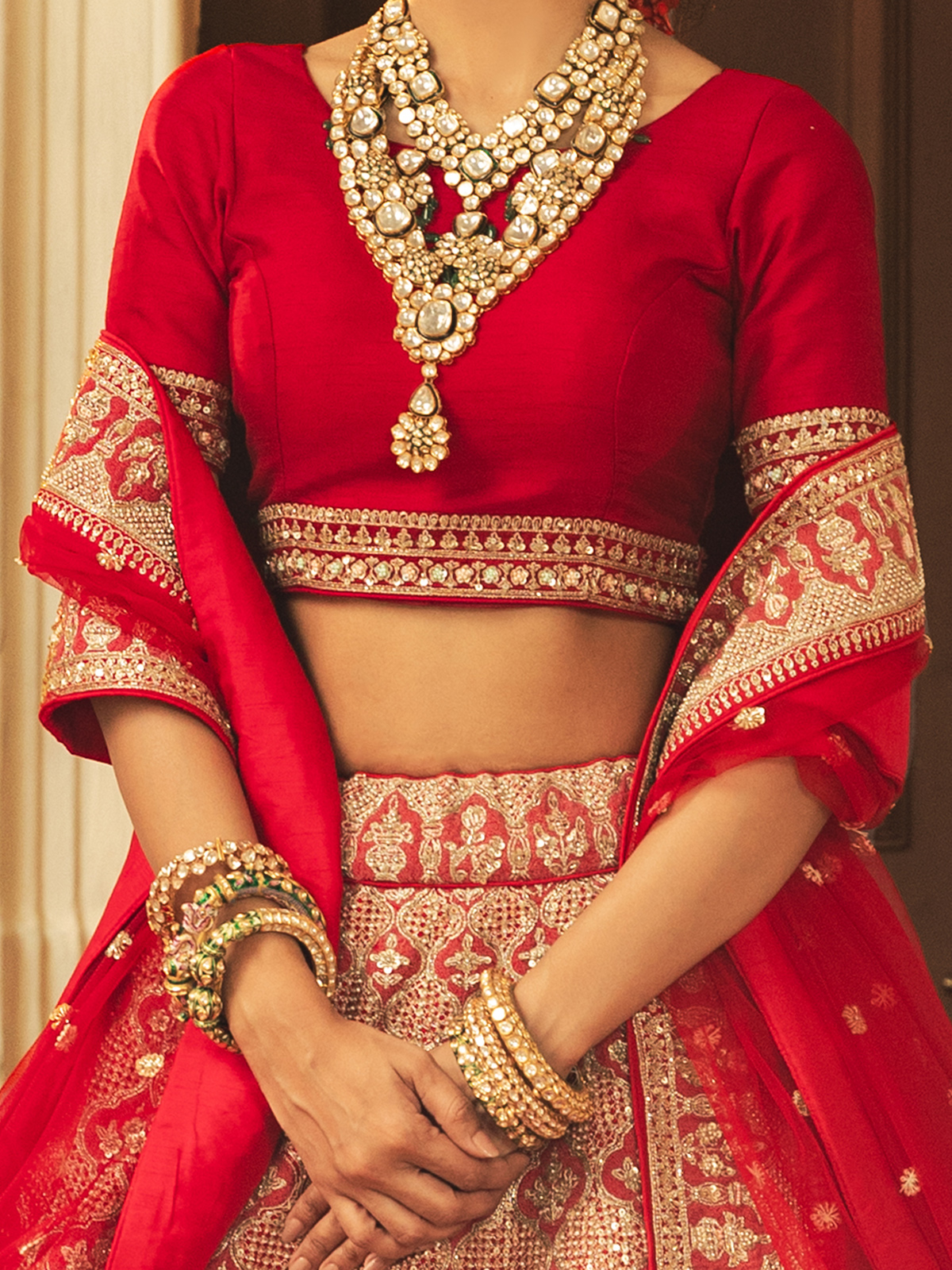 Celebrating bridal beauty with regal finesse, this red raw silk unstitched lehenga choli offers a striking blend of tradition and elegance. The vibrant tone makes it perfect for sacred wedding moments. Adorned with beads, resham, cutdana and sequins, it is paired with a dupatta for a complete bridal look.