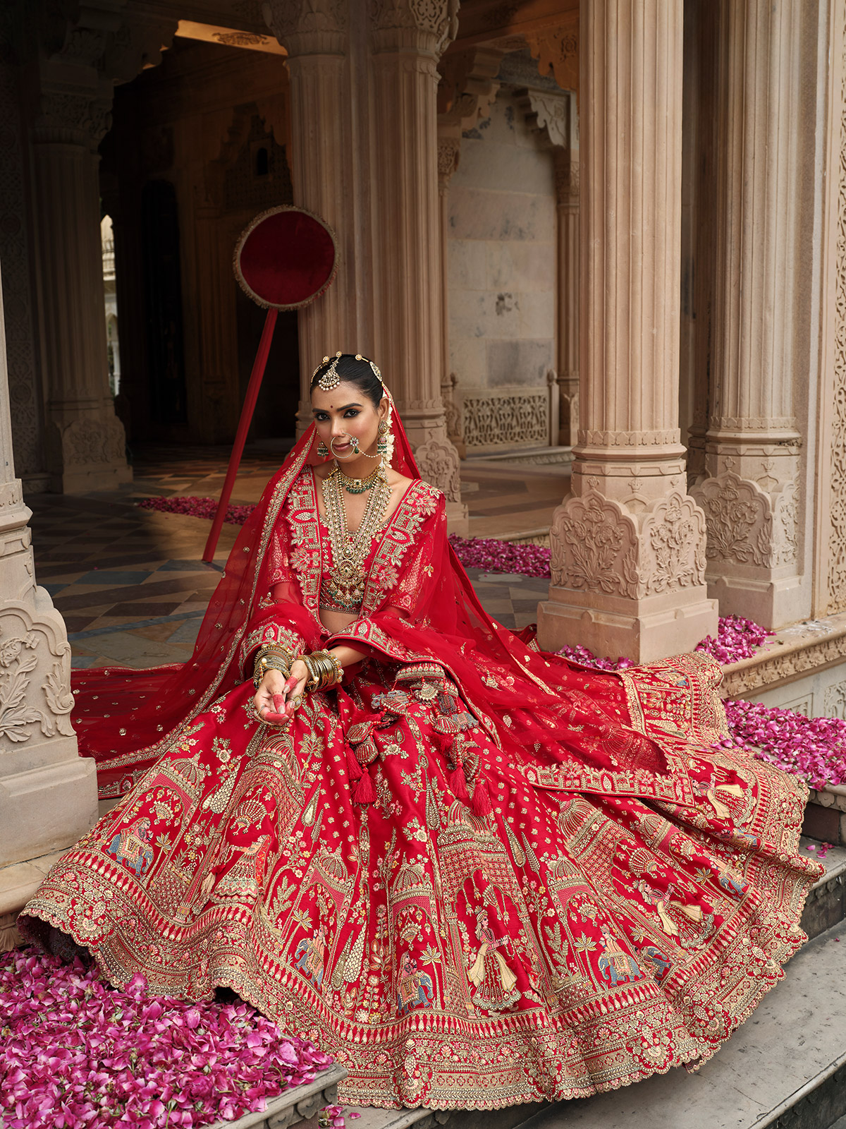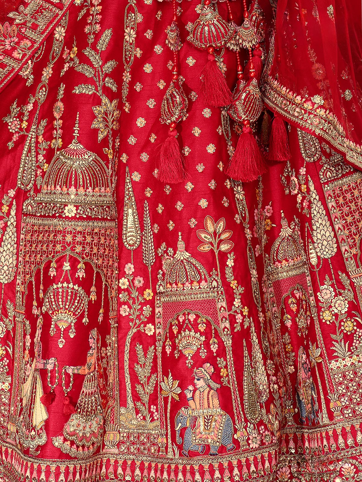 Red silk drapes this unstitched lehenga choli with luxurious warmth. Sequins, diamond, thread, beads, cutdana, and resham glimmer like dewdrops at sunrise. Paired with one net dupatta and an unstitched blouse, it leaves the bride glowing with understated charm and timeless elegance.