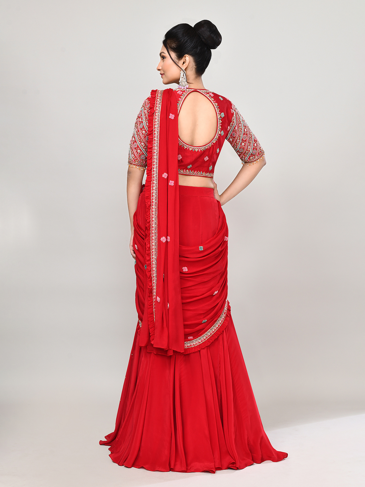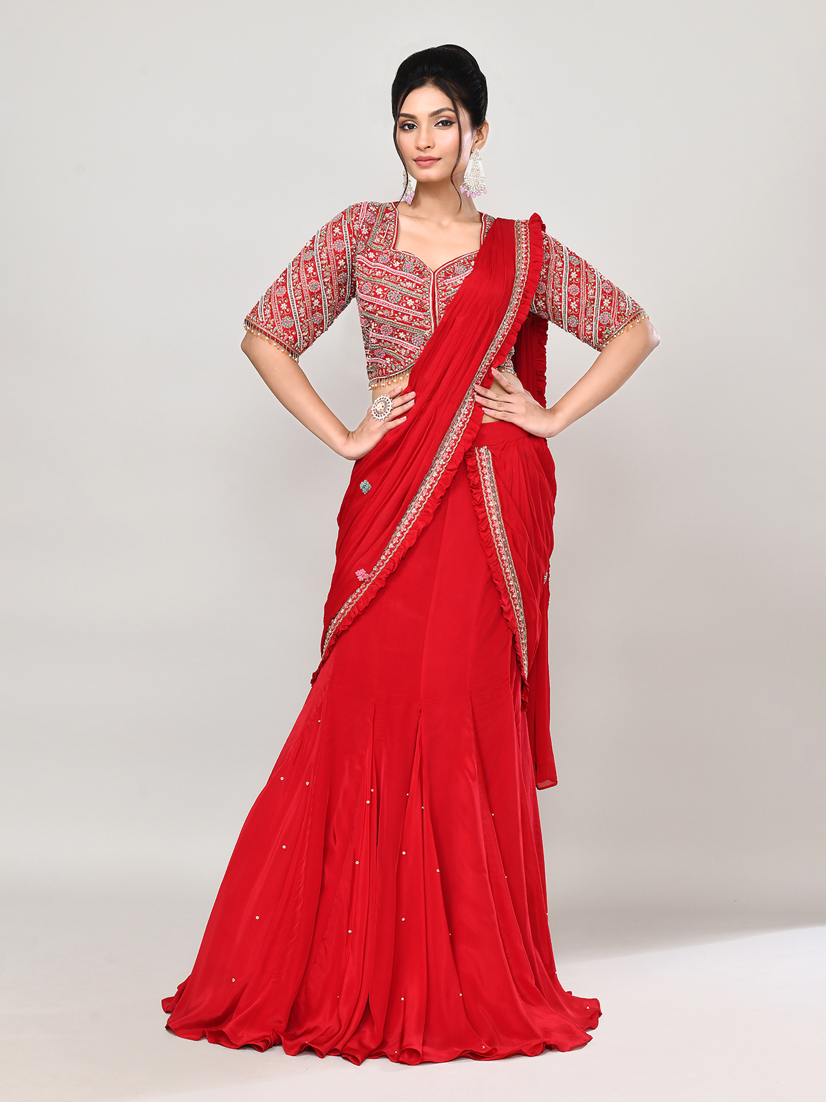 Celebrate in bridal elegance with this red silk lehenga choli. Embellished with sequins, zardosi, beads, pearls, and thread, it comes with elbow sleeves, a sweetheart neckline, and attached dupatta. A timeless pick for weddings, glowing with festive brilliance.