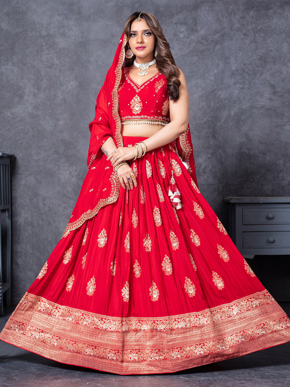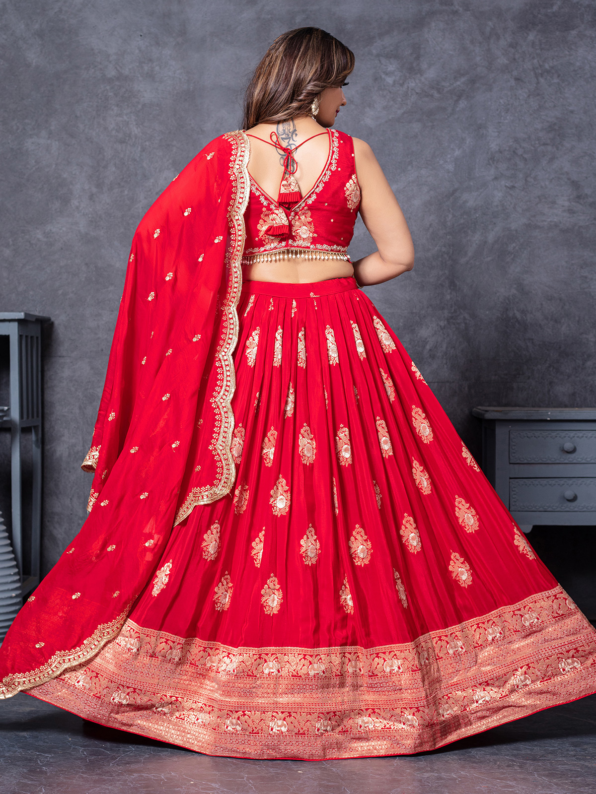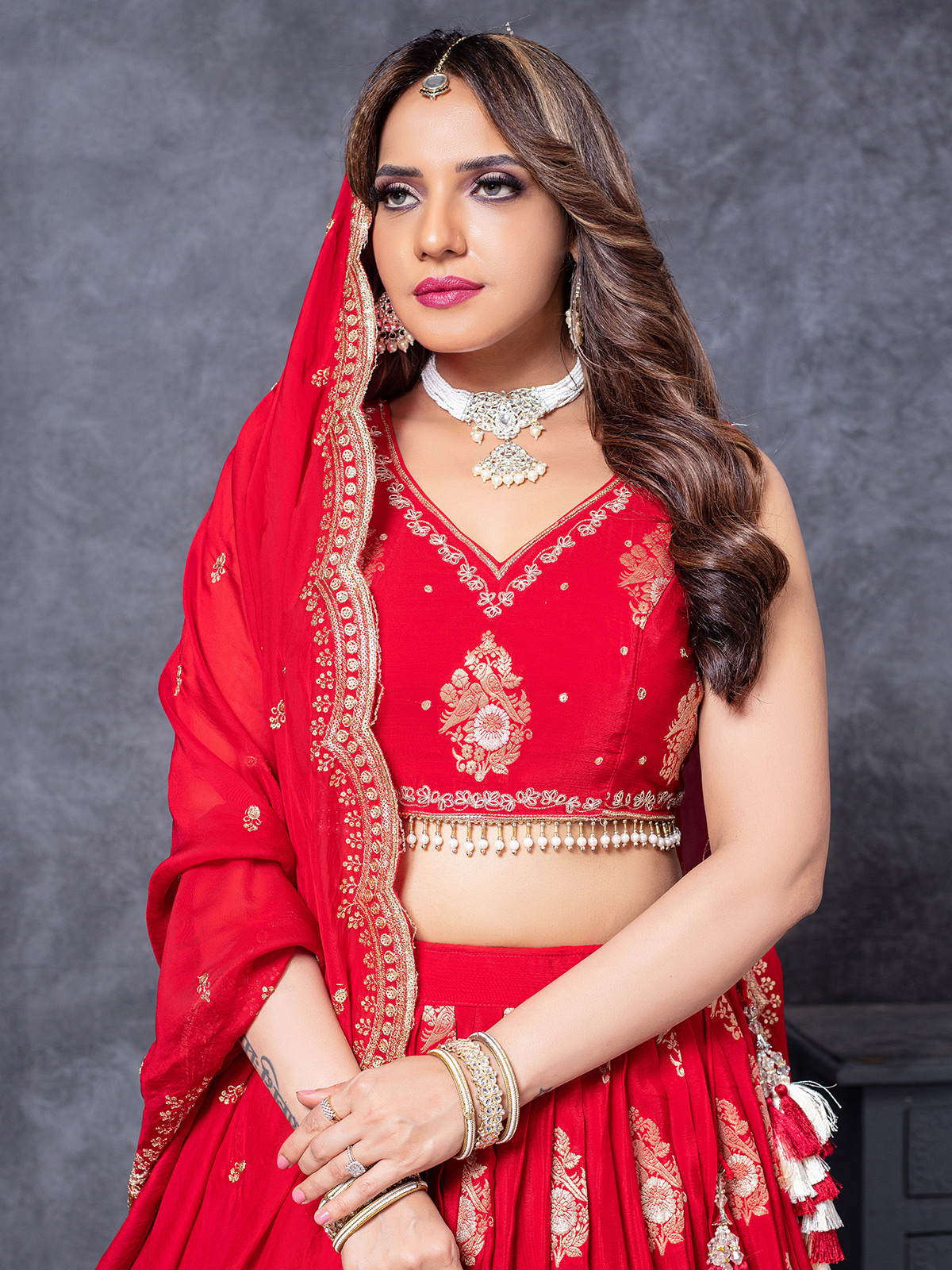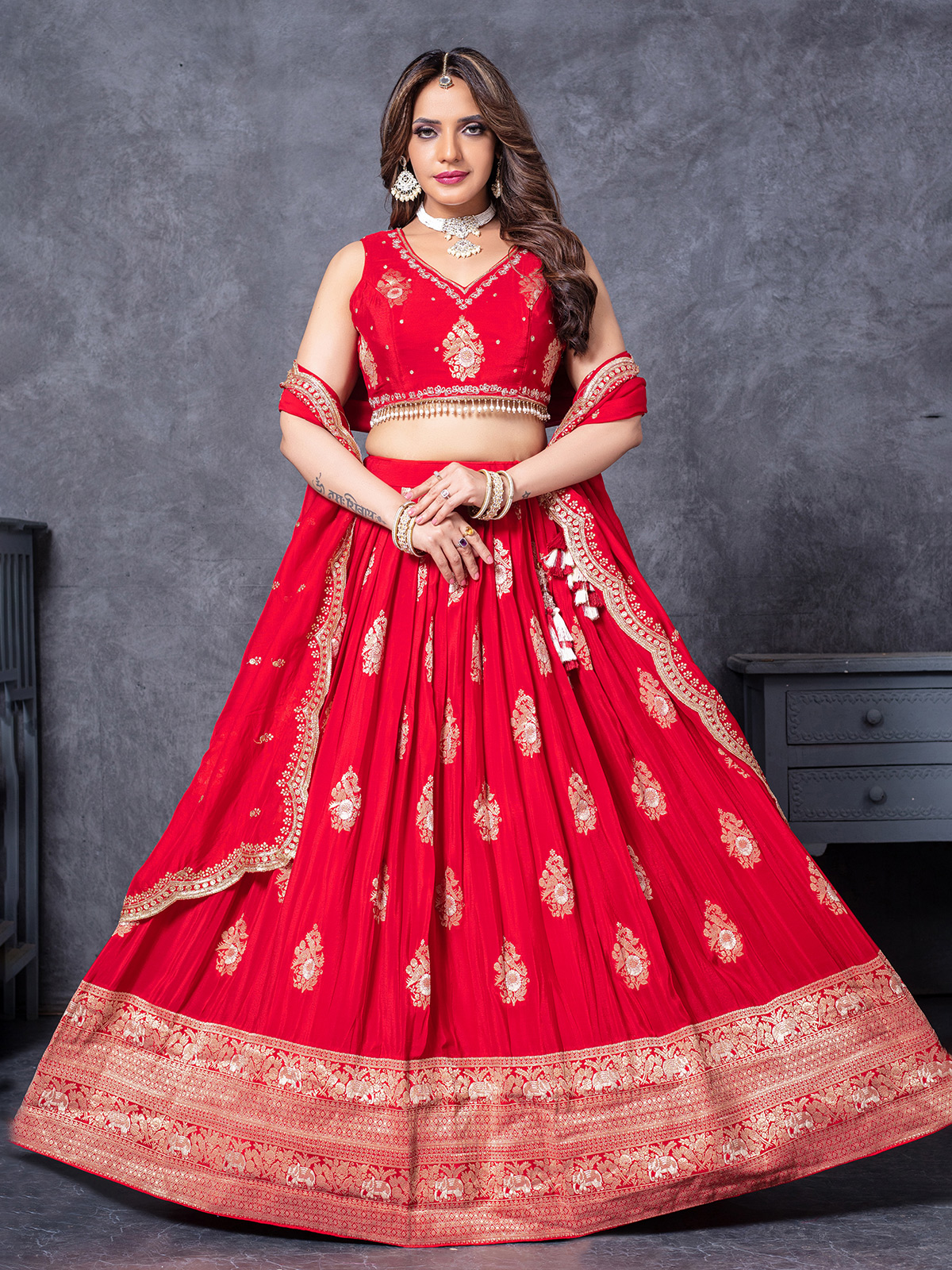 For a stunning bridal or reception statement, choose this red silk lehenga choli. The sleeveless sweetheart neckline choli is intricately adorned with cutdana, zardosi, sequins, beads, and zari work. A dupatta completes this elegant look.