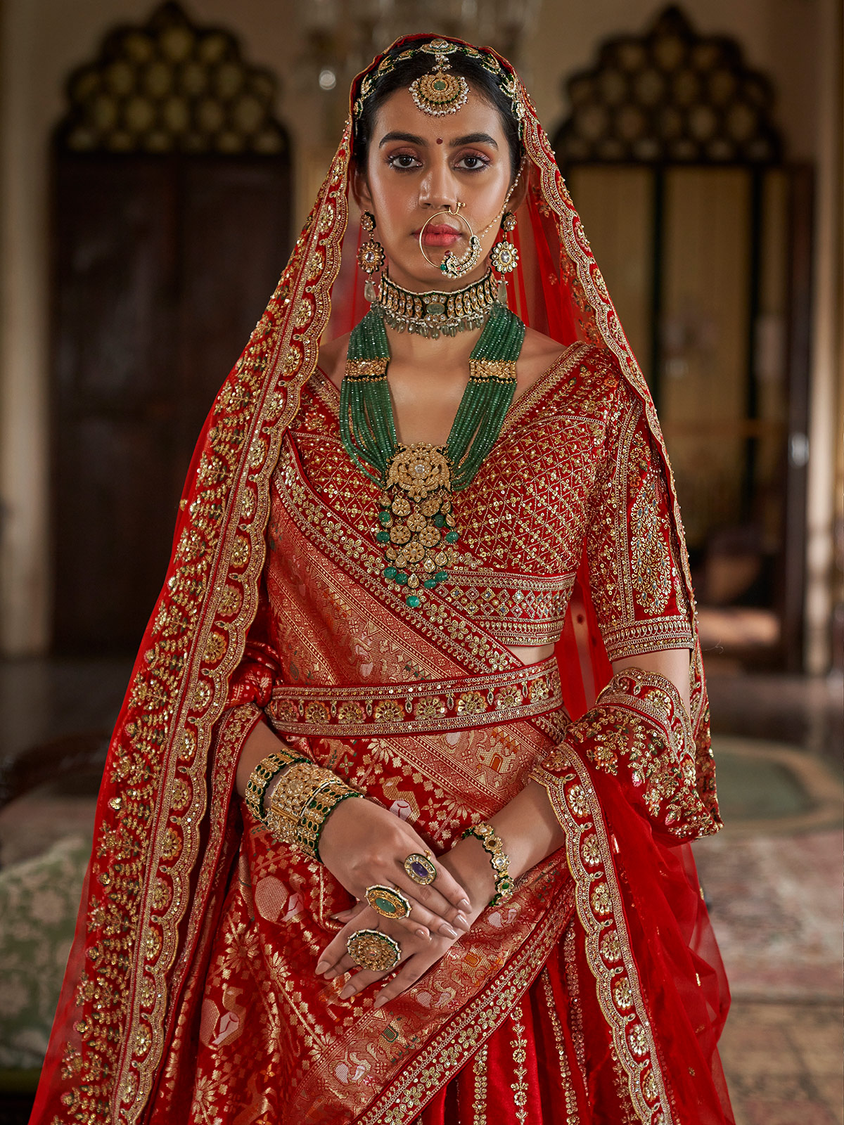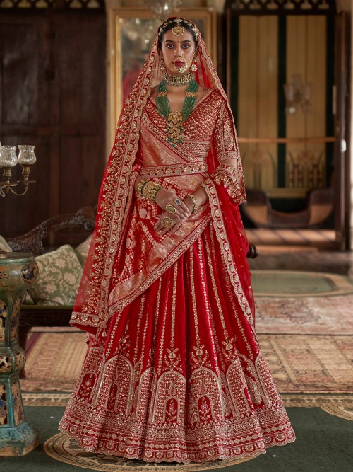 Draped in vibrant red silk, this bridal semi stitched lehenga choli exudes passion and timeless wedding beauty. Adorned with resham, beads, sequins, and embroidery, it is paired with an unstitched blouse for a bespoke fit. Completed with a decorated belt and two dupattas, the ensemble transforms the bride into a glowing vision of love and grace, capturing the essence of eternal bridal allure.
