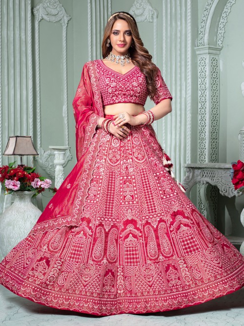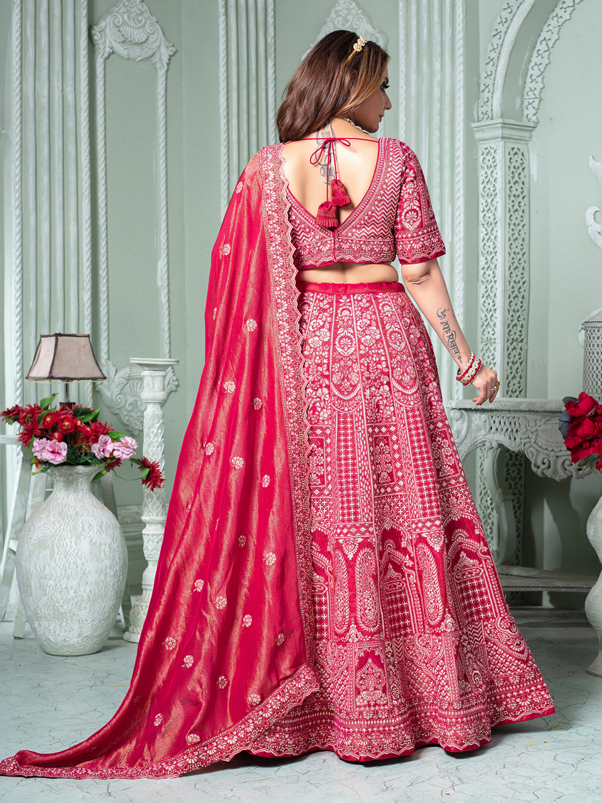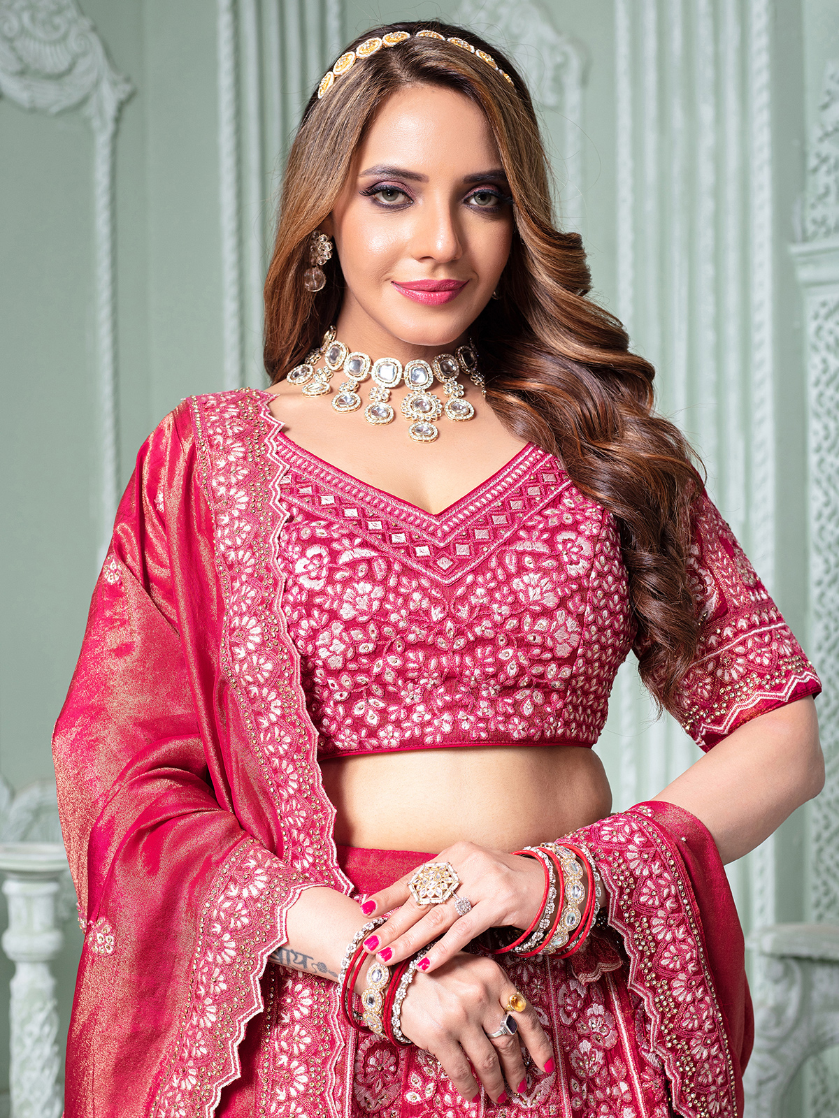 Bold red tissue silk lehenga choli embellished with embroidery, thread work, and diamond accents. Styled with a V neckline, half sleeves, and paired with a dupatta, it is perfect for weddings, receptions, and festive occasions.
