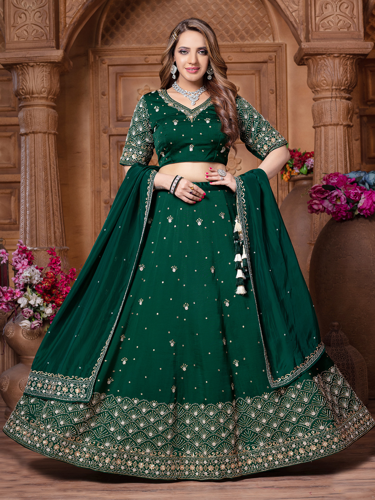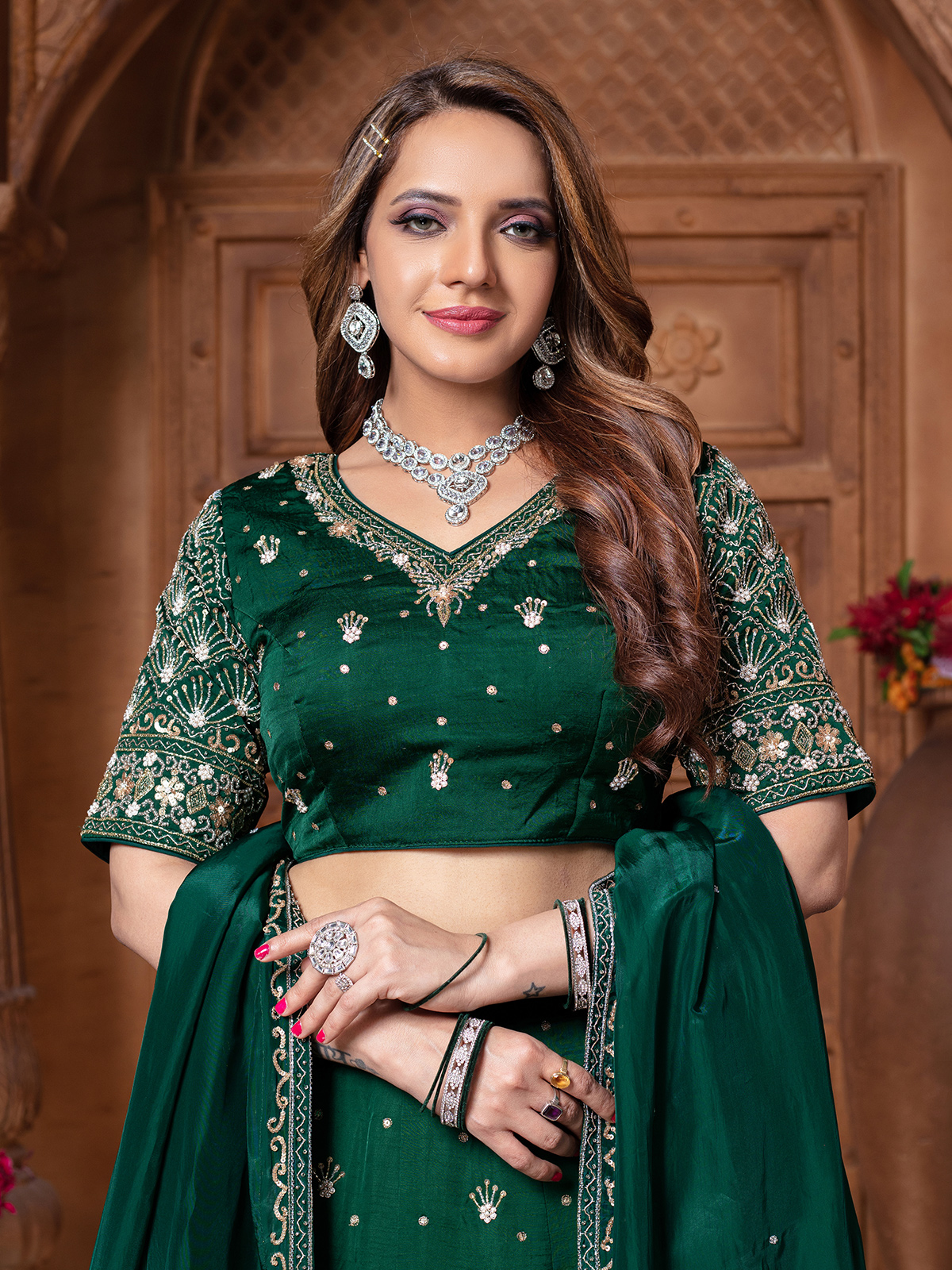 Regal Bottle Green Raw Silk Lehenga Choli Ensemble