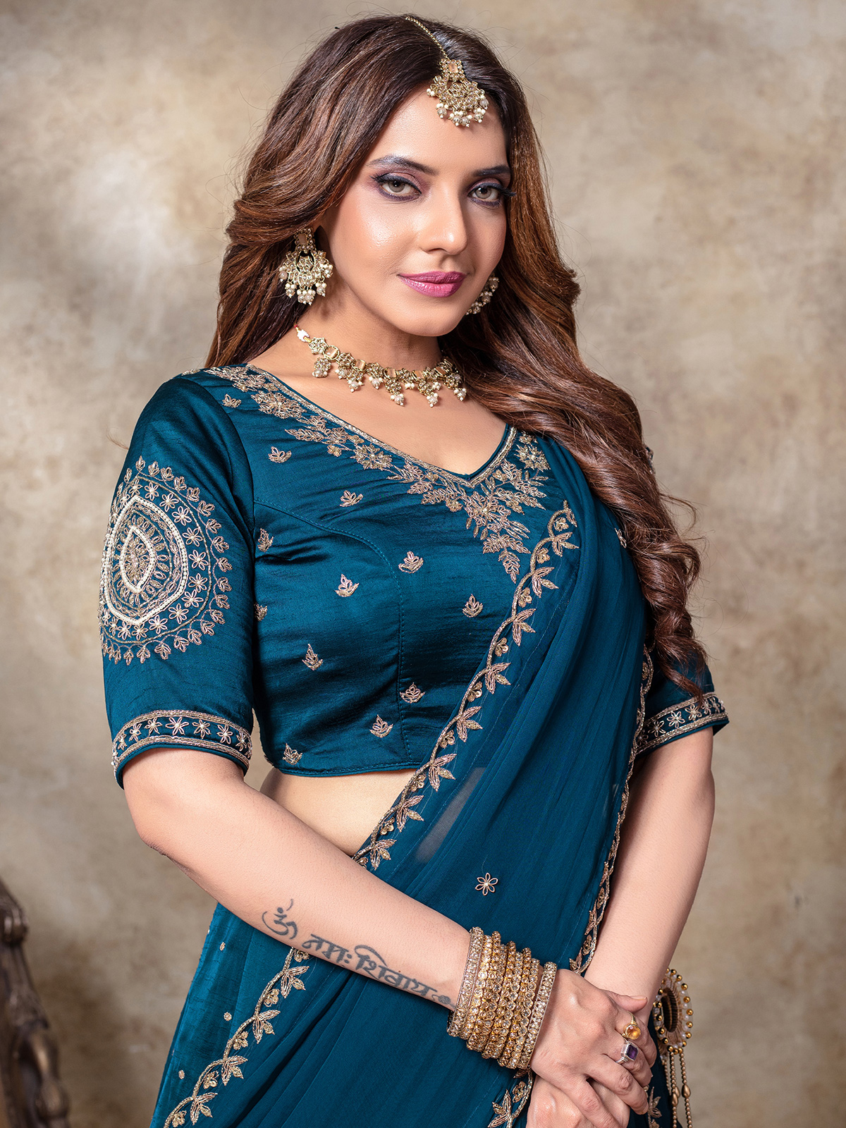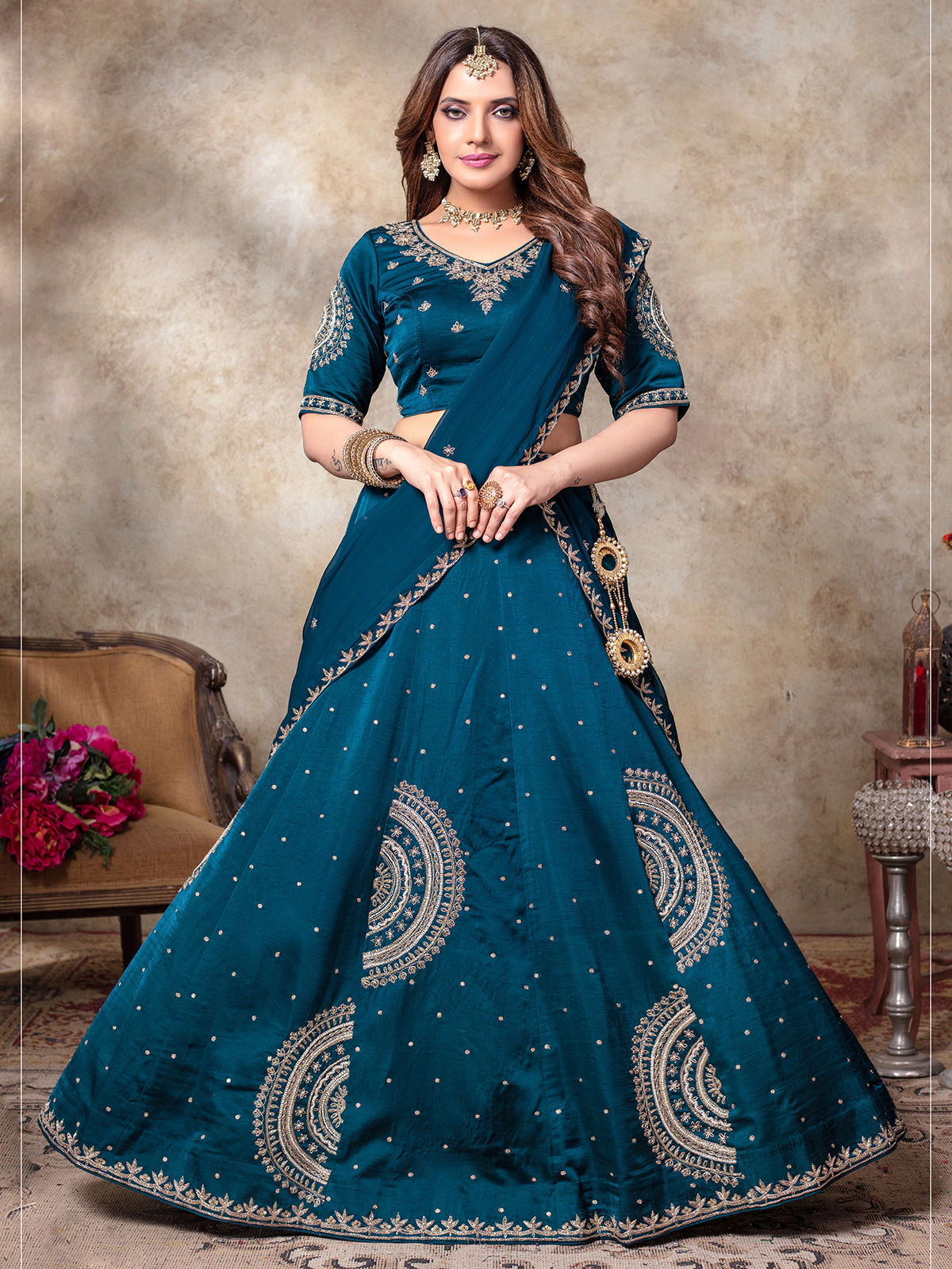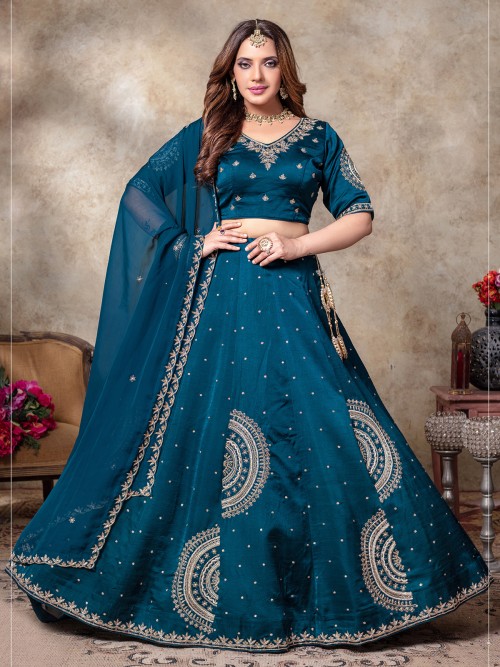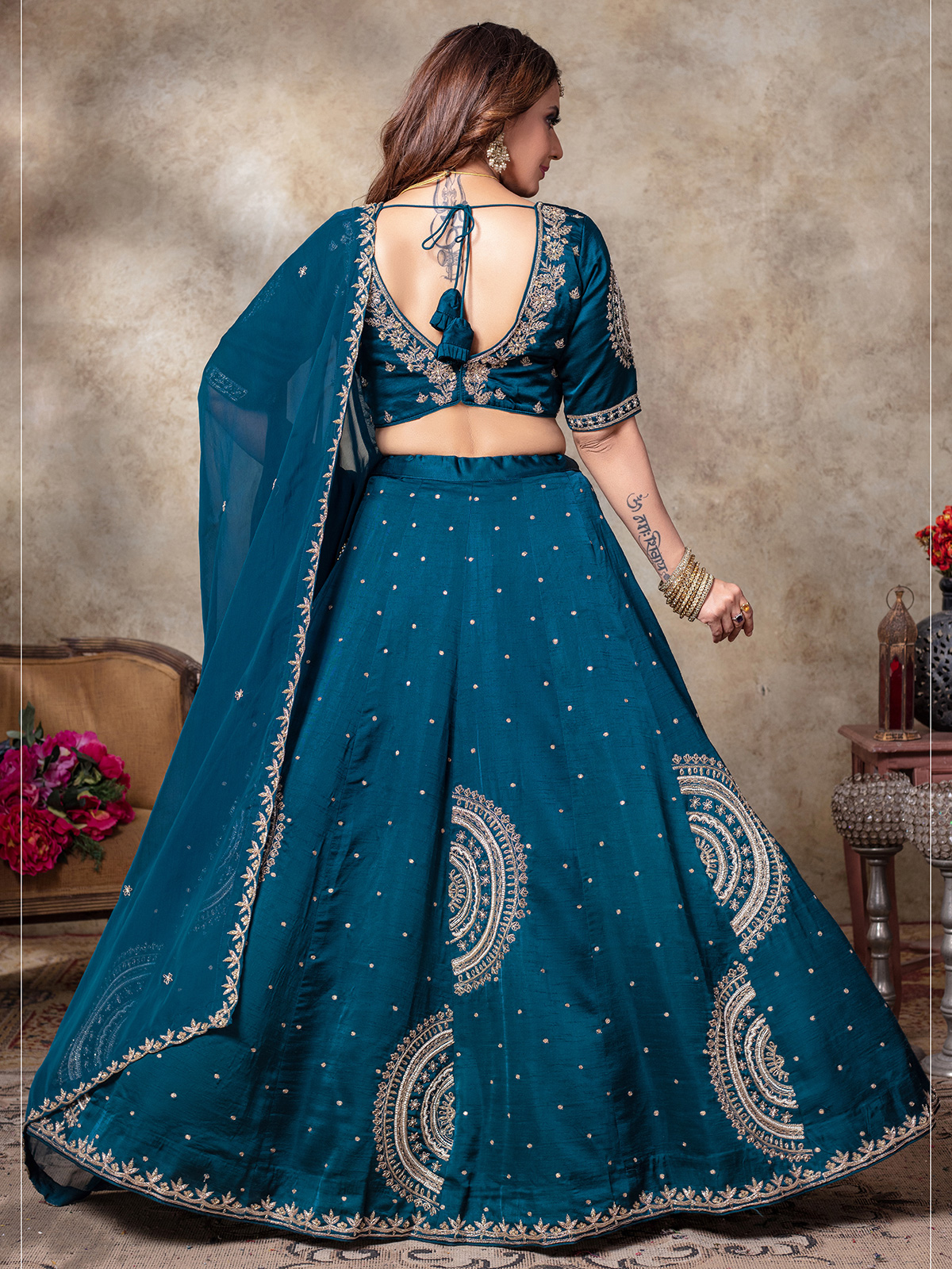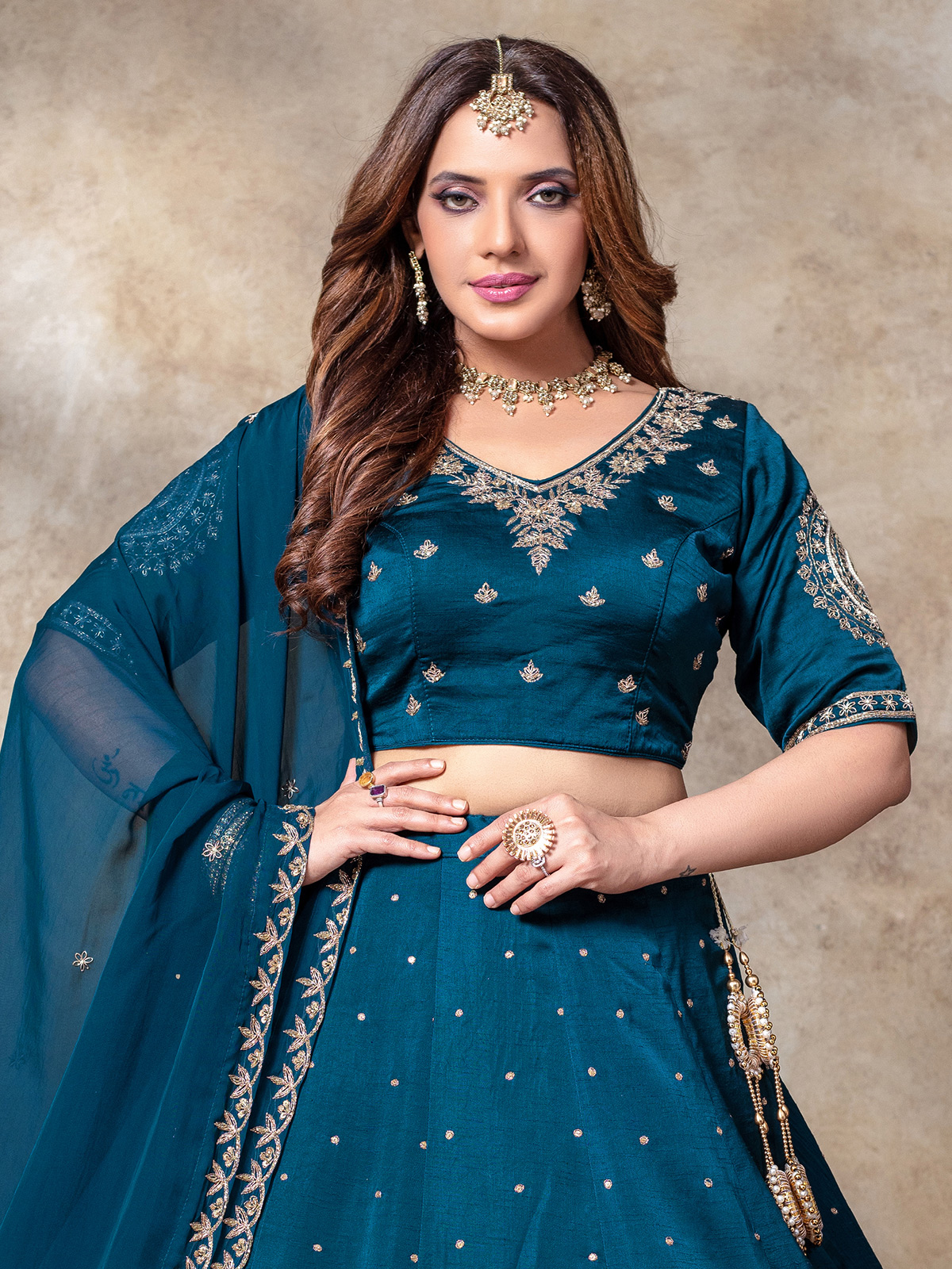 Elevate your style with this stunning Rama blue silk lehenga choli, exuding regal charm. The lehenga is beautifully adorned with delicate resham, cutdana, zardosi, sequins, and beadwork, adding intricate detail to the design. The choli features a flattering V-neckline and elbow-length sleeves, enhancing its graceful appeal. Completing the ensemble is a matching dupatta, also embellished with the same exquisite detailing, for a cohesive and elegant look.