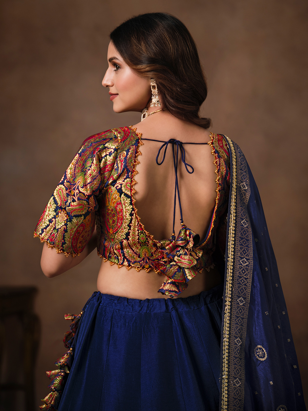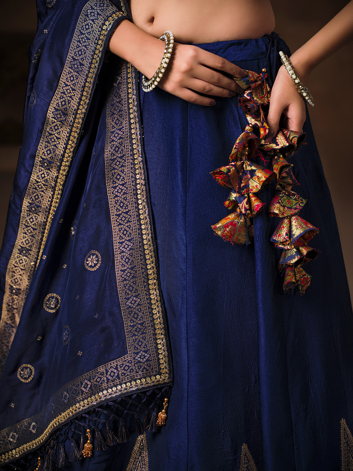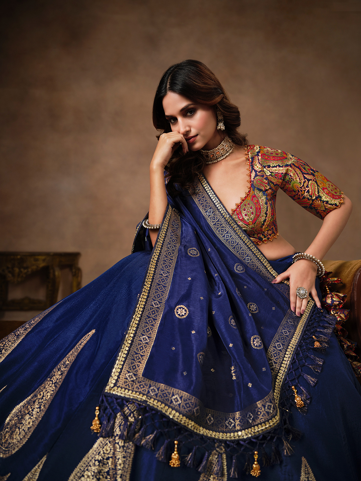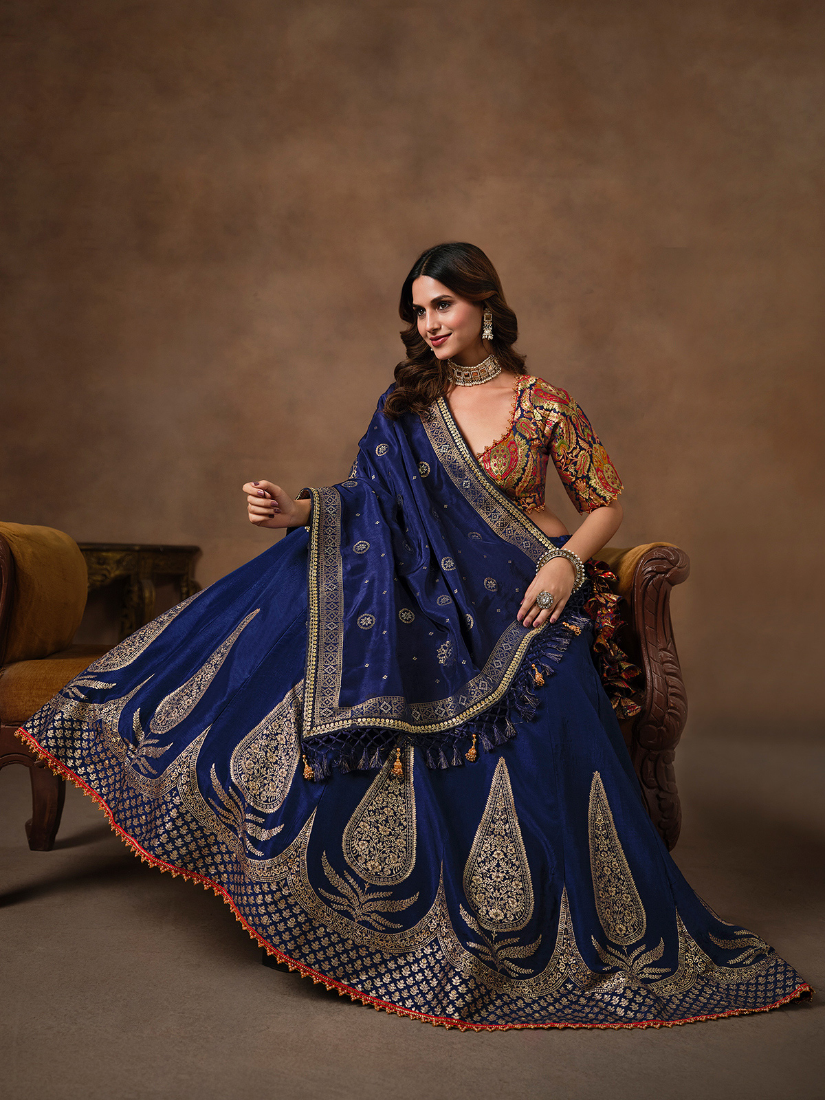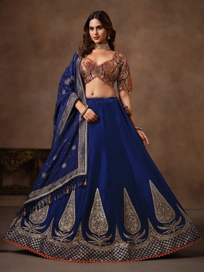 Crafted in rich royal blue crepe lehenga choli is highlighted with zari and stone detailing. The sweetheart neckline with elbow sleeves adds elegance, while the coordinated dupatta completes a sophisticated look suitable for weddings, receptions and evening sangeet celebrations.