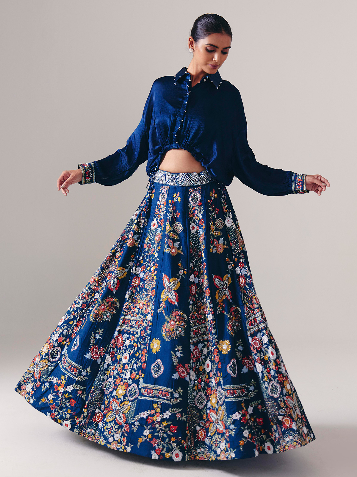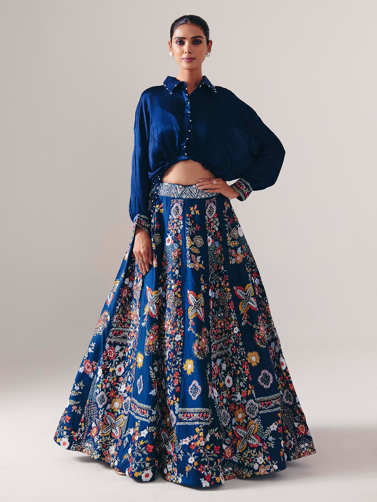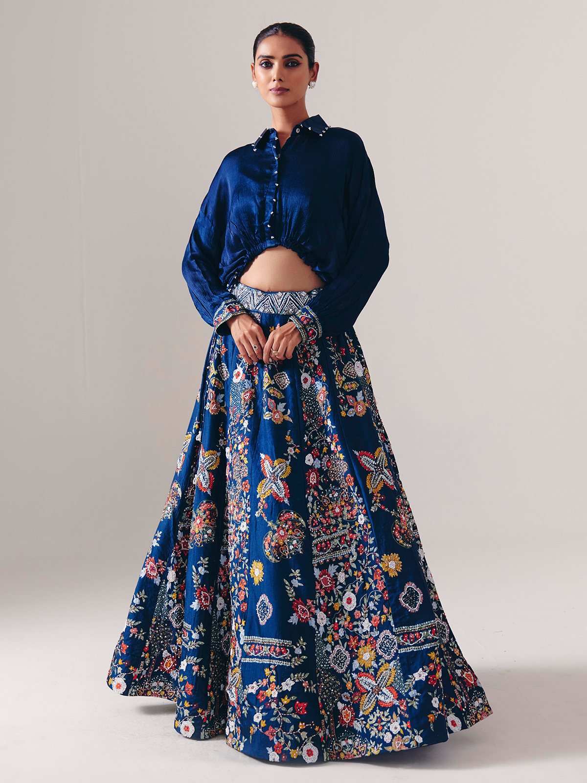 Step into elegance with this royal blue silk designer lehenga choli, adorned with shimmering cutdana, beads, sequins, and stones. The collar neckline and full sleeves add regal sophistication, making it a flawless pick for weddings, cultural celebrations, and festive gatherings.
