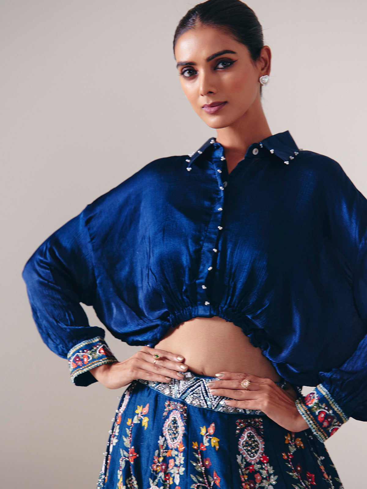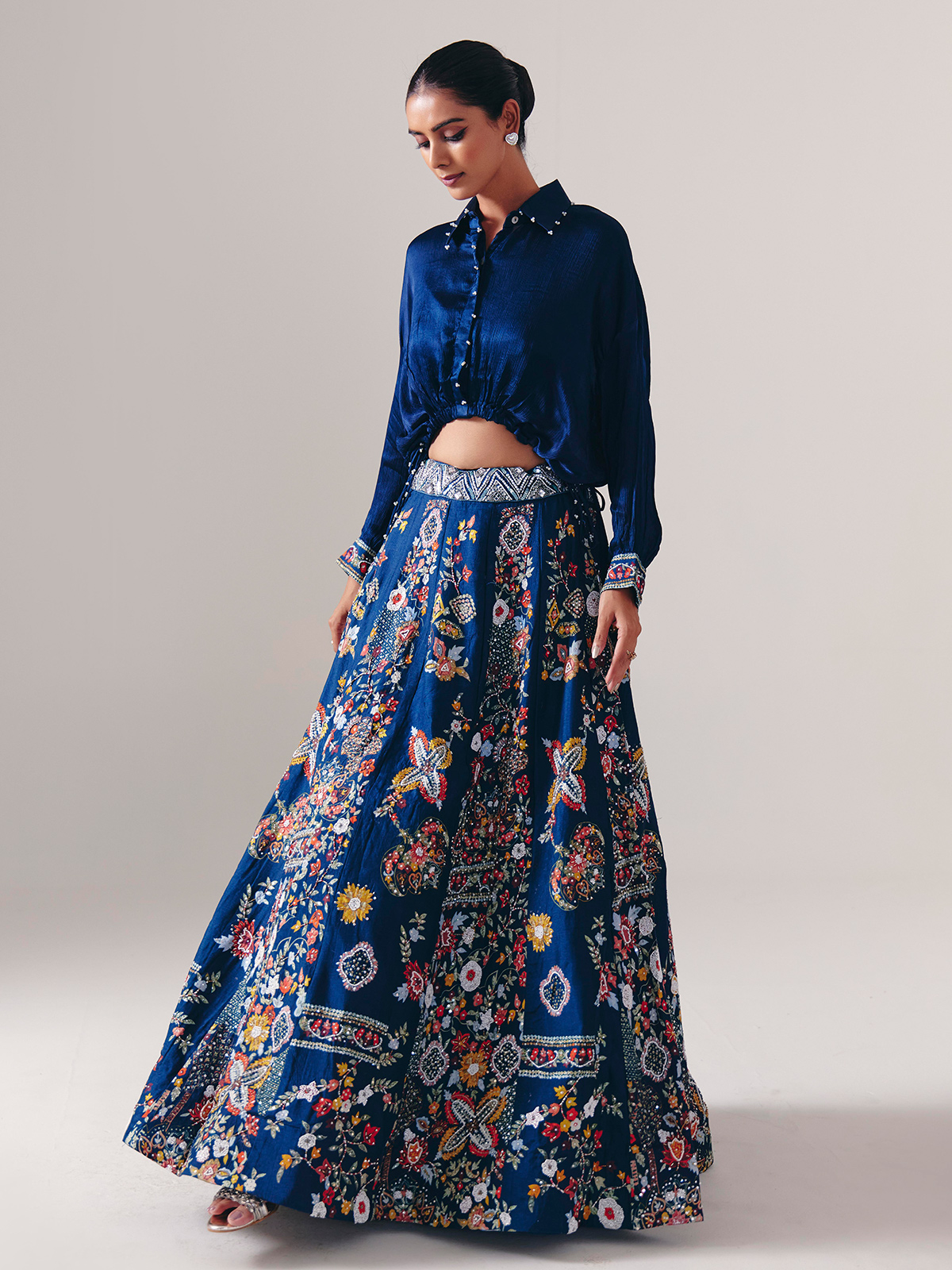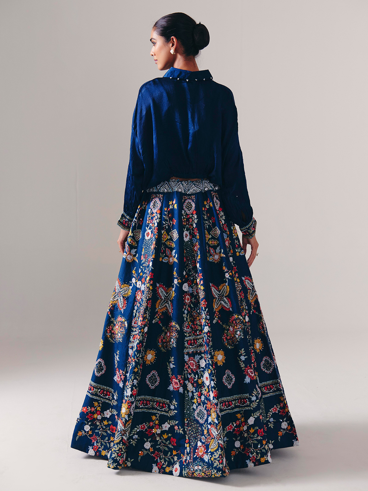 Step into elegance with this royal blue silk designer lehenga choli, adorned with shimmering cutdana, beads, sequins, and stones. The collar neckline and full sleeves add regal sophistication, making it a flawless pick for weddings, cultural celebrations, and festive gatherings.
