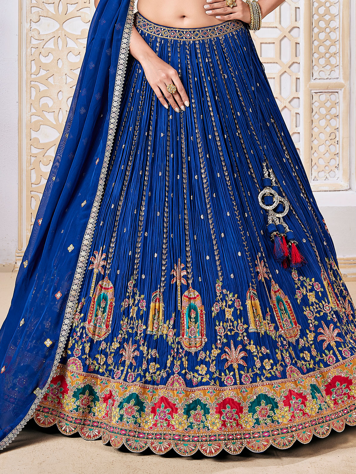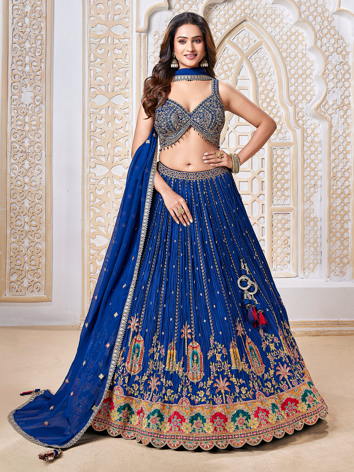 This royal blue silk lehenga choli is adorned with resham embroidery, sequins, aabla, cutdana, thread, and diamond detailing. Styled with a sweetheart neckline and sleeveless cut, it comes with a dupatta, making it ideal for weddings, sangeet nights, and receptions.