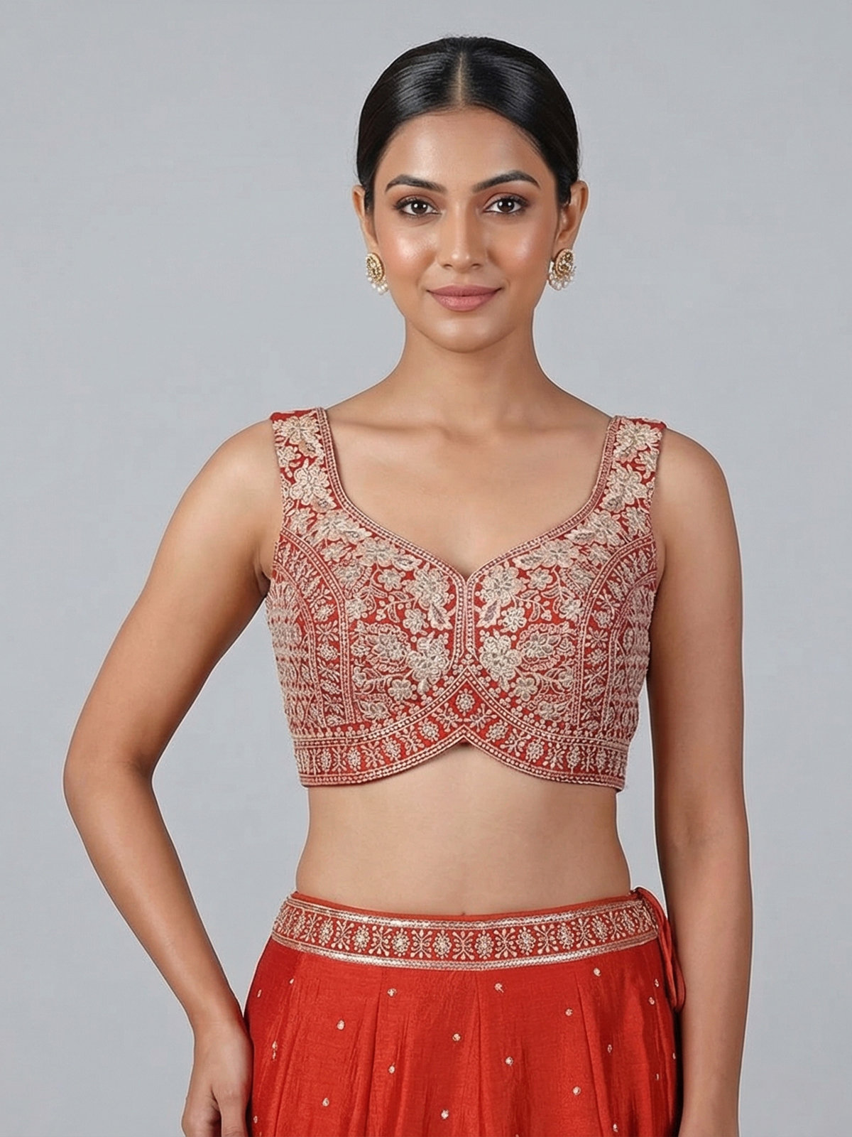 Glow with warm elegance in this radiant rust orange silk lehenga choli designed for festive charm. The sleeveless sweetheart neckline choli is enhanced with delicate embroidery and sequins for subtle sparkle. Paired with a flowing lehenga and dupatta, it creates a graceful festive silhouette.