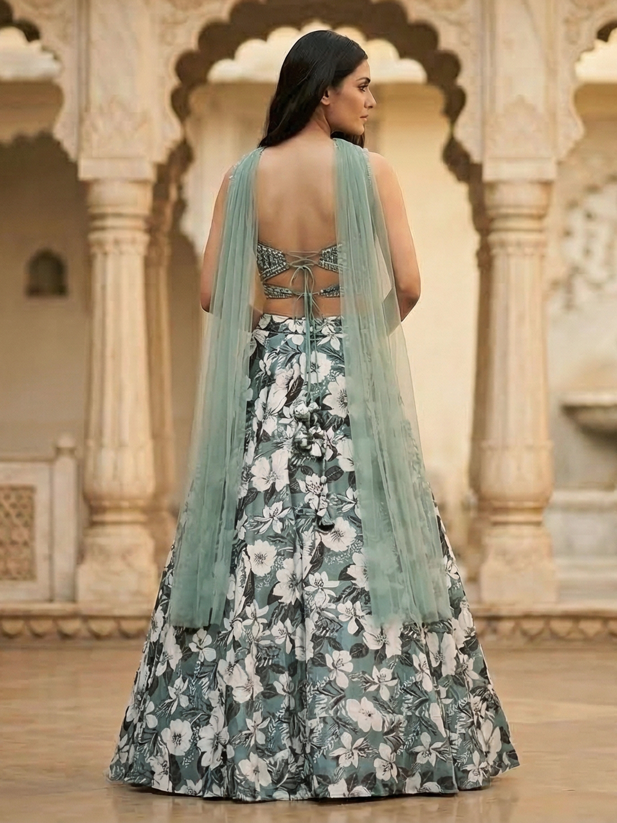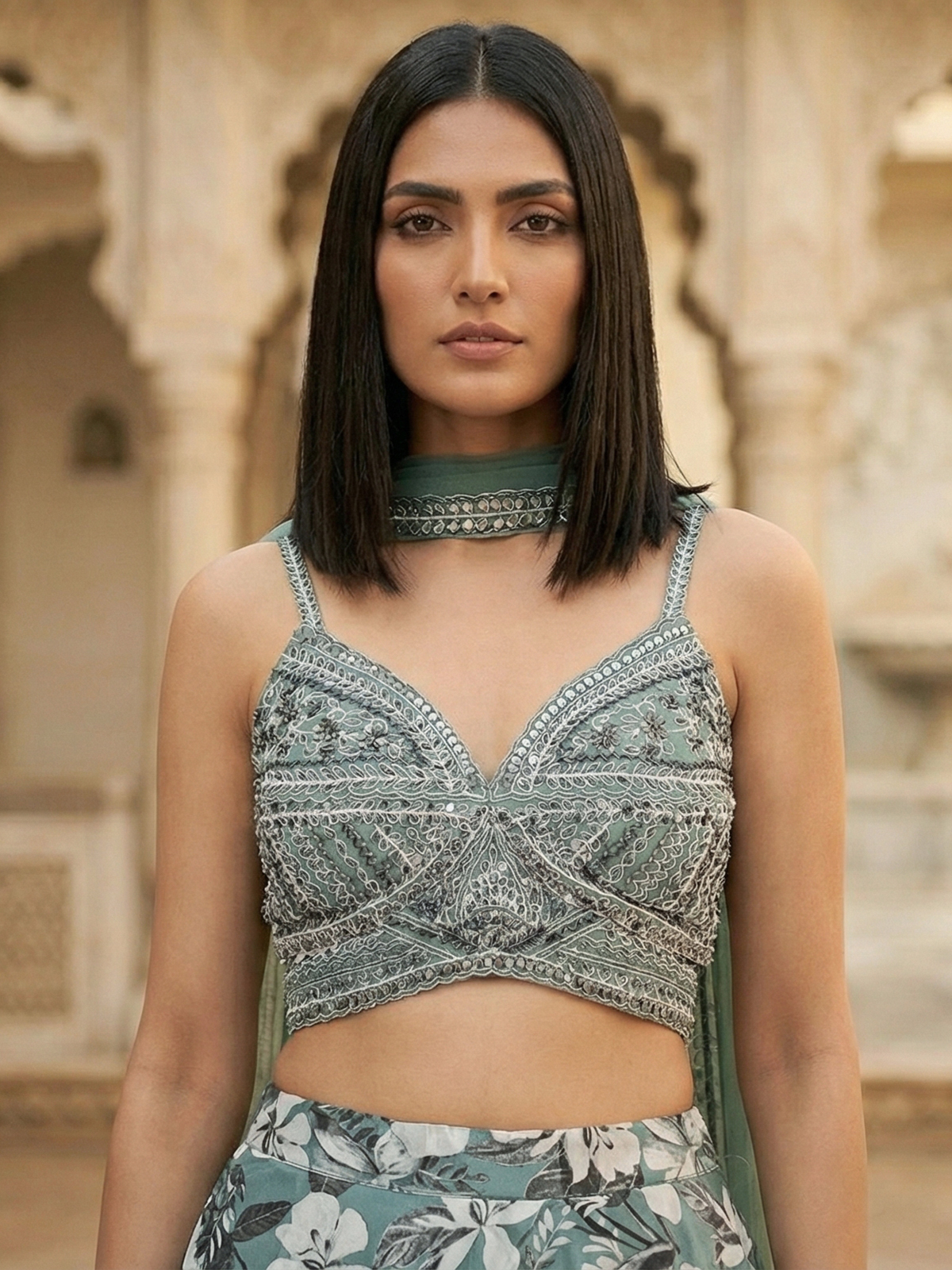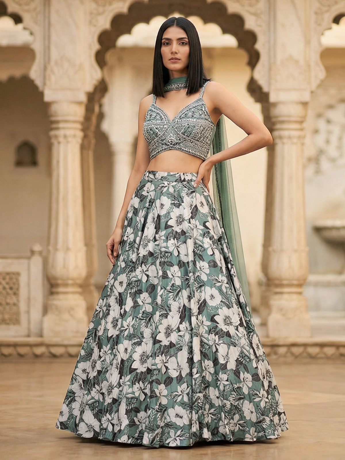Graceful and enchanting sage green silk lehenga choli blooms with delicate floral prints and intricate craftsmanship. Adorned with zardosi, mirror, cutdana, sequins and pearl embellishments. It radiates festive elegance. The sleeveless choli with a sweetheart neckline adds a romantic charm. While the flowing lehenga and dupatta complete a dreamy silhouette. Perfect for weddings, receptions and sangeet celebrations.
