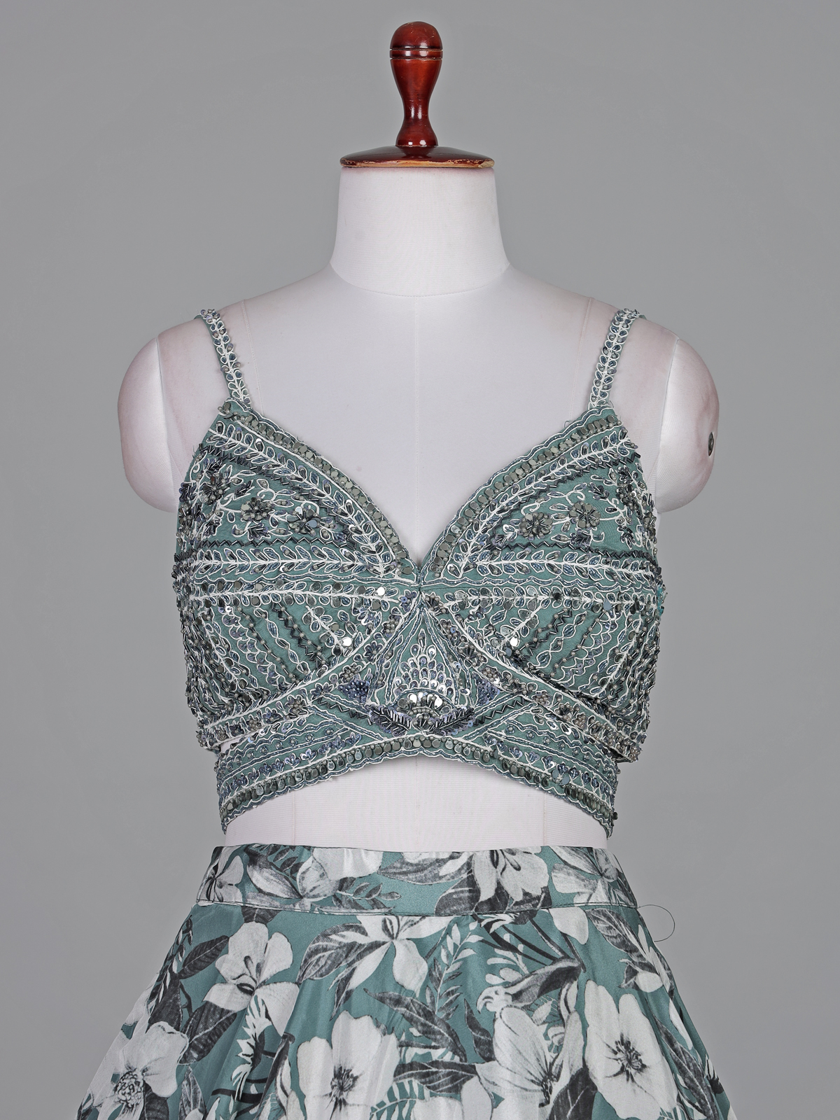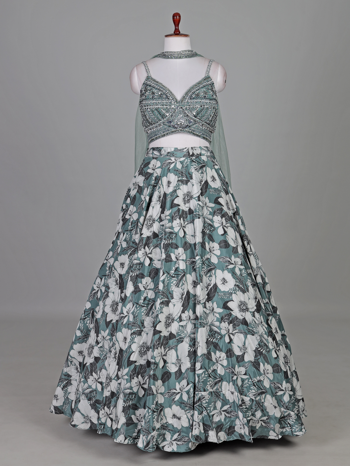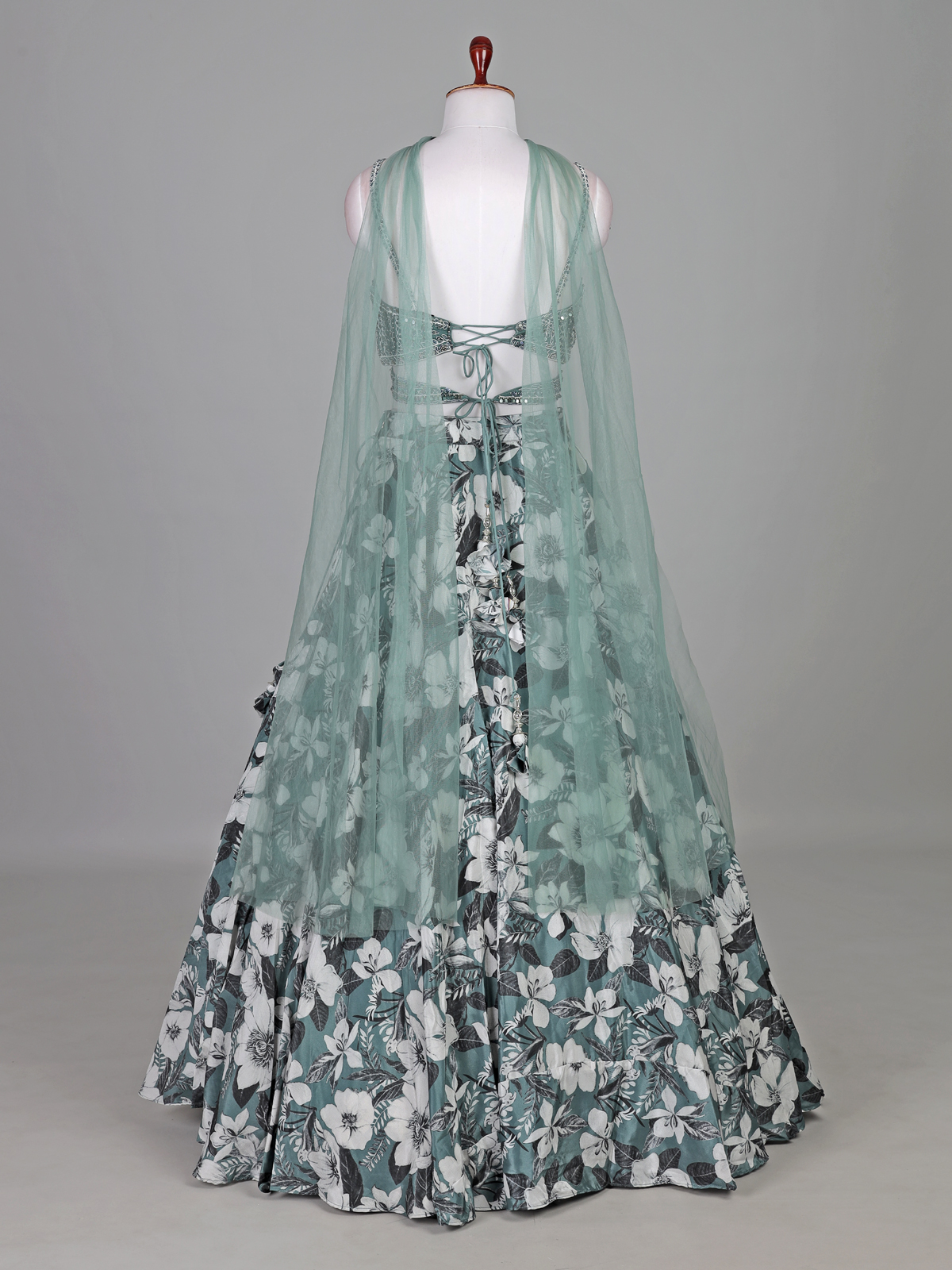 Sage Green Silk Floral Zardosi Mirror Lehenga Choli