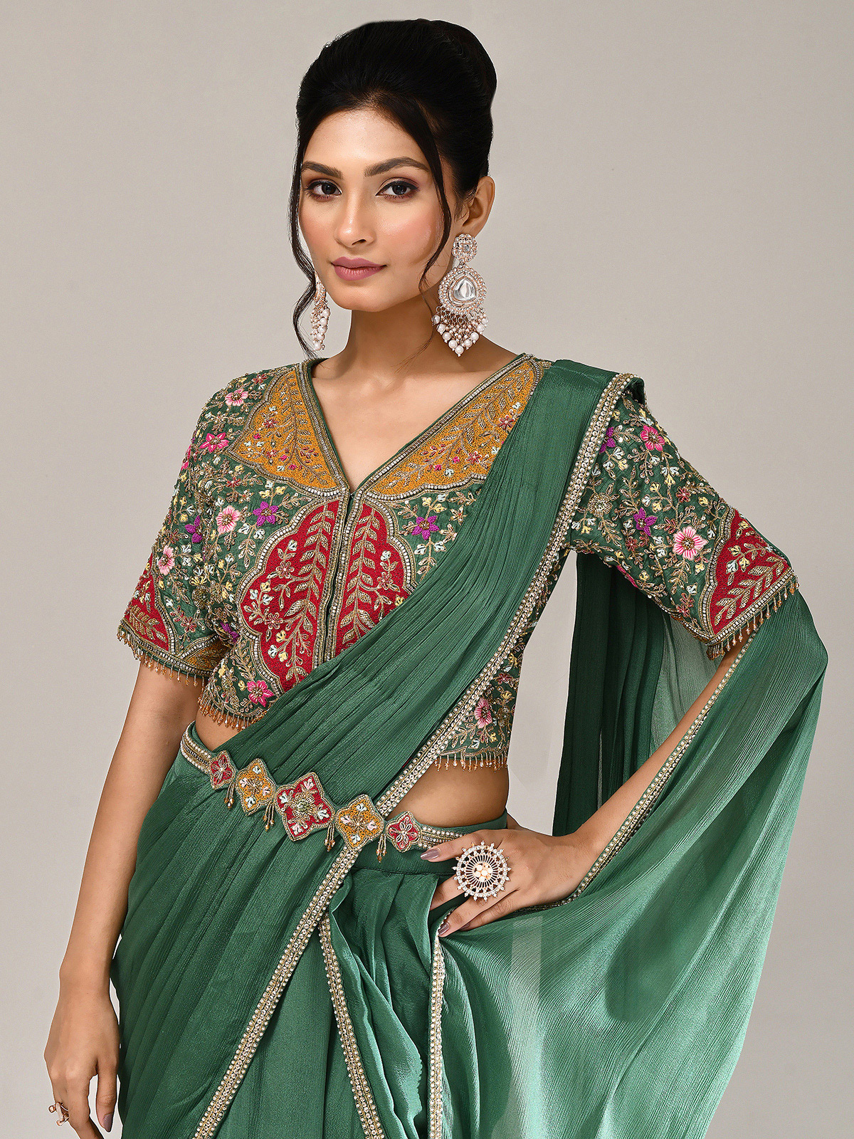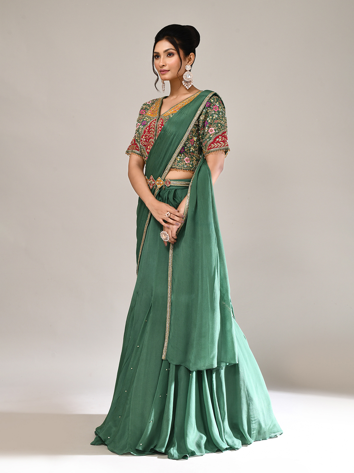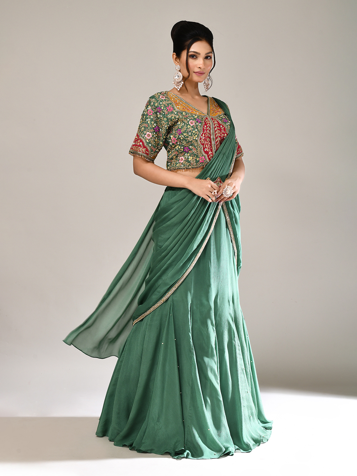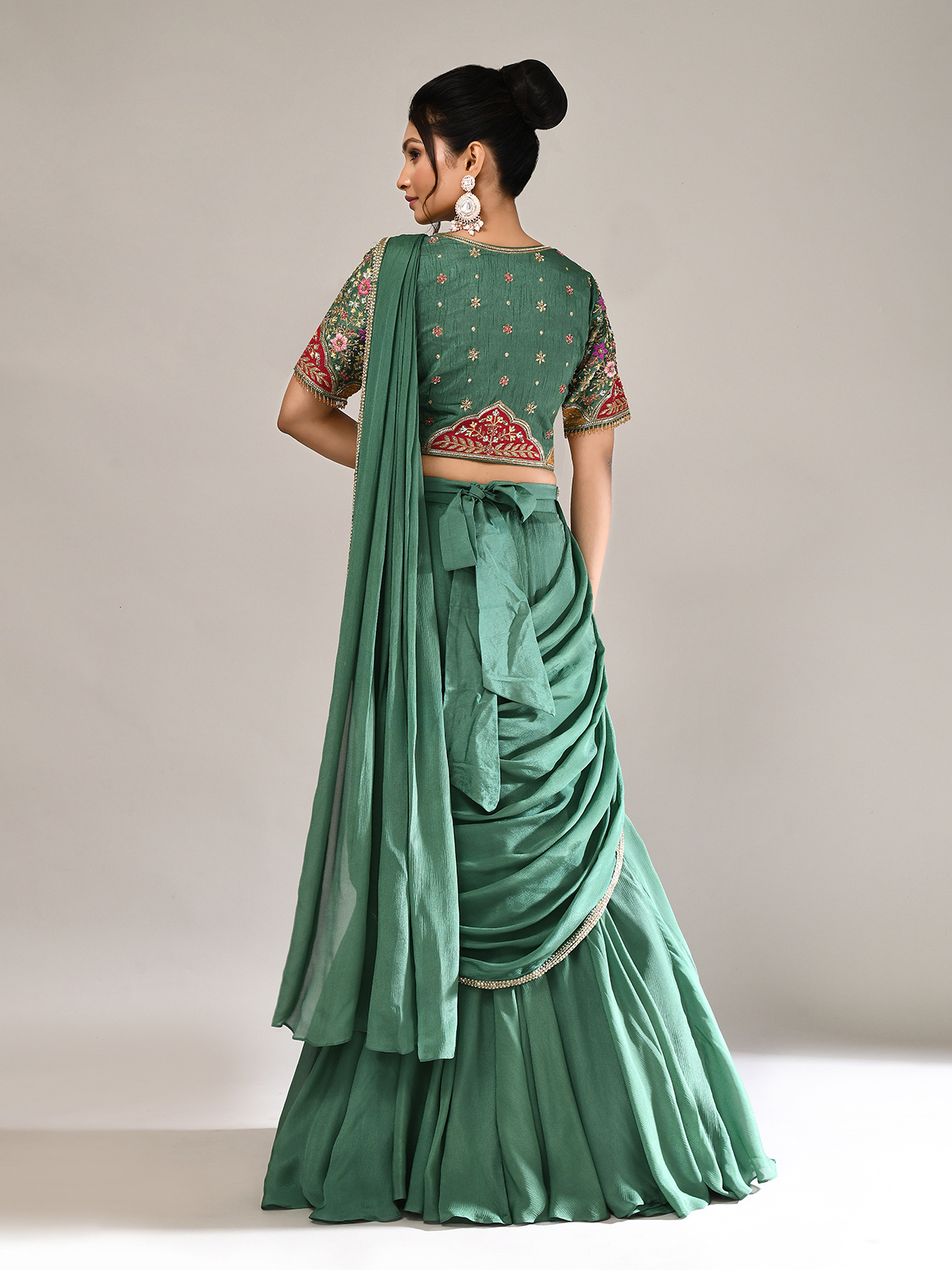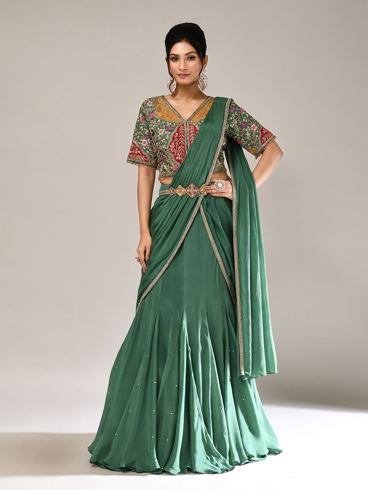 Bask in joyous glow with this sea green chiffon georgette lehenga choli. Richly adorned with zardosi, sequins, mirror, pearls, beads, thread, and cutdana, it comes with a V-neckline, elbow sleeves, and attached dupatta. Perfect for mehendi and weddings, radiating festive vibrance.