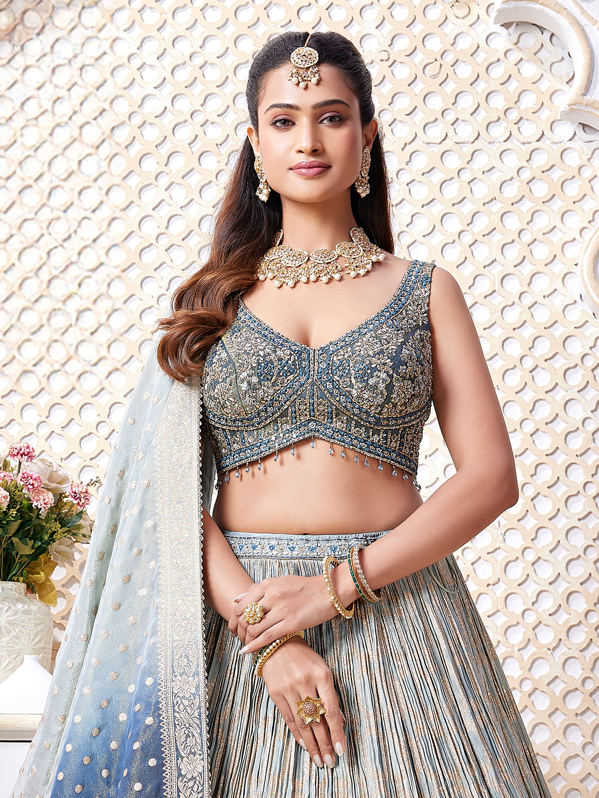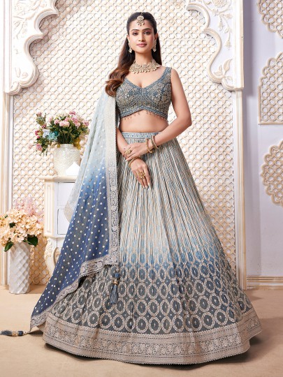 Styled in shaded blue silk lehenga choli. Features aabla, cutdana, sequins and diamond embellishments for a festive glow. Designed with a sweetheart neckline and sleeveless pattern, it is paired with a dupatta, ideal for weddings, receptions and sangeet functions.