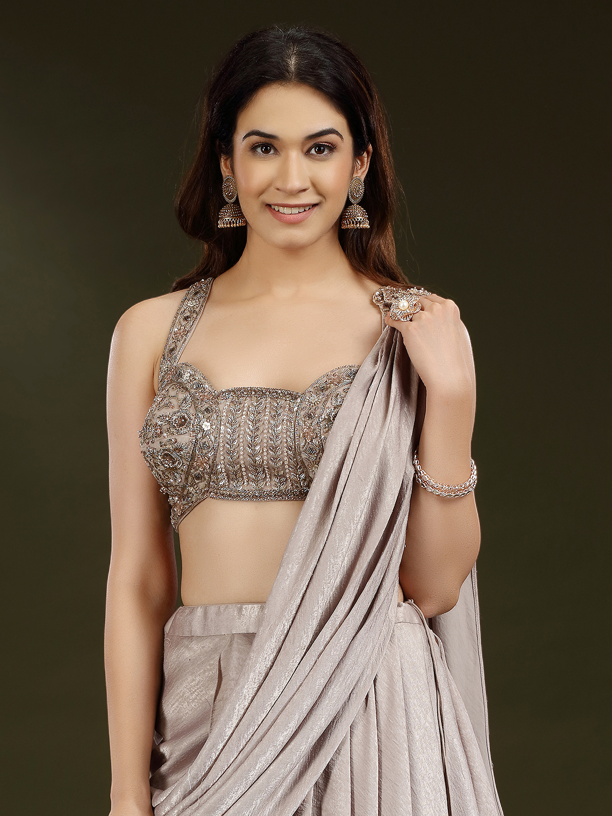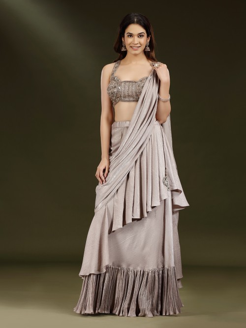 This silver-grey satin silk lehenga choli shimmers with zardosi, sequins, beads, and cutdana. The sleeveless silhouette paired with an attached dupatta creates refined elegance. Rich in detail and shine, it’s ideal for weddings, receptions, or grand festive celebrations, leaving a dazzling, statement-making impression.