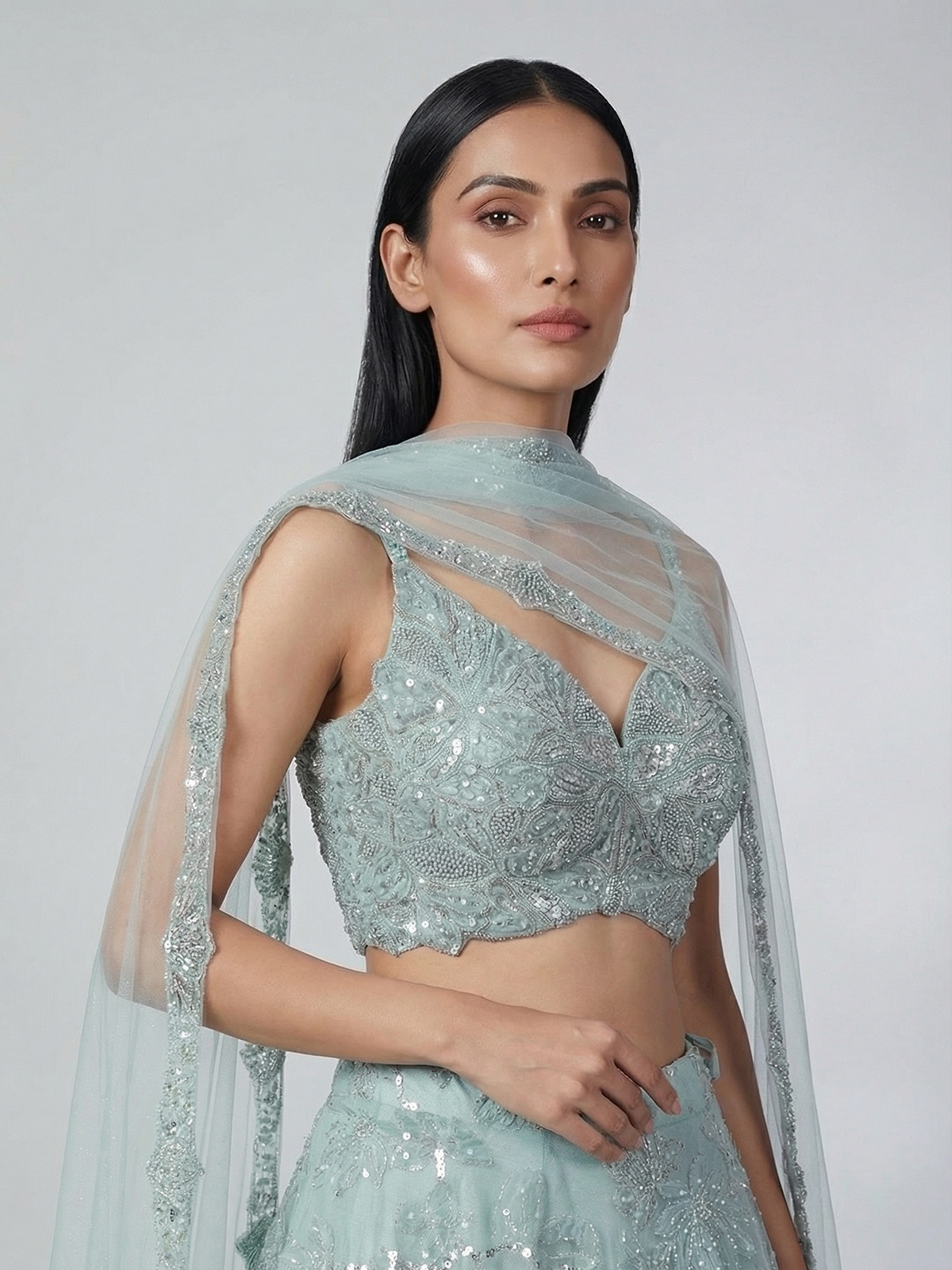 Step into celebration with this stunning sky blue net lehenga choli that exudes soft feminine charm. Embellished with sequins, beads, cutdana, and pearl detailing, it offers refined sparkle. Paired with a sleeveless sweetheart blouse and a stylish choker dupatta, it is ideal for weddings, sangeet nights, and festive receptions.