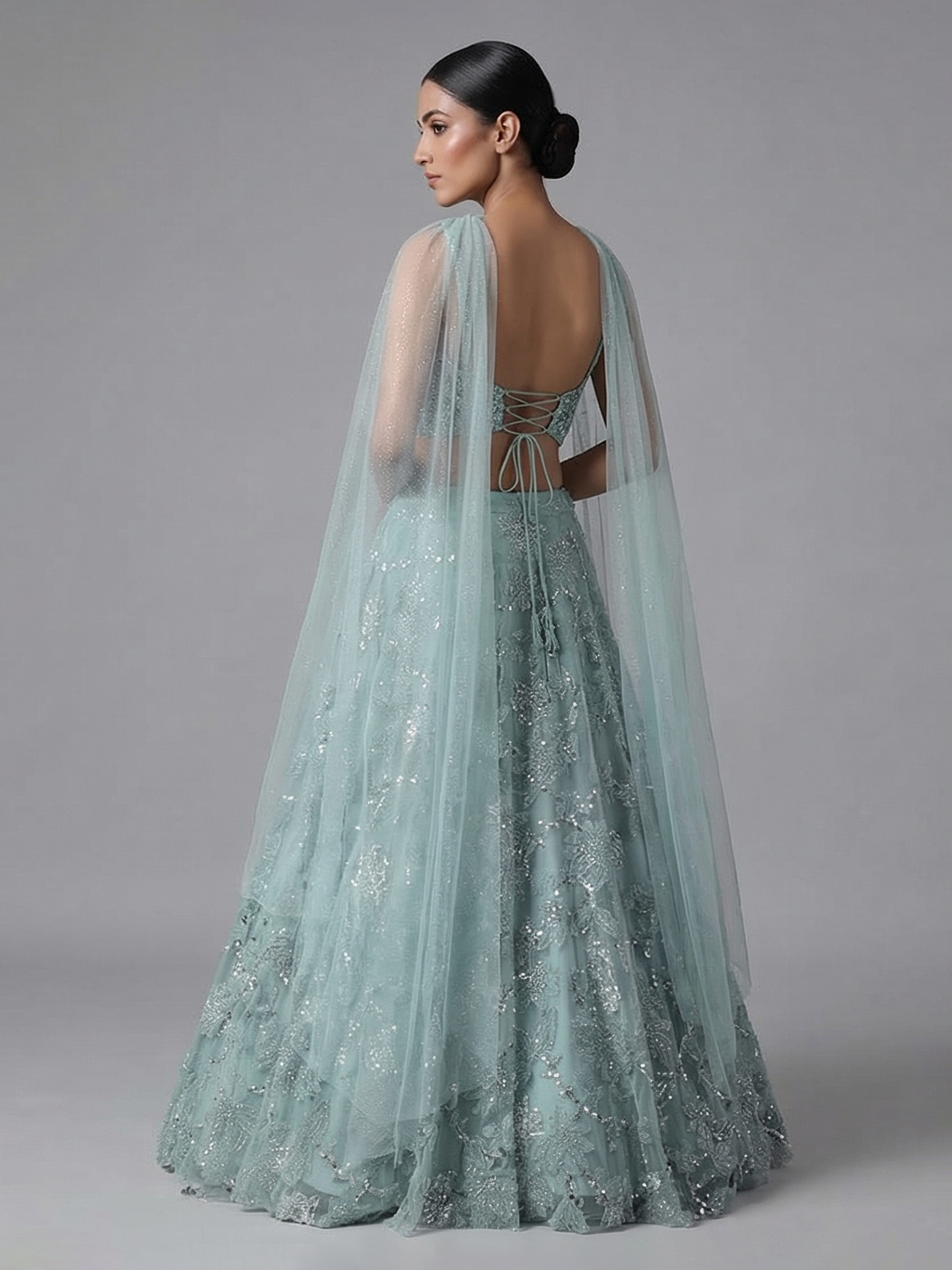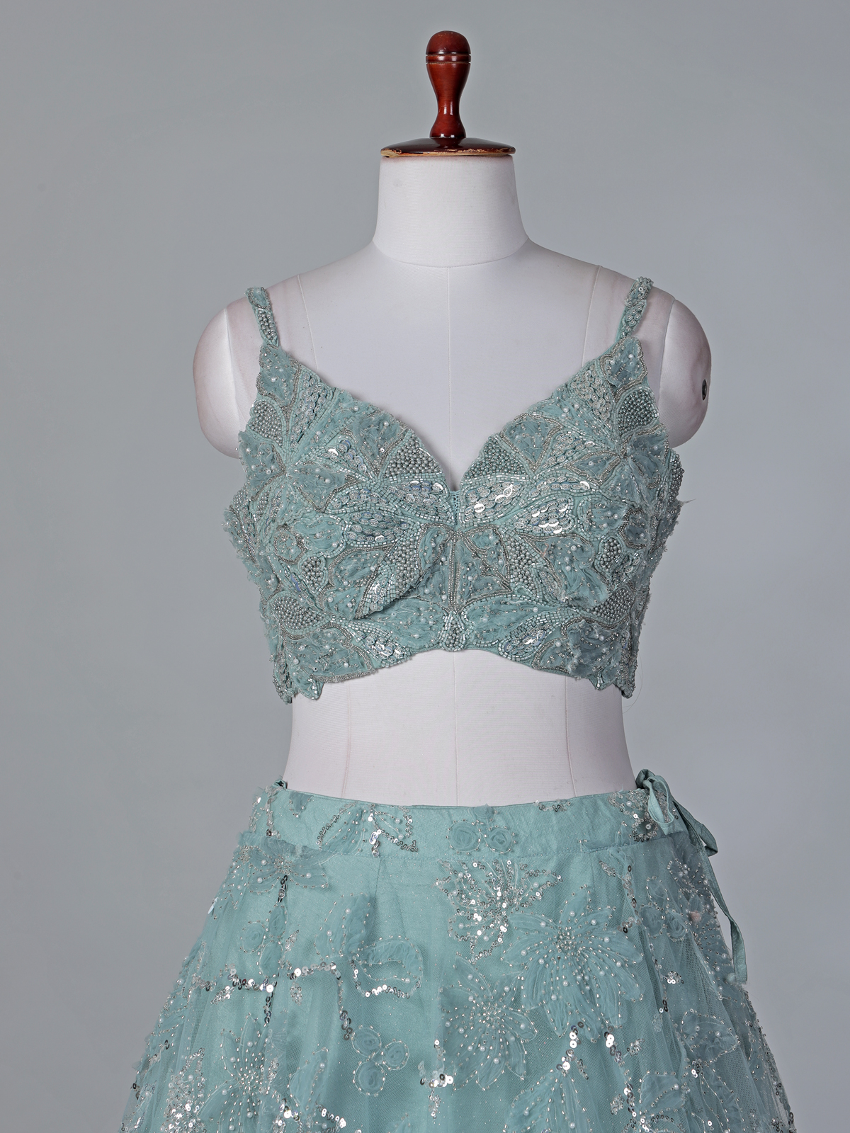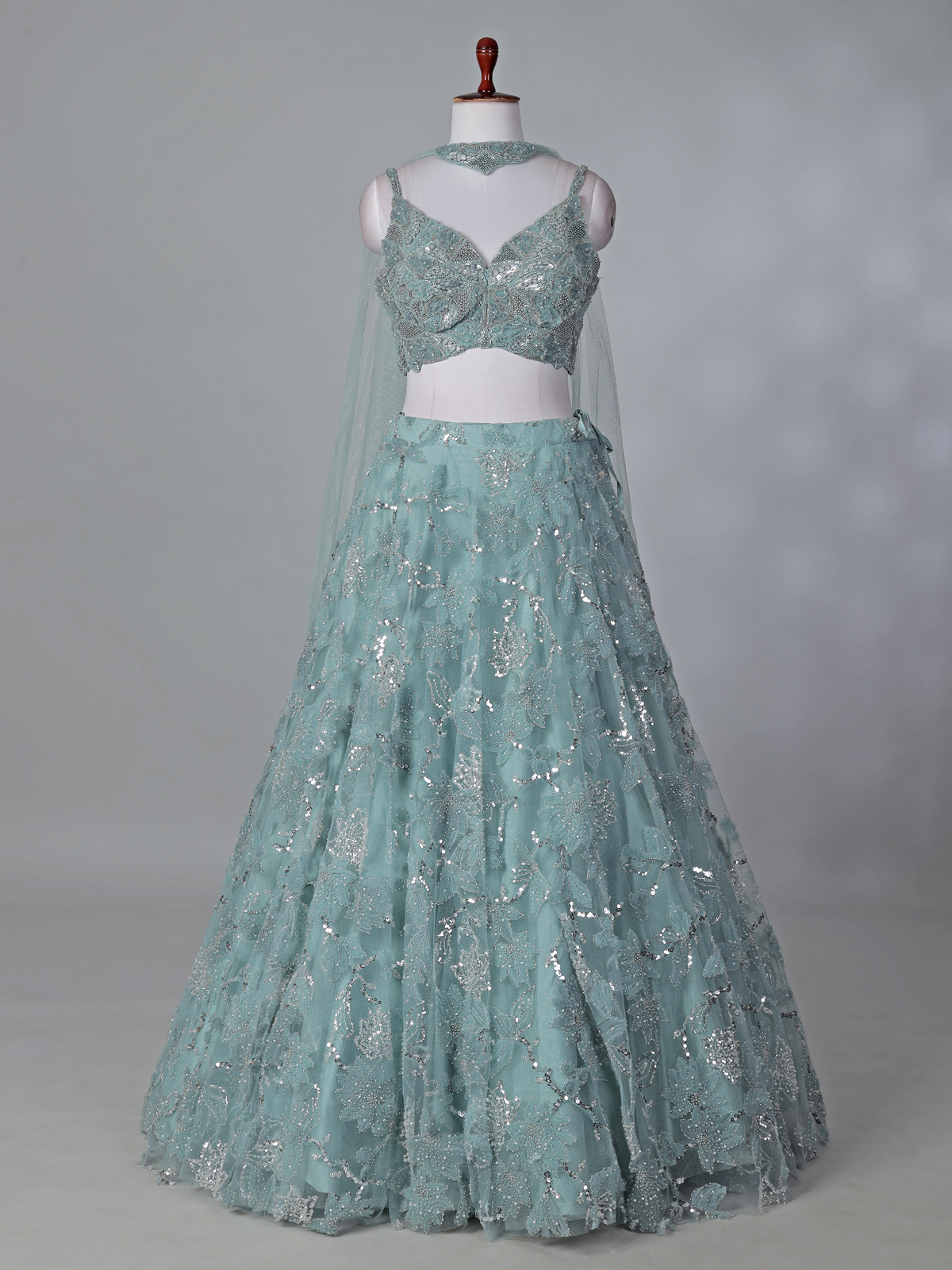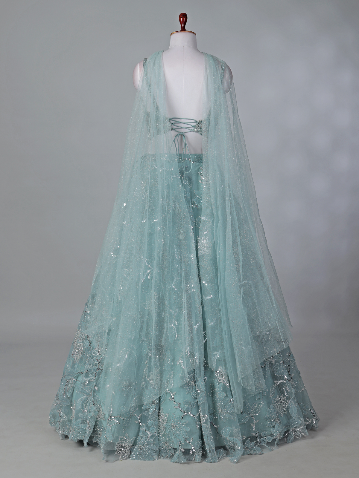 Sky Blue Net Lehenga Choli With Heavy Embellishments