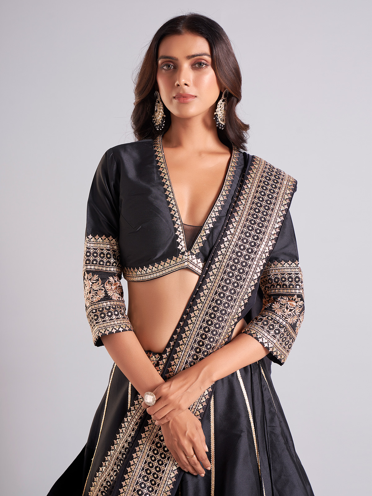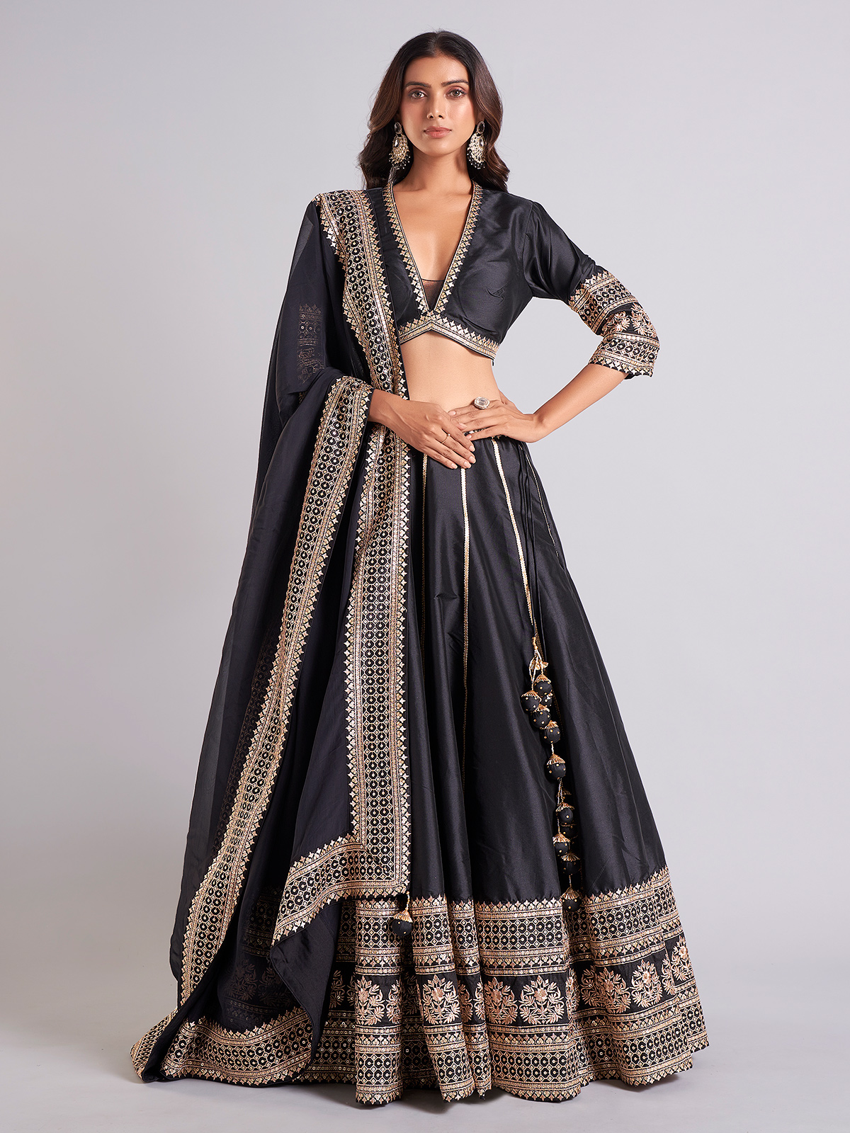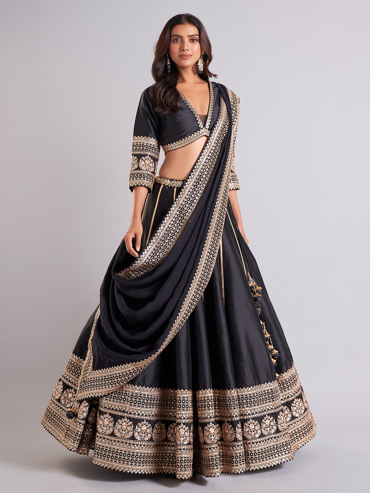 This black silk lehenga choli is a timeless piece, adorned with resham, sequins, and gota work. Paired with a dupatta, it’s a classic choice for any occasion.