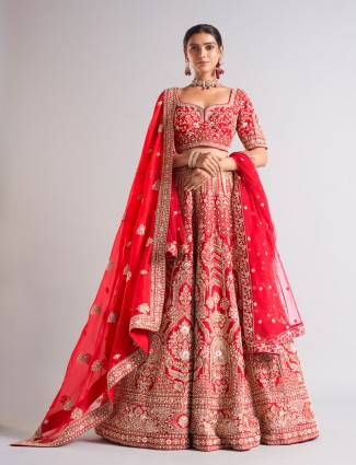 Experience sophistication with our red raw silk designer lehenga choli, embellished with intricate cutdana, sequins, resham, zardosi, thread, and bead detailing. The choli showcases a stylish elbow-sleeved silhouette and comes with a chic dupatta.