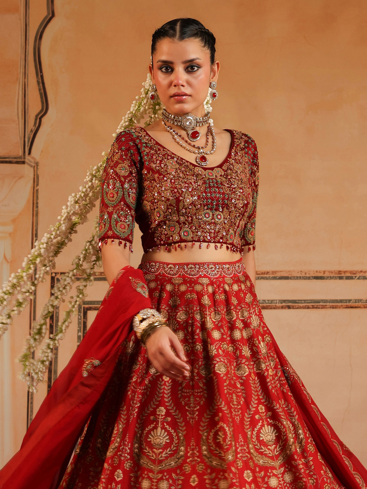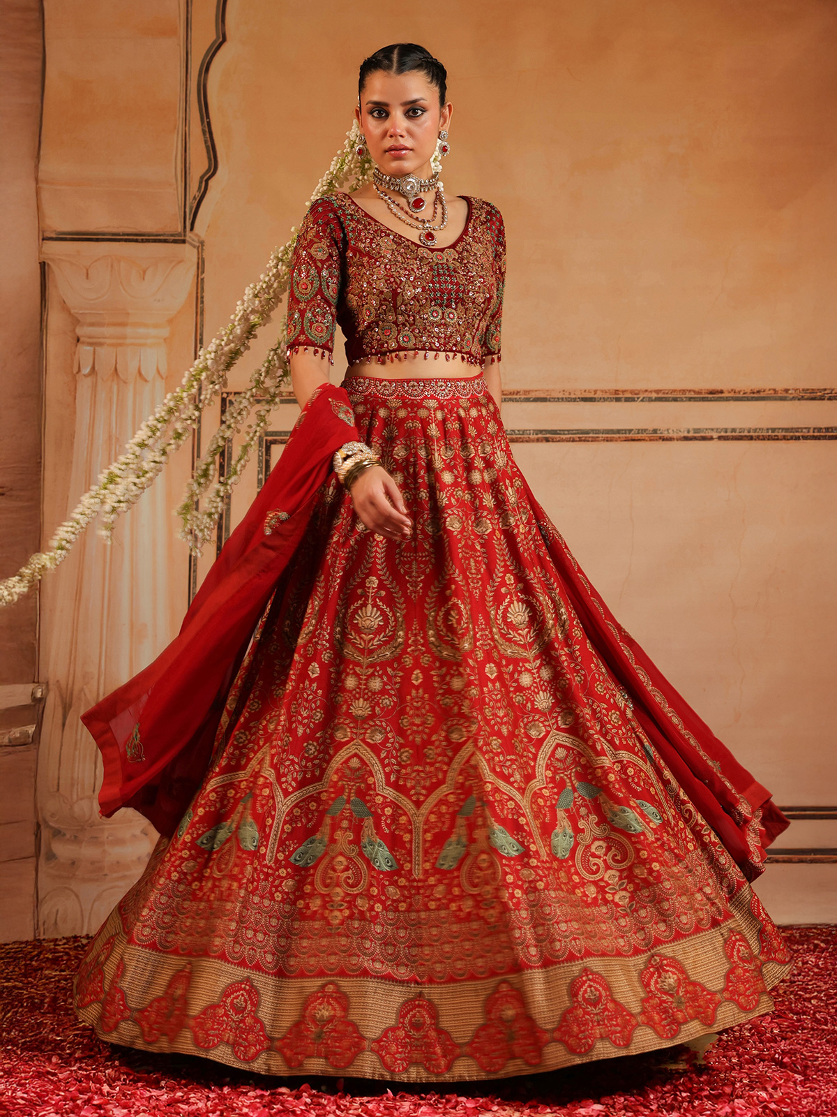 Radiant in bridal red, this silk printed lehenga choli features a round neckline and elbow sleeve choli with dupatta. Thread, sequins, cutdana, and beads weave a regal pattern. Perfect for weddings, it embodies traditional grandeur and celebratory elegance.